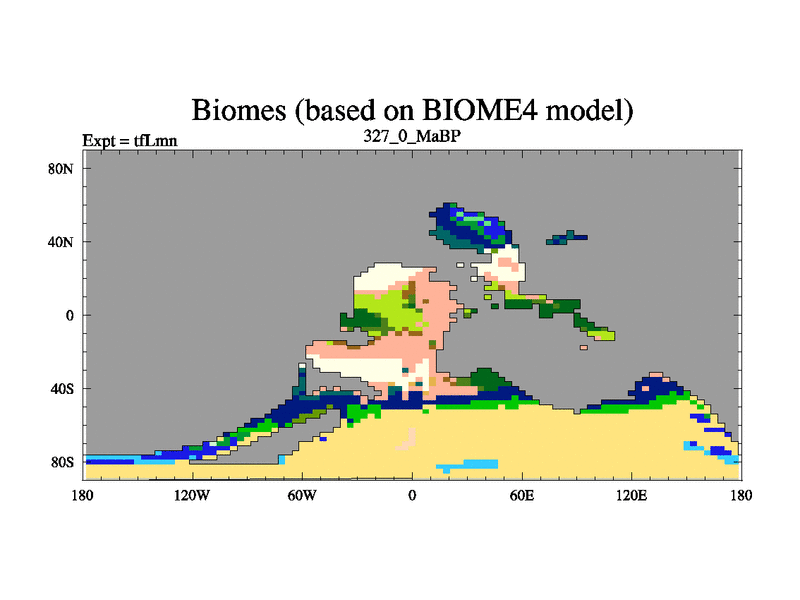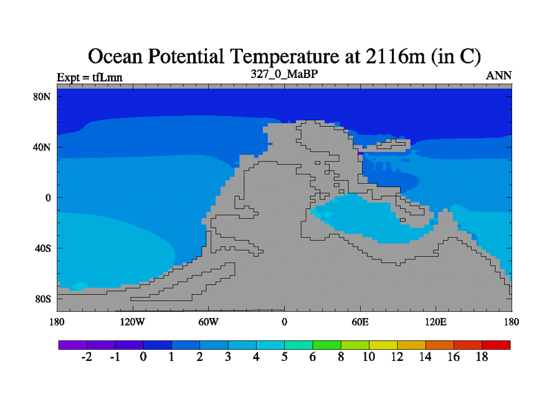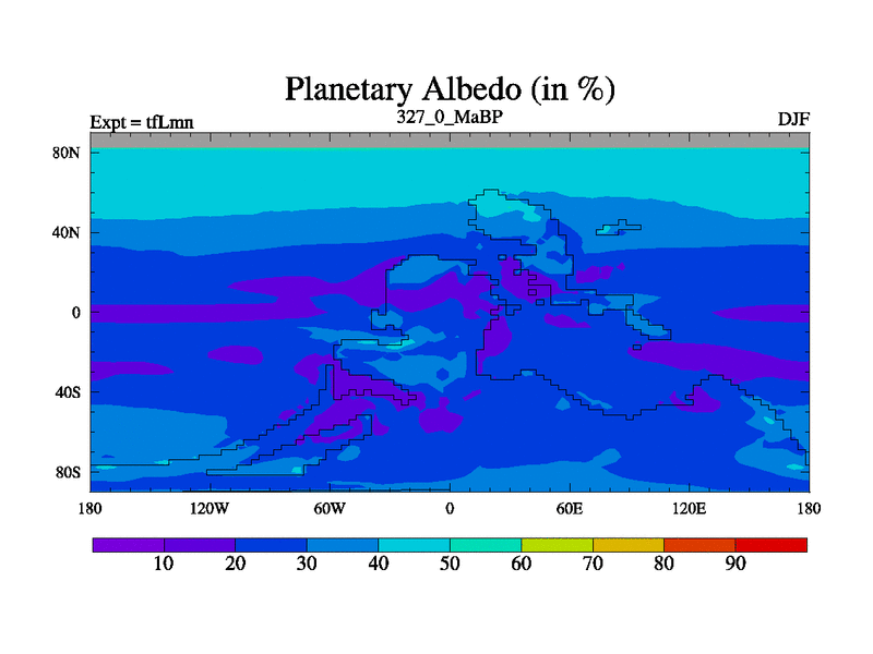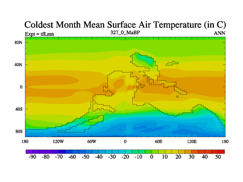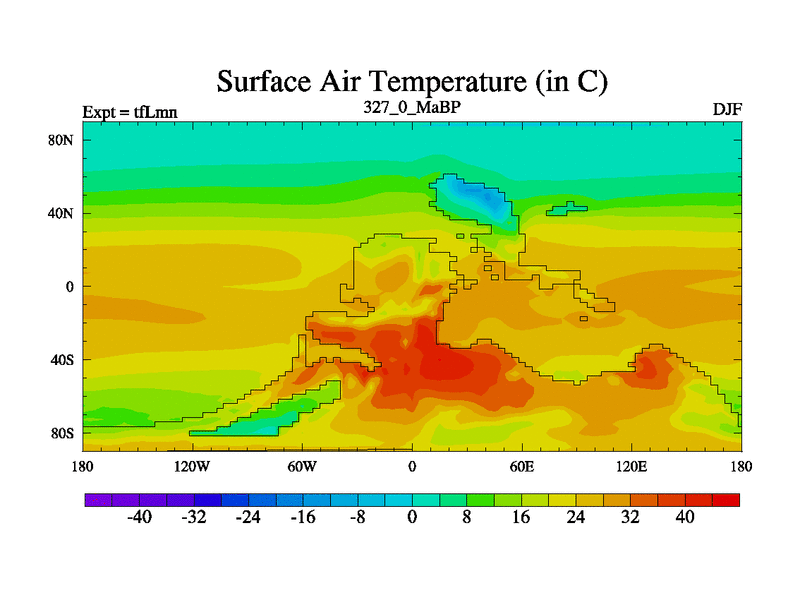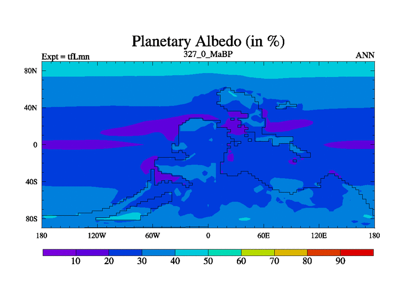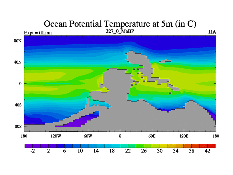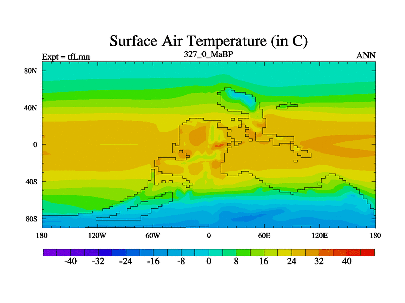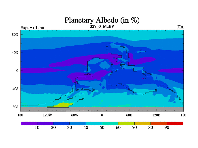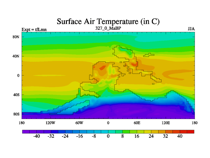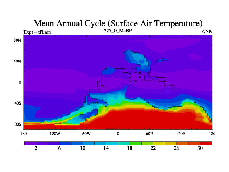 This is the 327.0 Ma simulation using the Scotese palaeogeographies and revised CCN etc. This version has islands and smoothing and desert albedo included. Tuned CO2 to give Scotese temperatures. Started from end of tfKsn. With JEDI output.