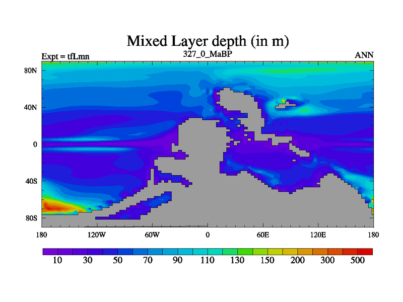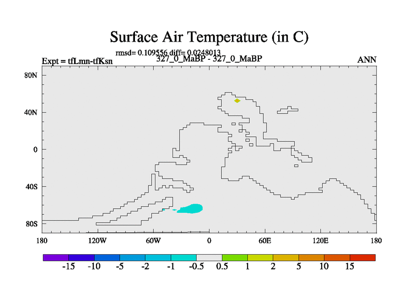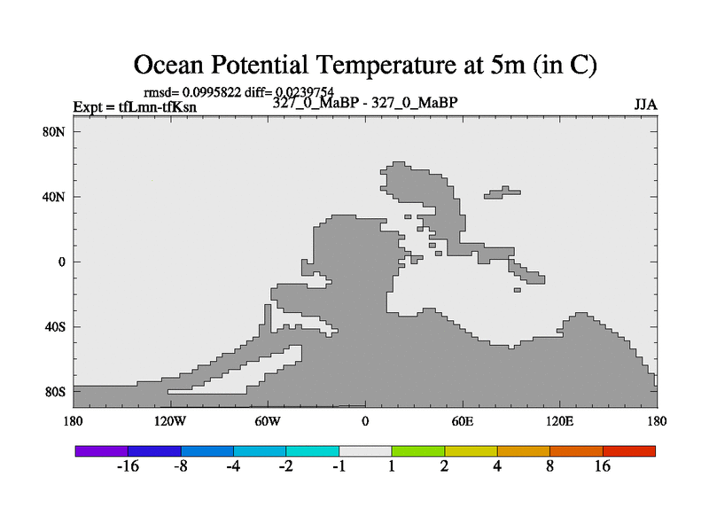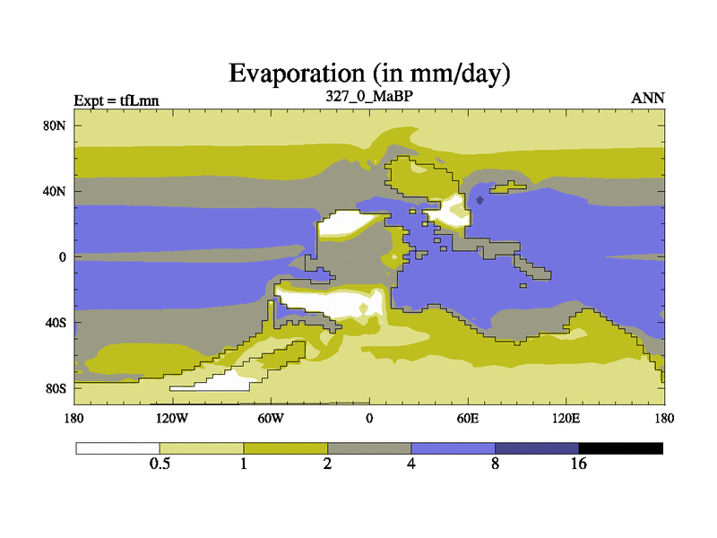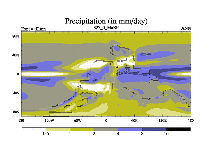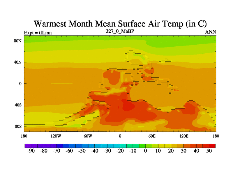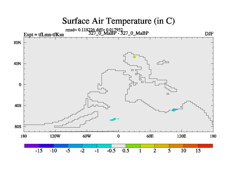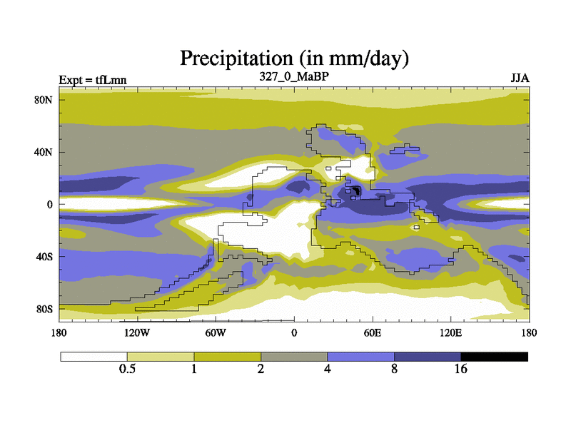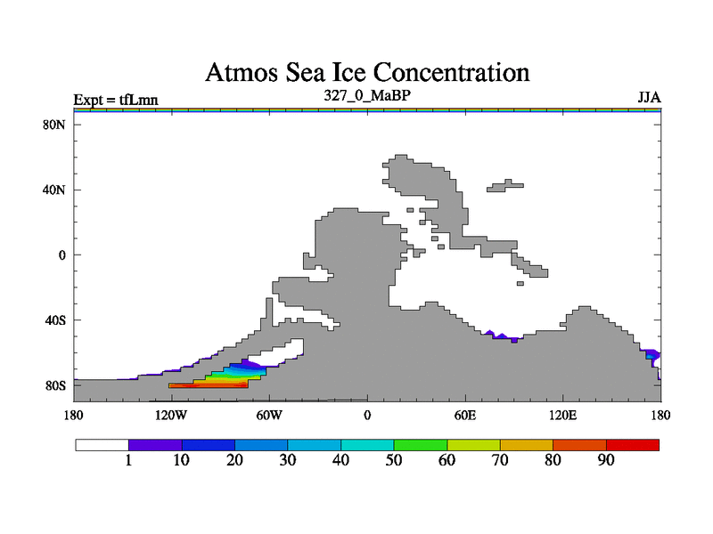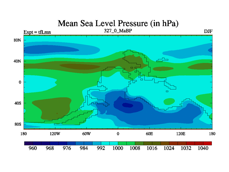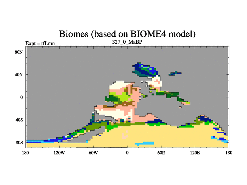 This is the 327.0 Ma simulation using the Scotese palaeogeographies and revised CCN etc. This version has islands and smoothing and desert albedo included. Tuned CO2 to give Scotese temperatures. Started from end of tfKsn. With JEDI output.