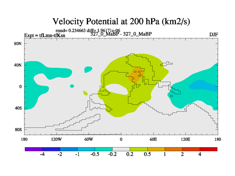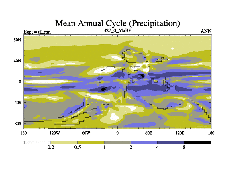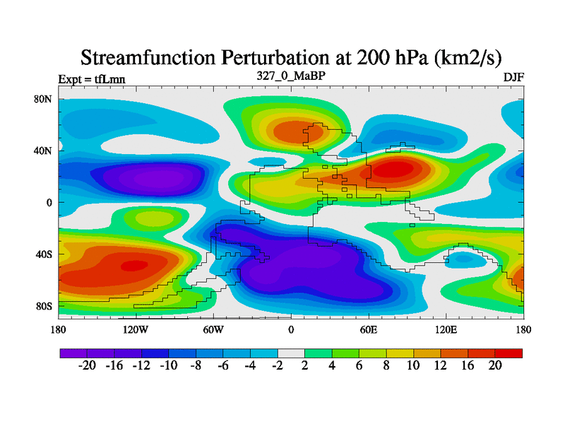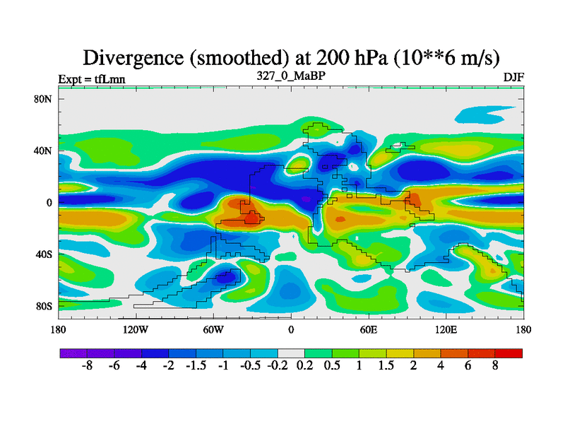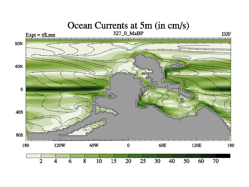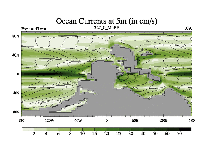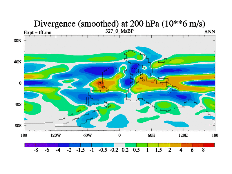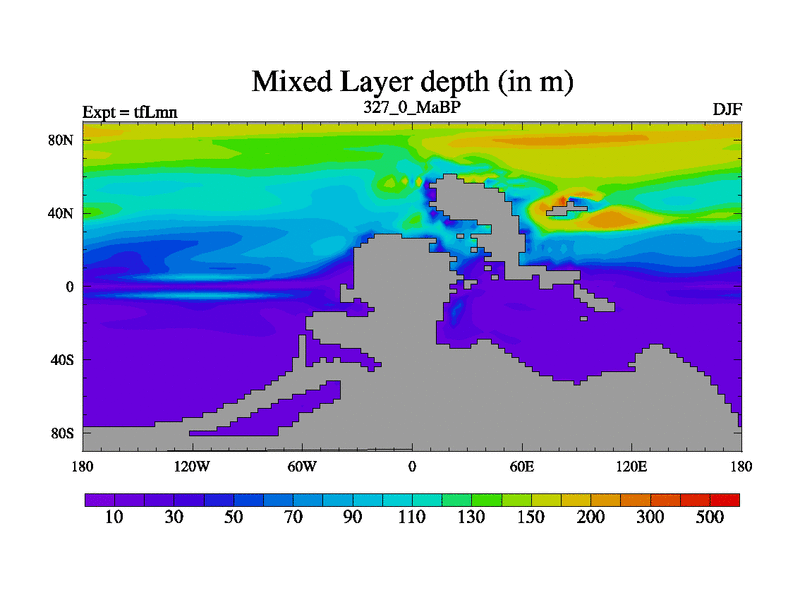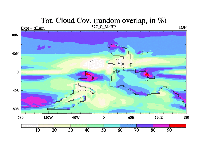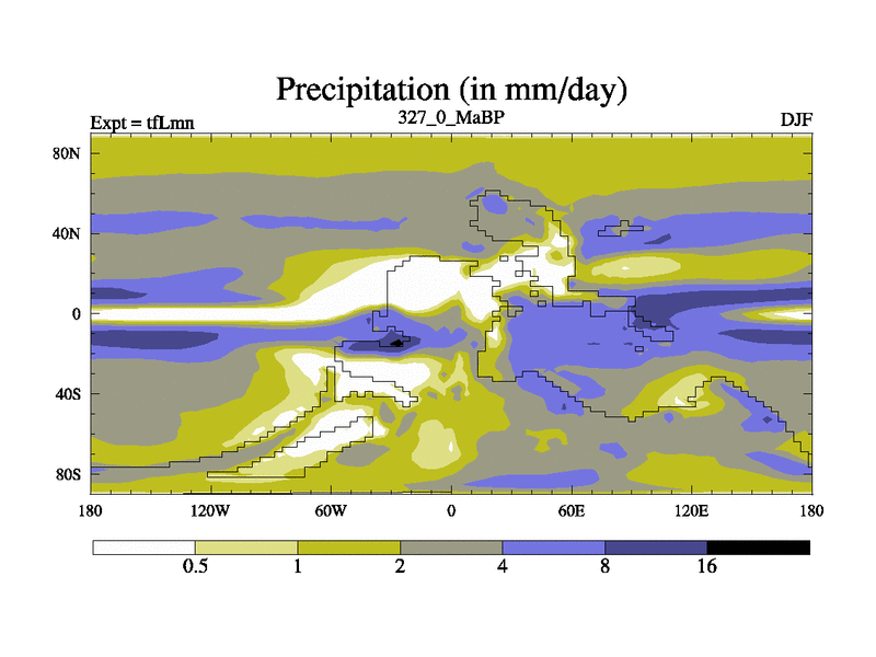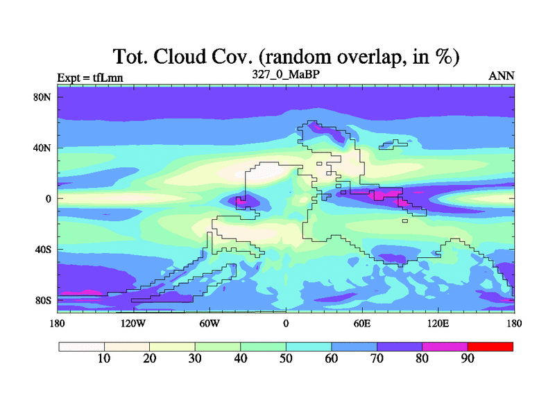 This is the 327.0 Ma simulation using the Scotese palaeogeographies and revised CCN etc. This version has islands and smoothing and desert albedo included. Tuned CO2 to give Scotese temperatures. Started from end of tfKsn. With JEDI output.