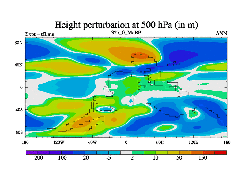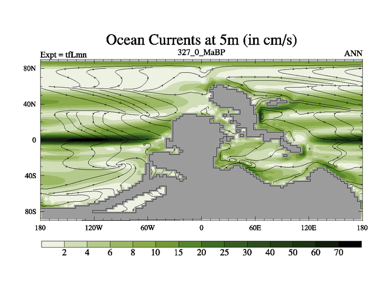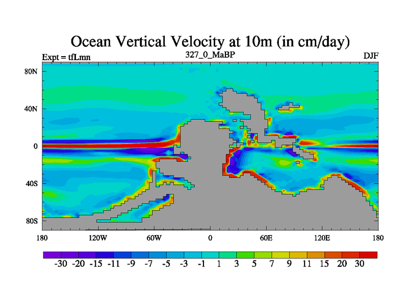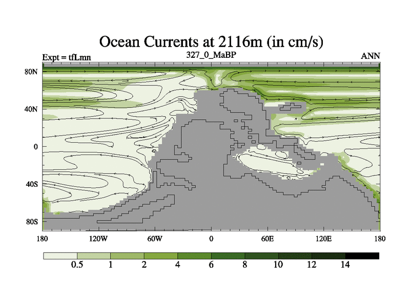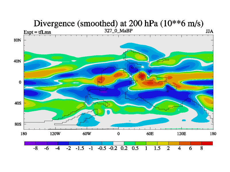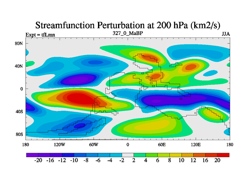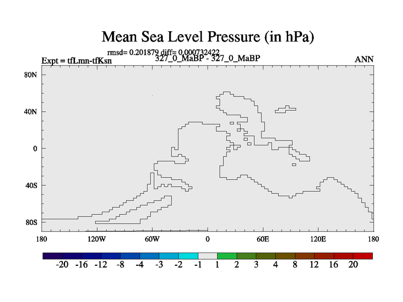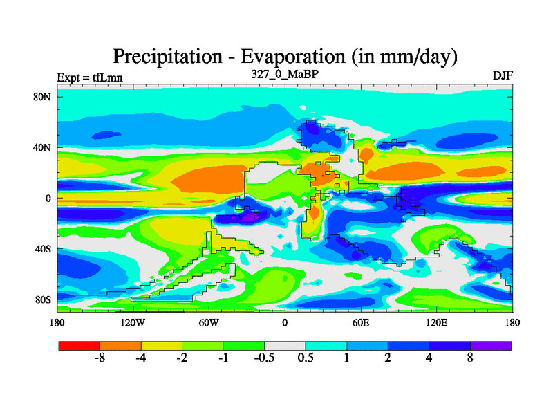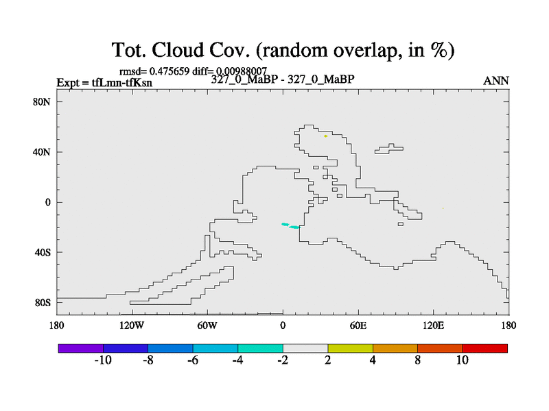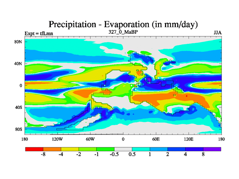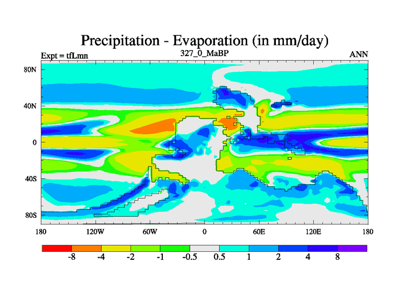 This is the 327.0 Ma simulation using the Scotese palaeogeographies and revised CCN etc. This version has islands and smoothing and desert albedo included. Tuned CO2 to give Scotese temperatures. Started from end of tfKsn. With JEDI output.