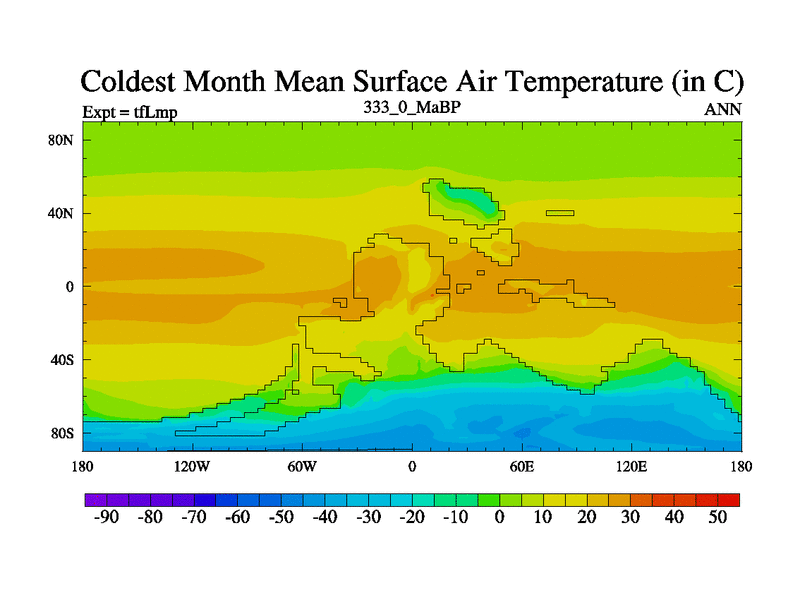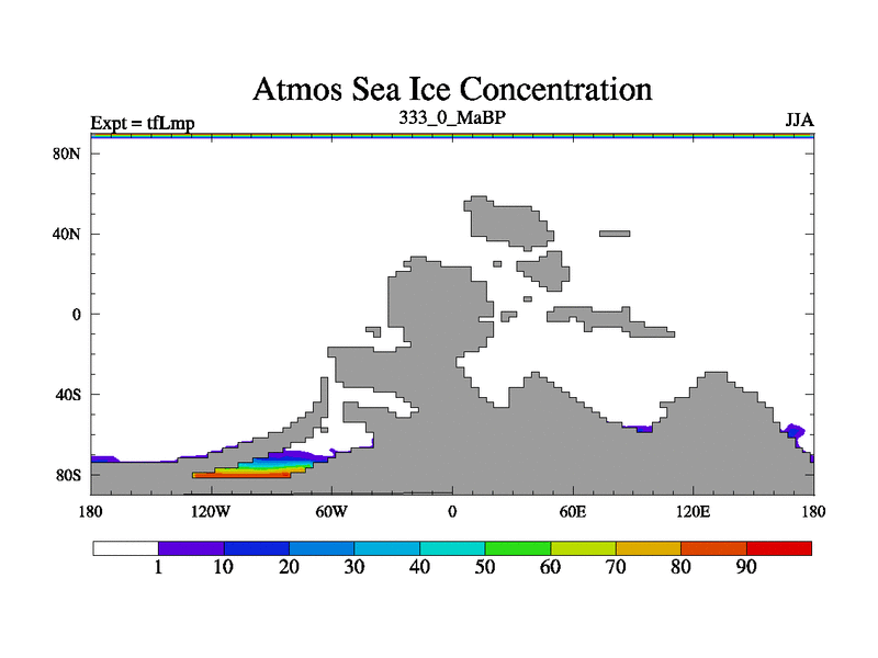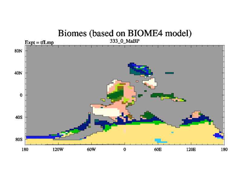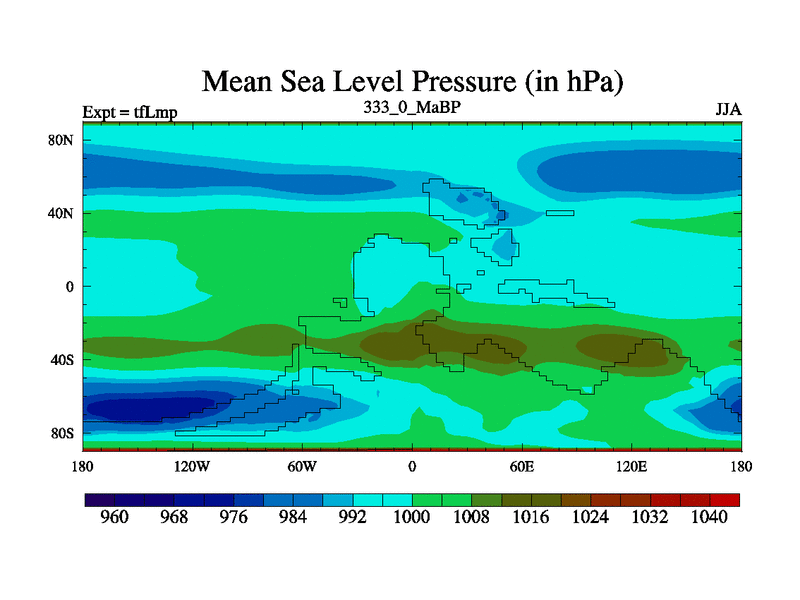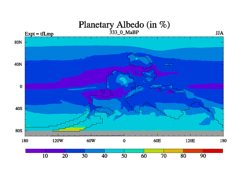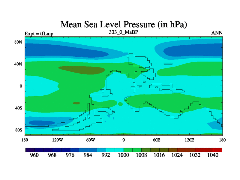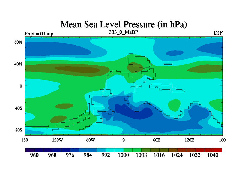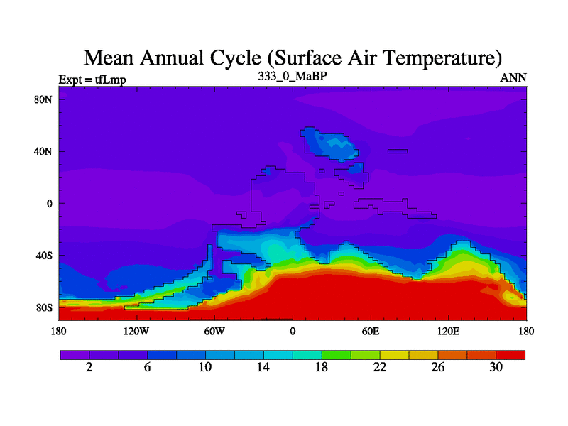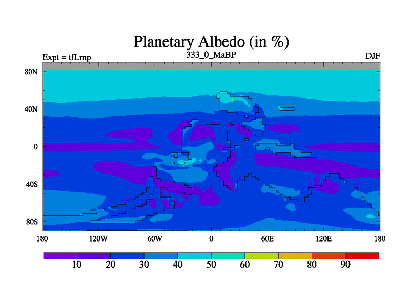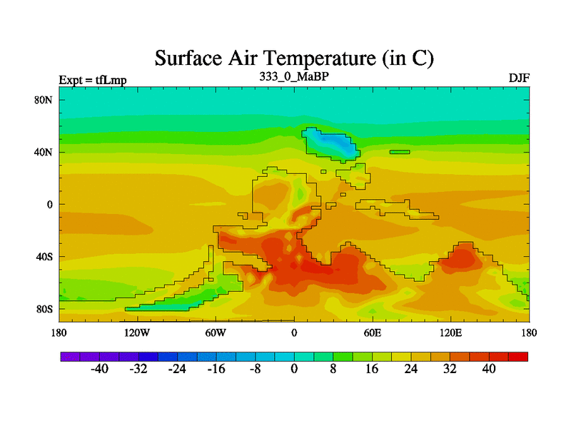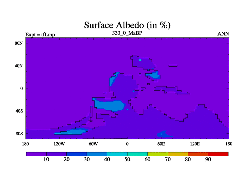This is the 333.0 Ma simulation using the Scotese palaeogeographies and revised CCN etc. This version has islands and smoothing and desert albedo included. Tuned CO2 to give Scotese temperatures. Started from end of tfKsp. With JEDI output.