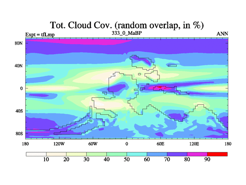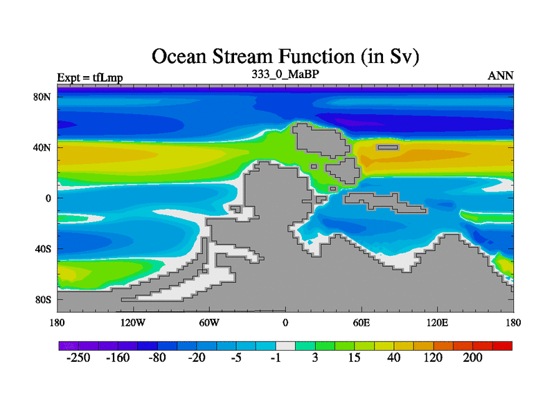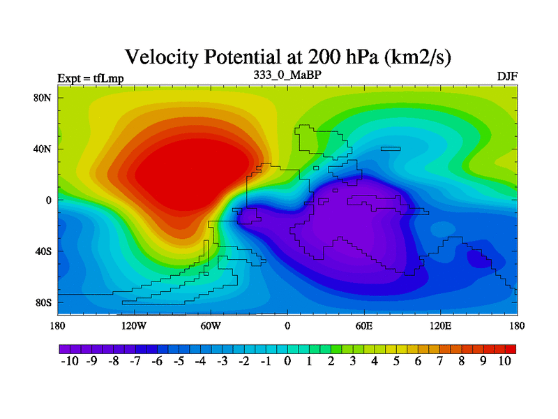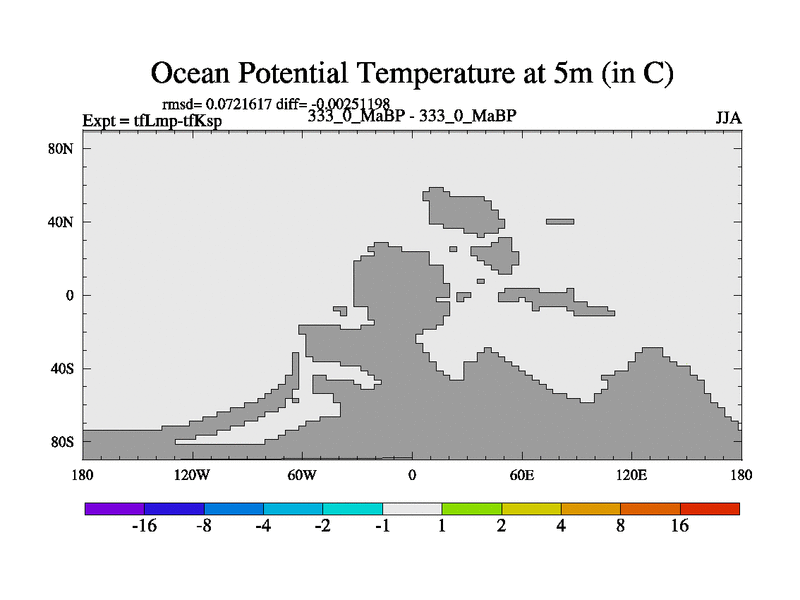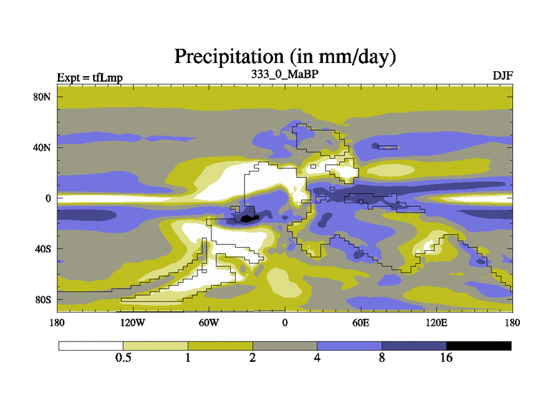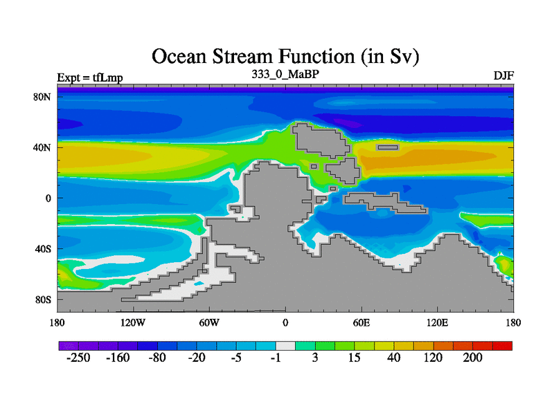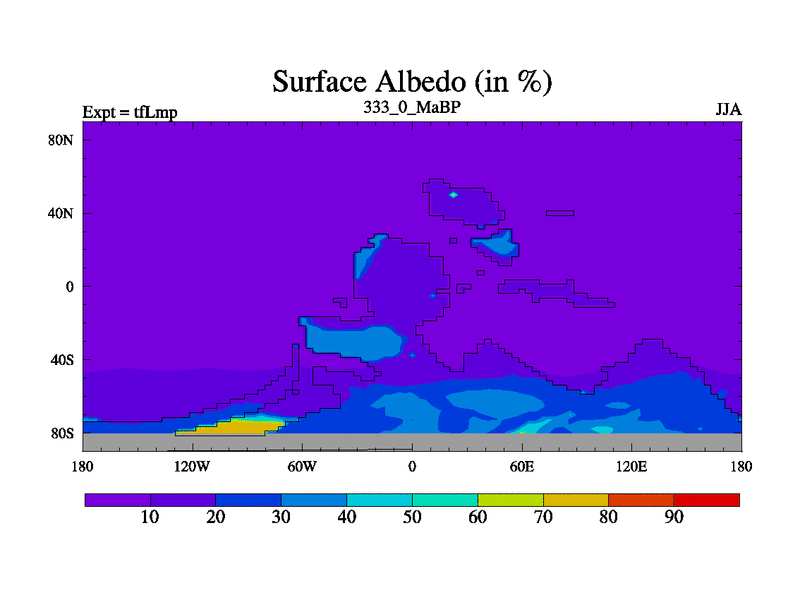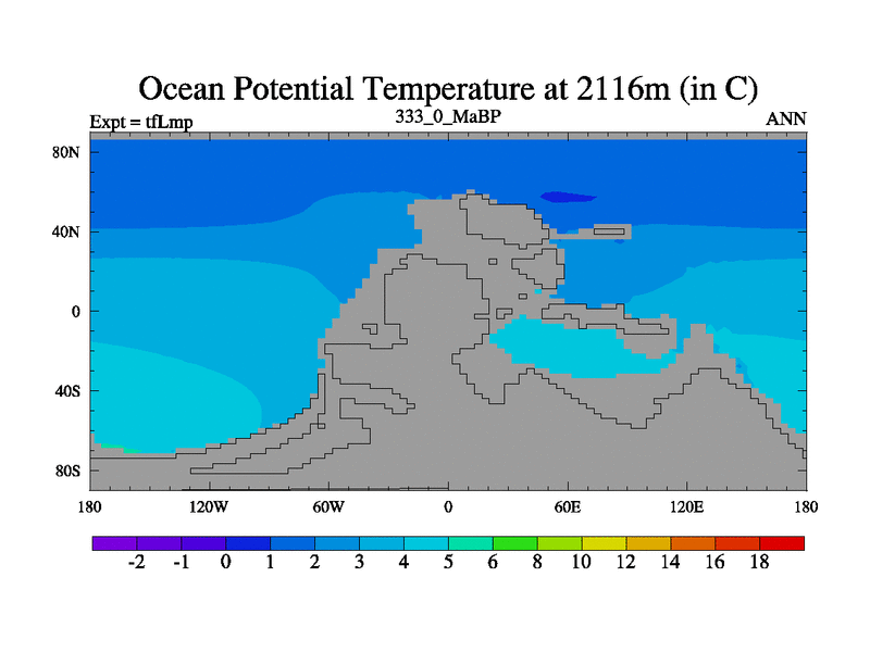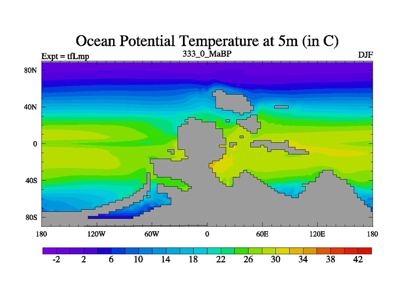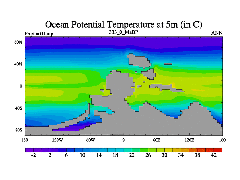 This is the 333.0 Ma simulation using the Scotese palaeogeographies and revised CCN etc. This version has islands and smoothing and desert albedo included. Tuned CO2 to give Scotese temperatures. Started from end of tfKsp. With JEDI output.