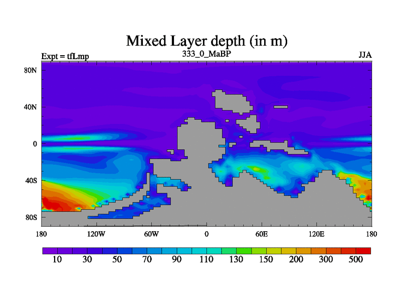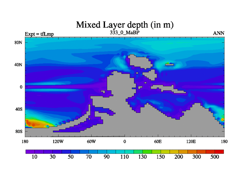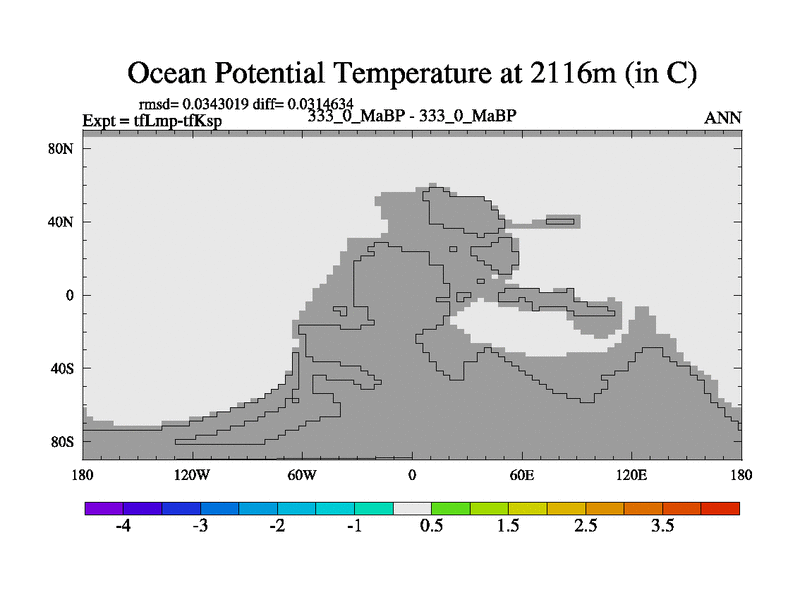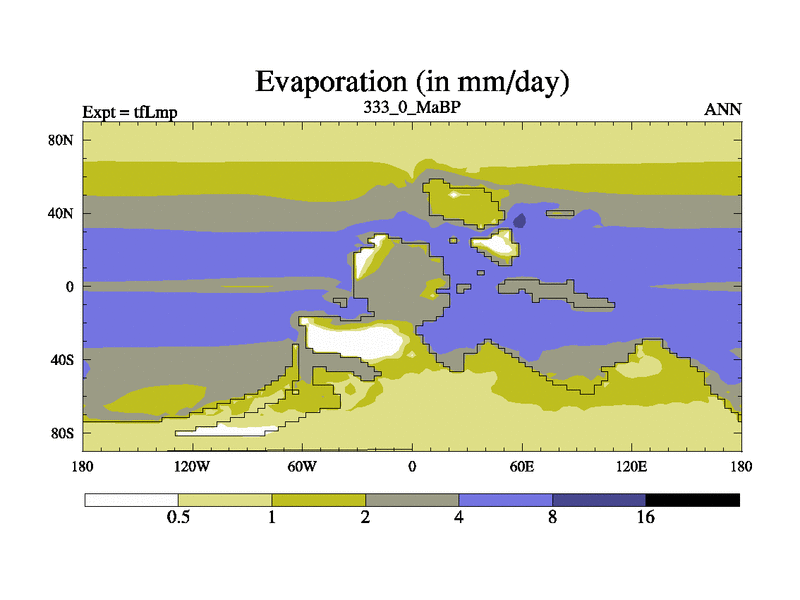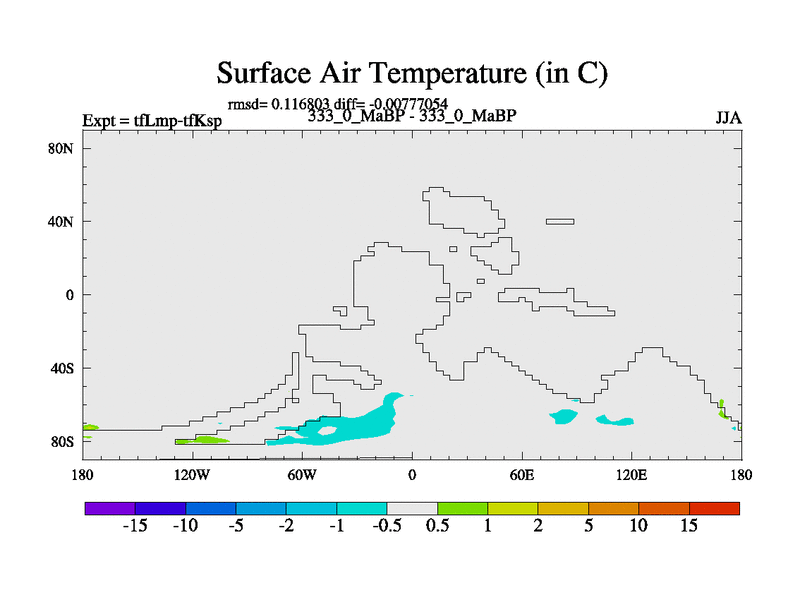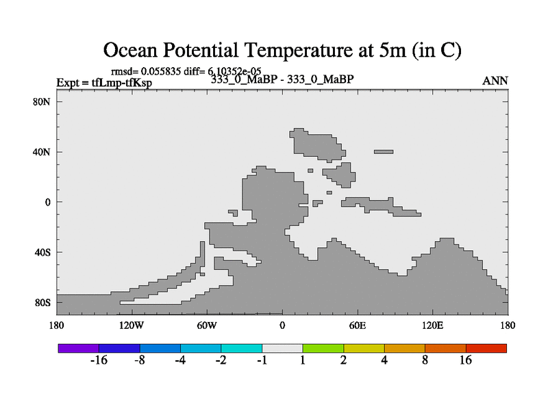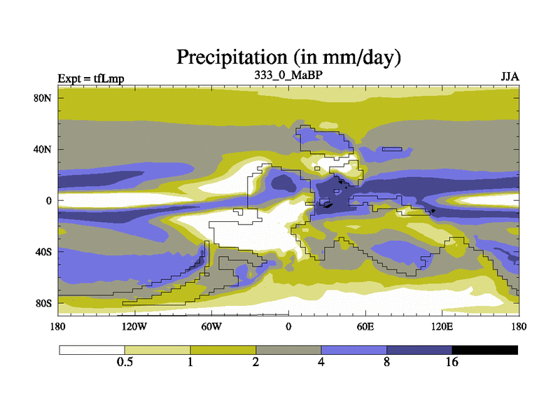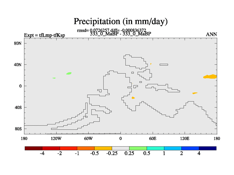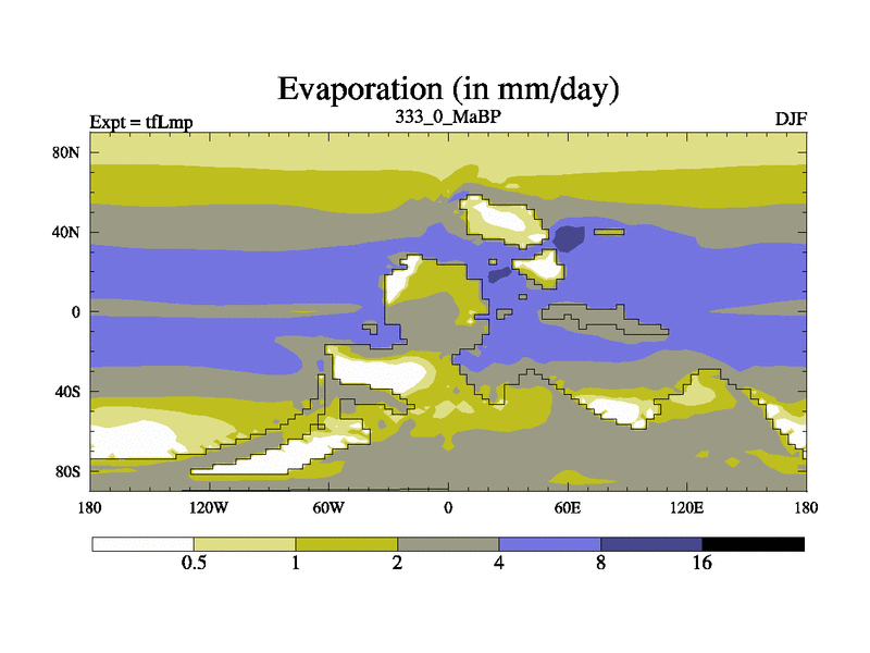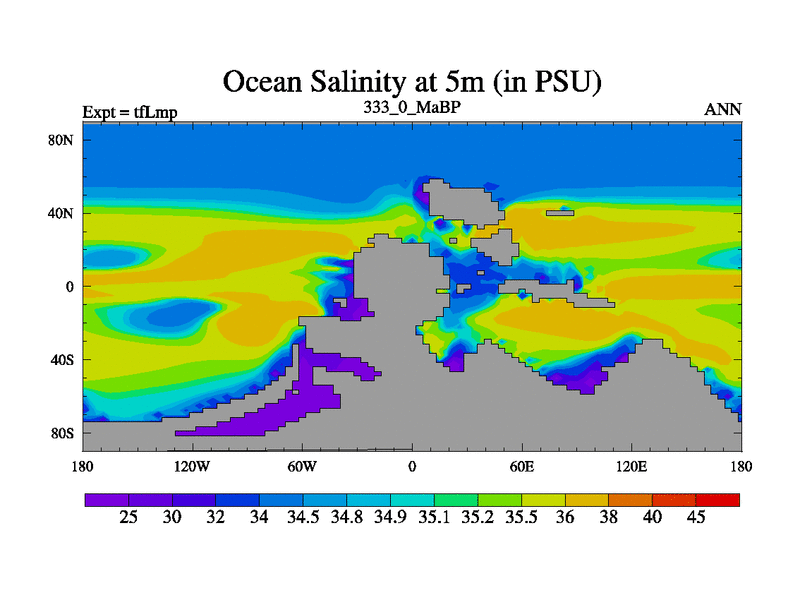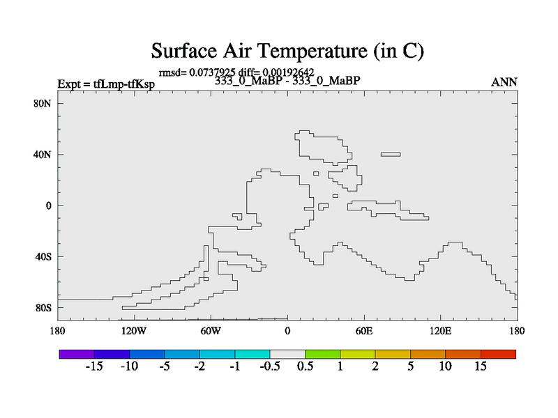 This is the 333.0 Ma simulation using the Scotese palaeogeographies and revised CCN etc. This version has islands and smoothing and desert albedo included. Tuned CO2 to give Scotese temperatures. Started from end of tfKsp. With JEDI output.