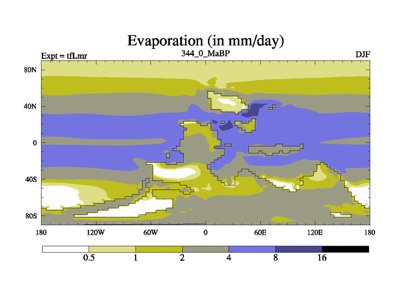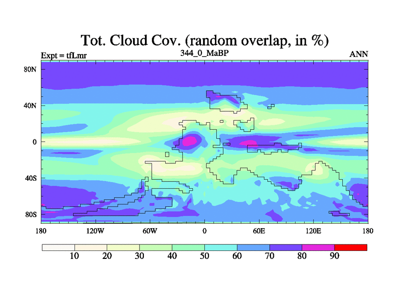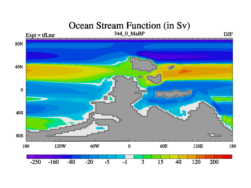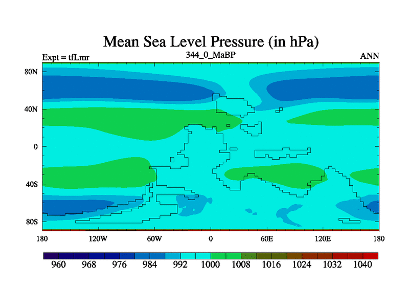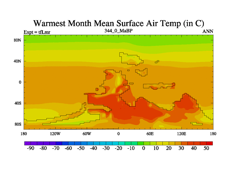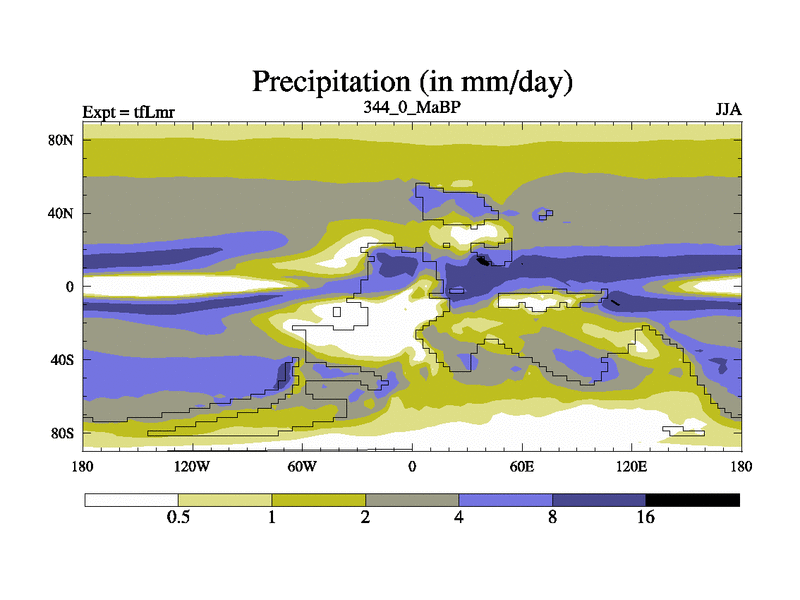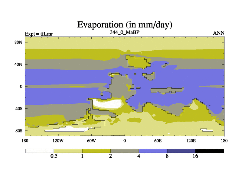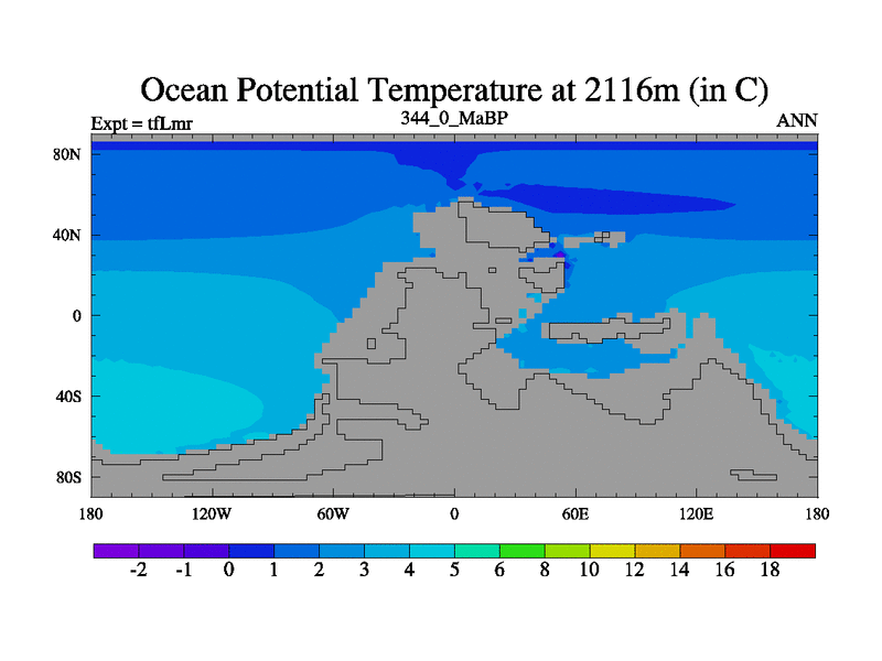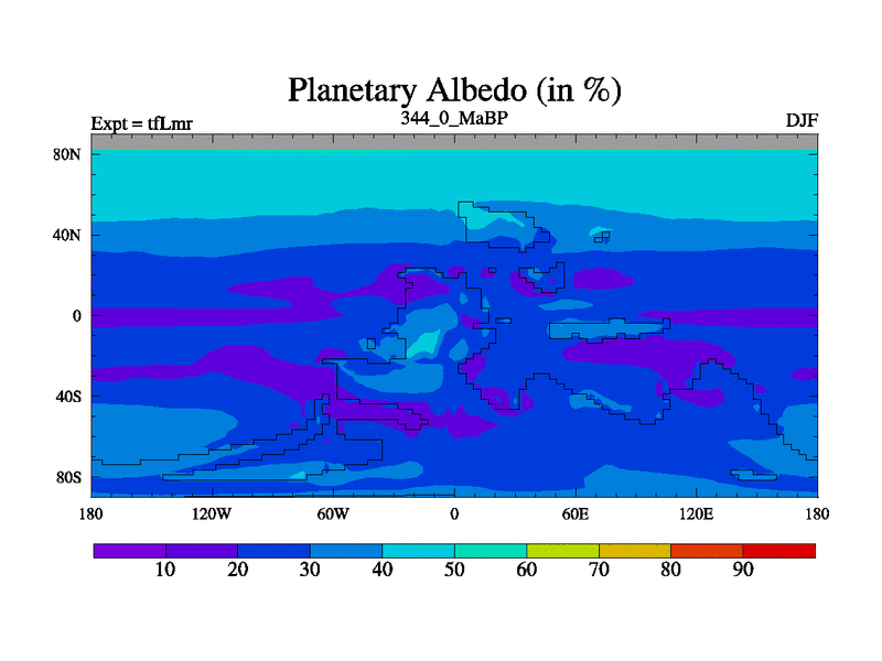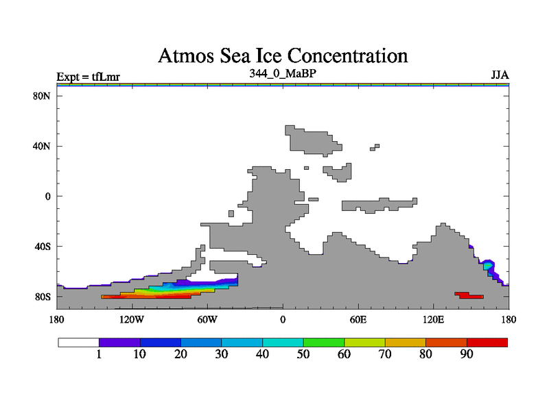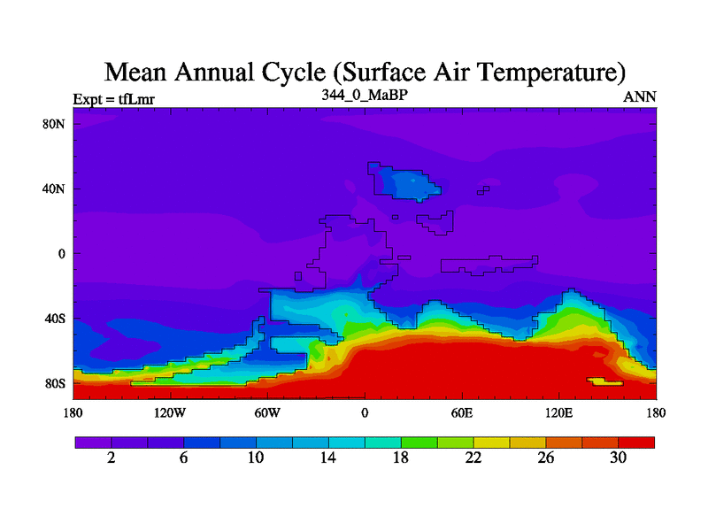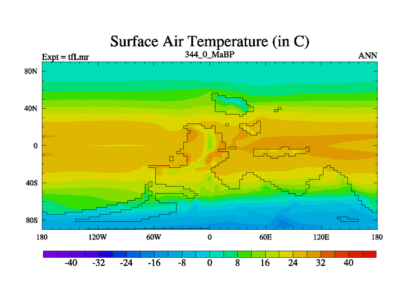 This is the 344.0 Ma simulation using the Scotese palaeogeographies and revised CCN etc. This version has islands and smoothing and desert albedo included. Tuned CO2 to give Scotese temperatures. Started from end of tfKsr. With JEDI output.