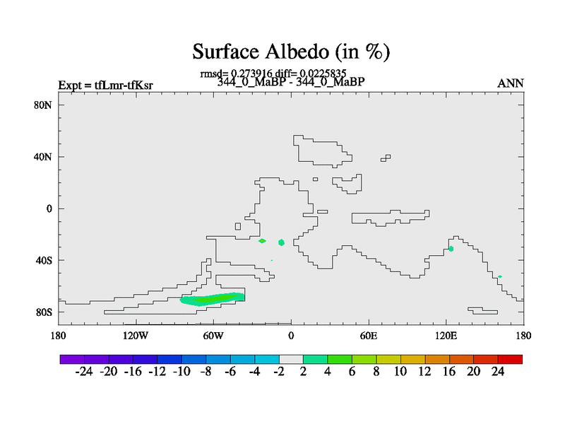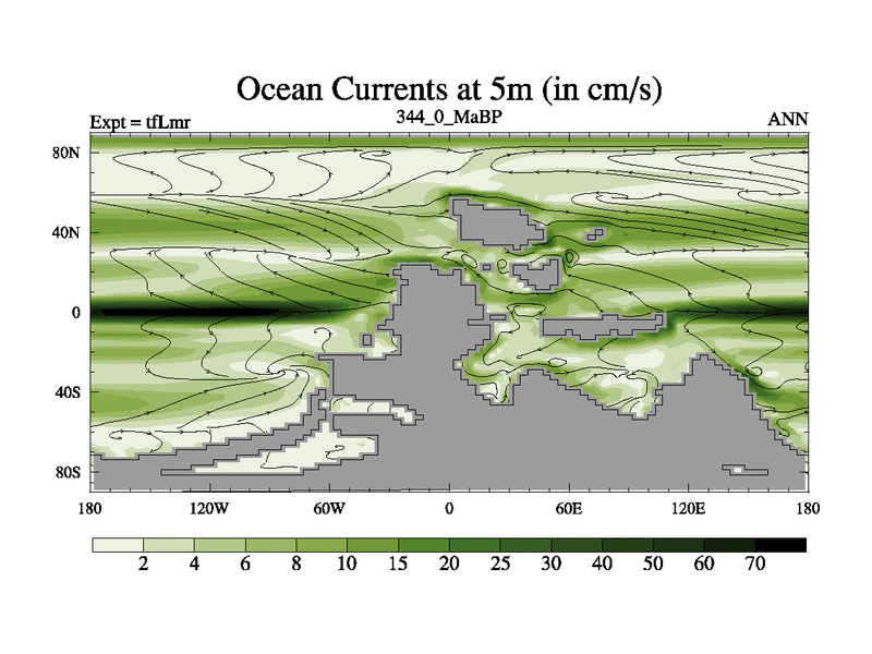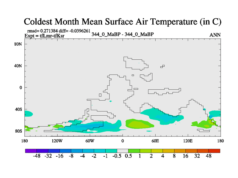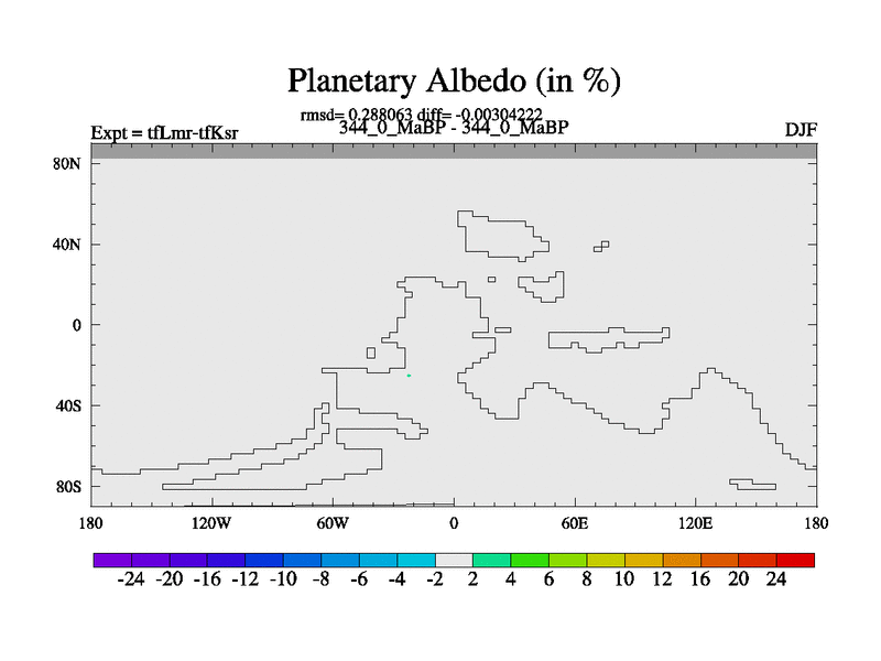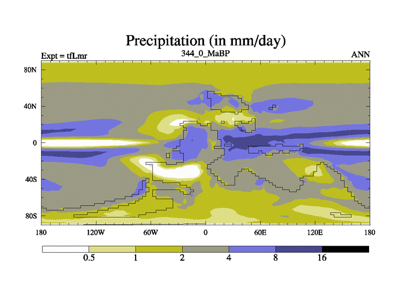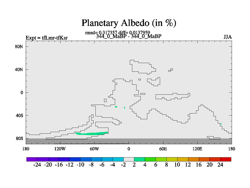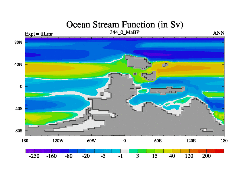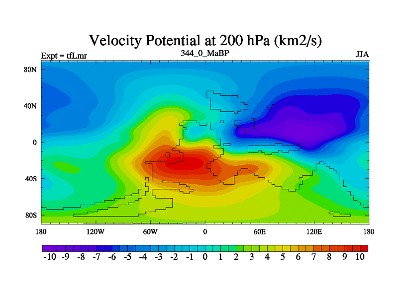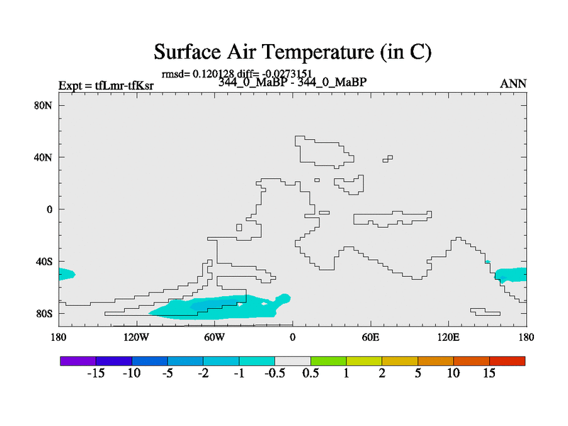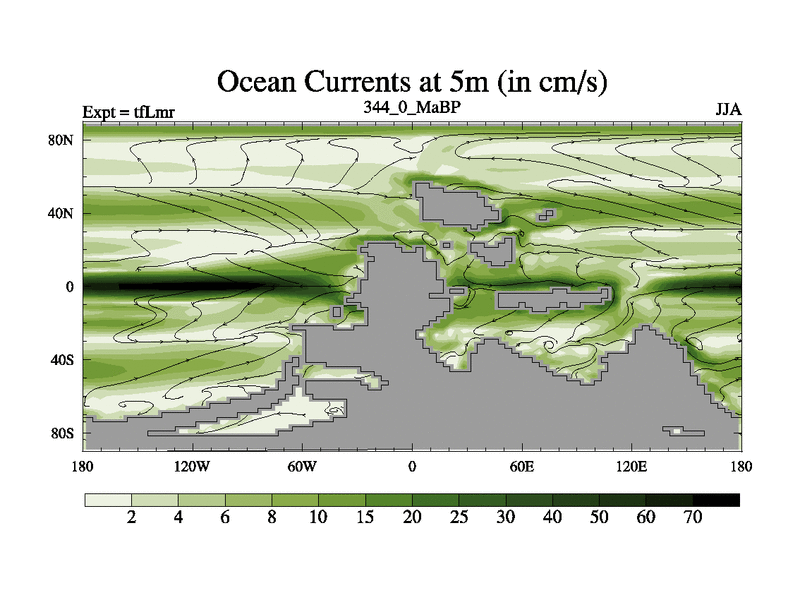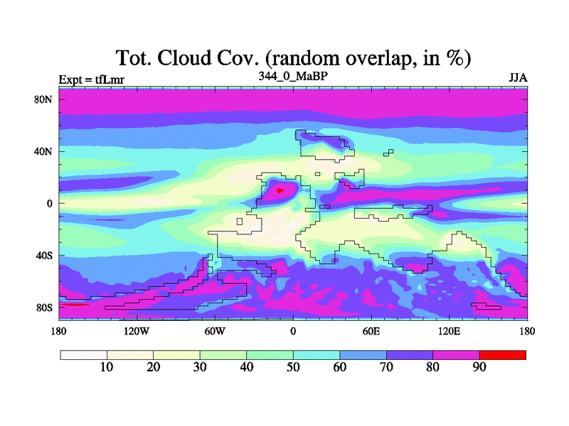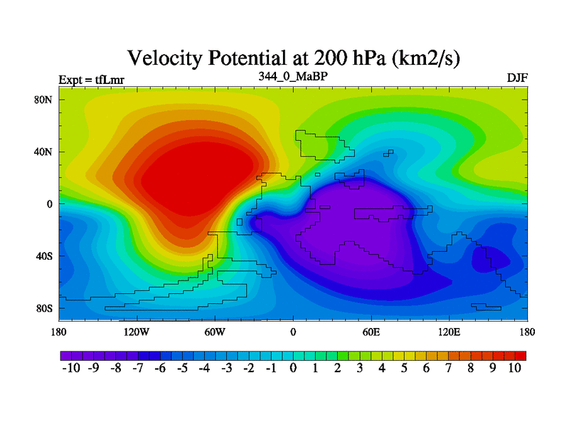 This is the 344.0 Ma simulation using the Scotese palaeogeographies and revised CCN etc. This version has islands and smoothing and desert albedo included. Tuned CO2 to give Scotese temperatures. Started from end of tfKsr. With JEDI output.