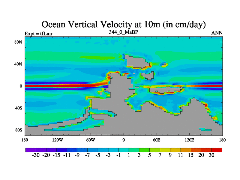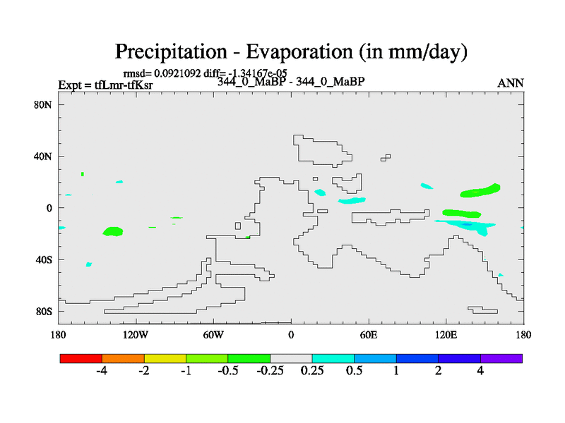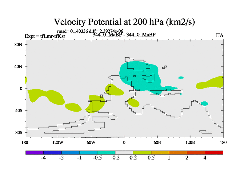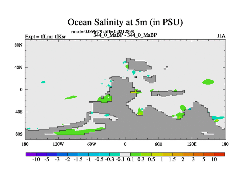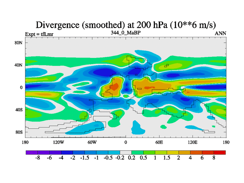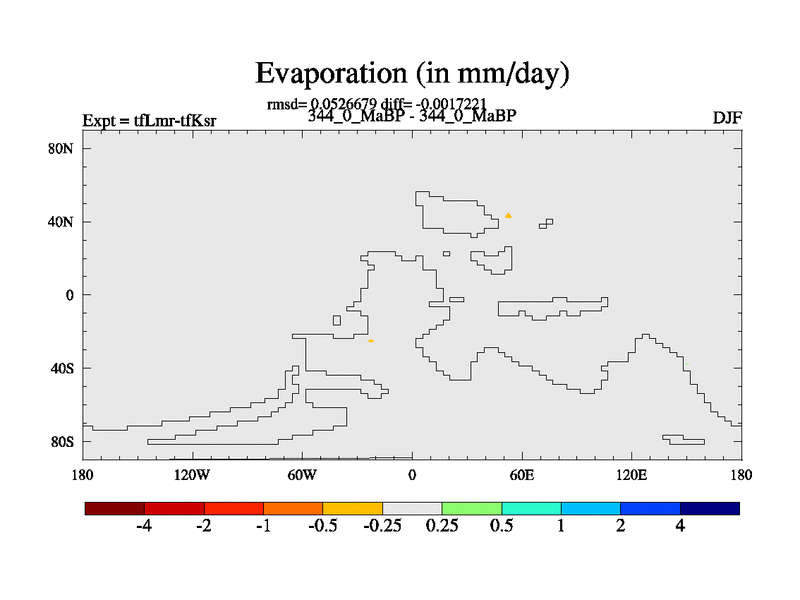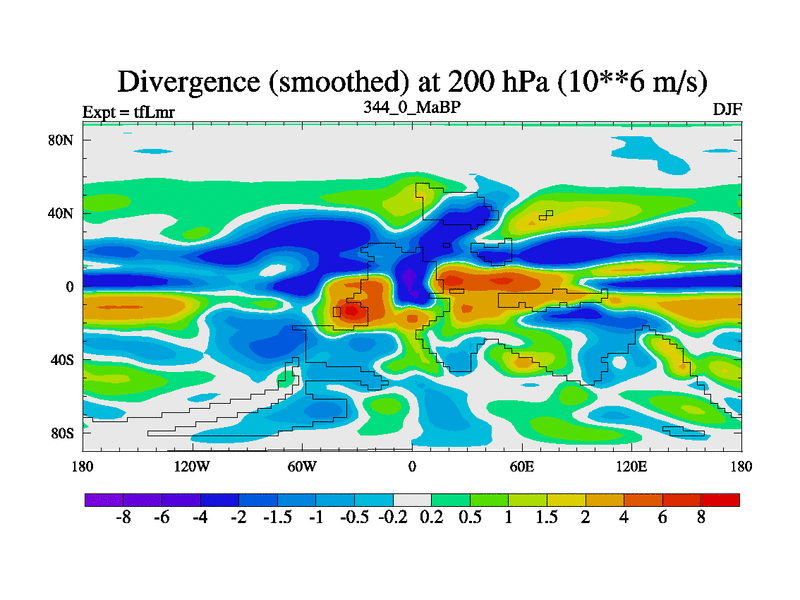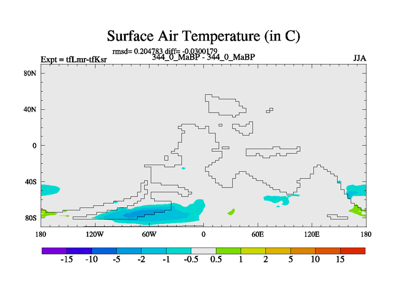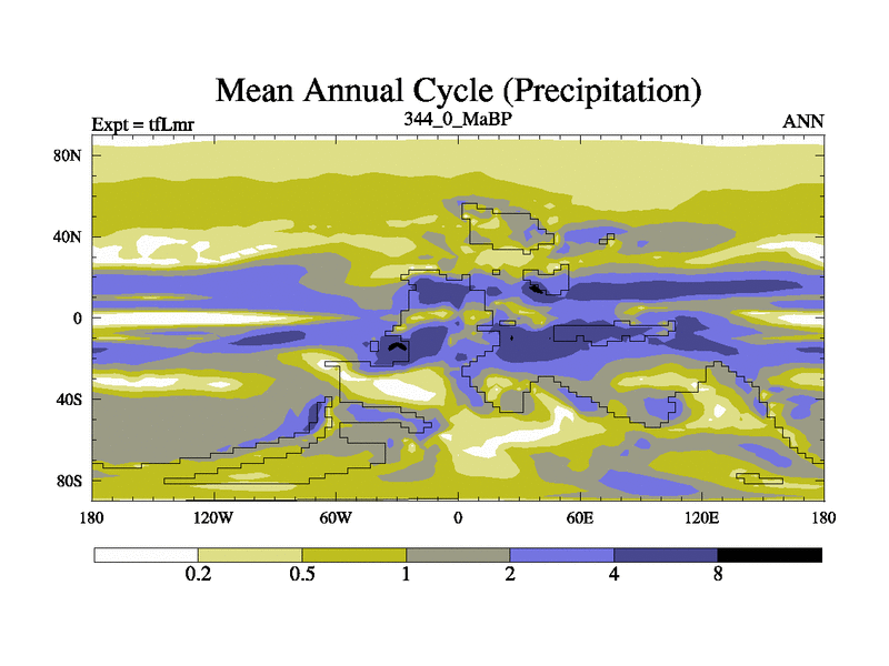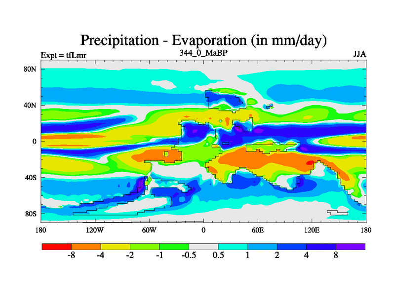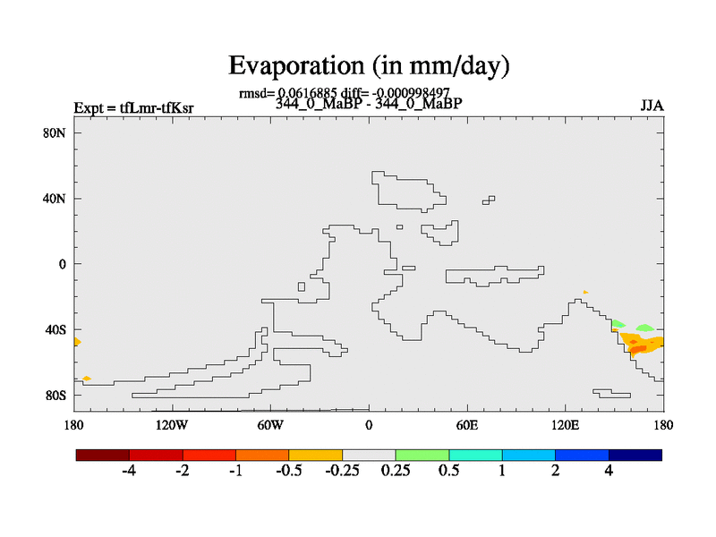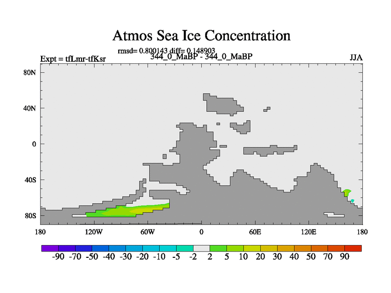 This is the 344.0 Ma simulation using the Scotese palaeogeographies and revised CCN etc. This version has islands and smoothing and desert albedo included. Tuned CO2 to give Scotese temperatures. Started from end of tfKsr. With JEDI output.