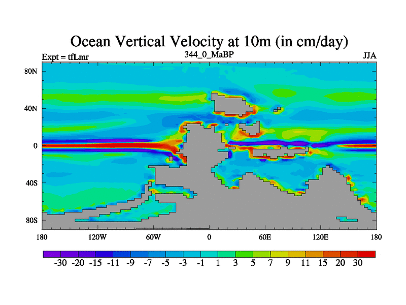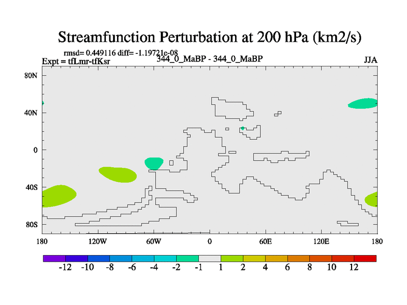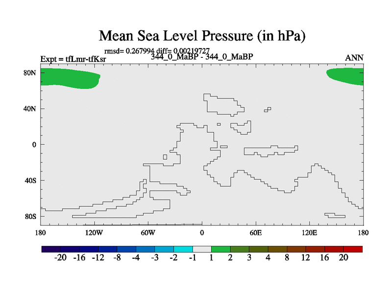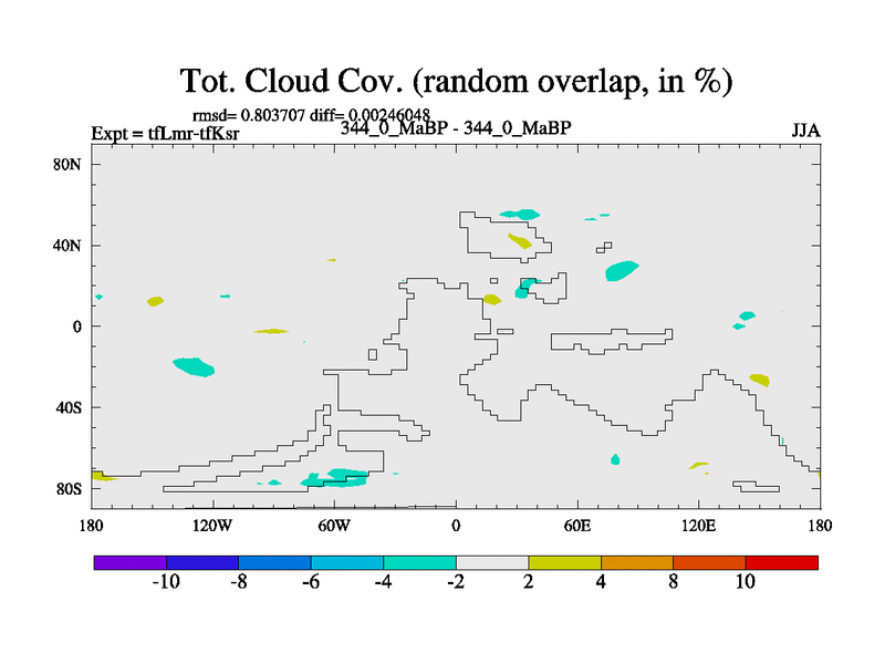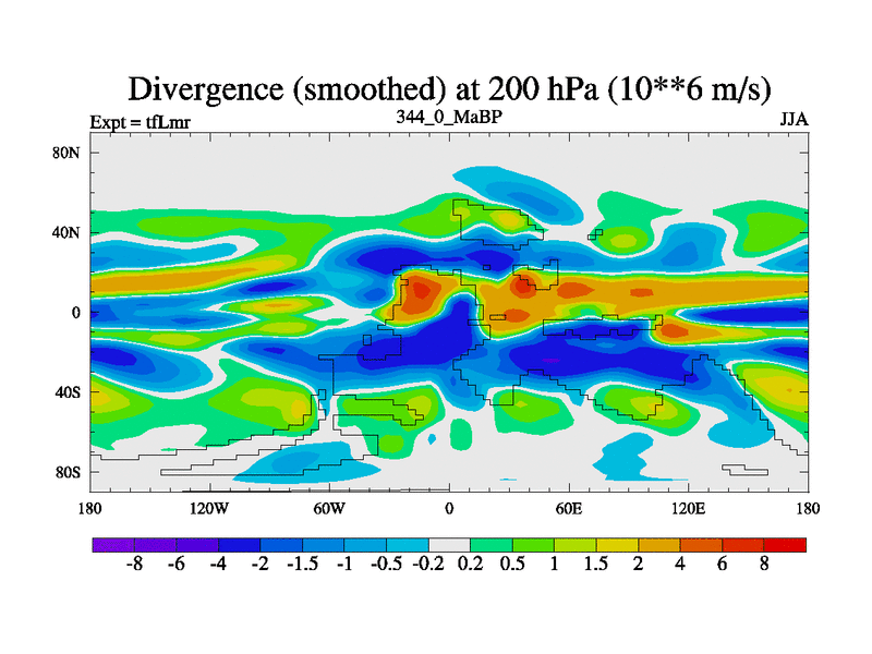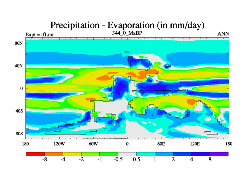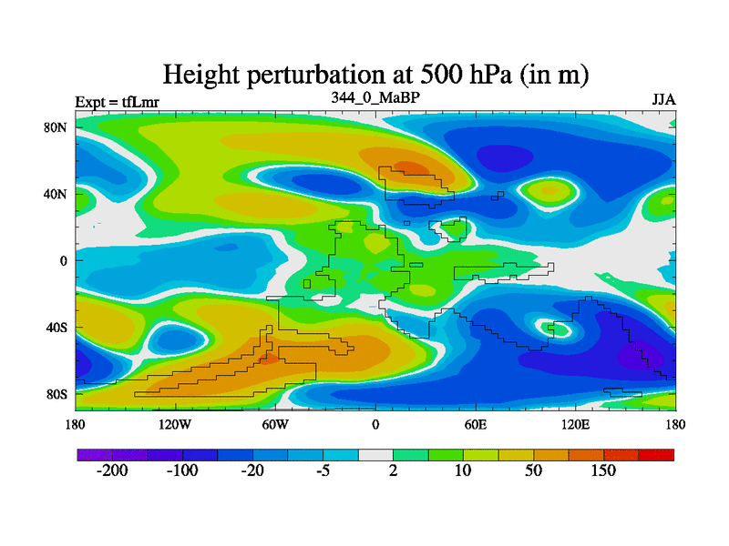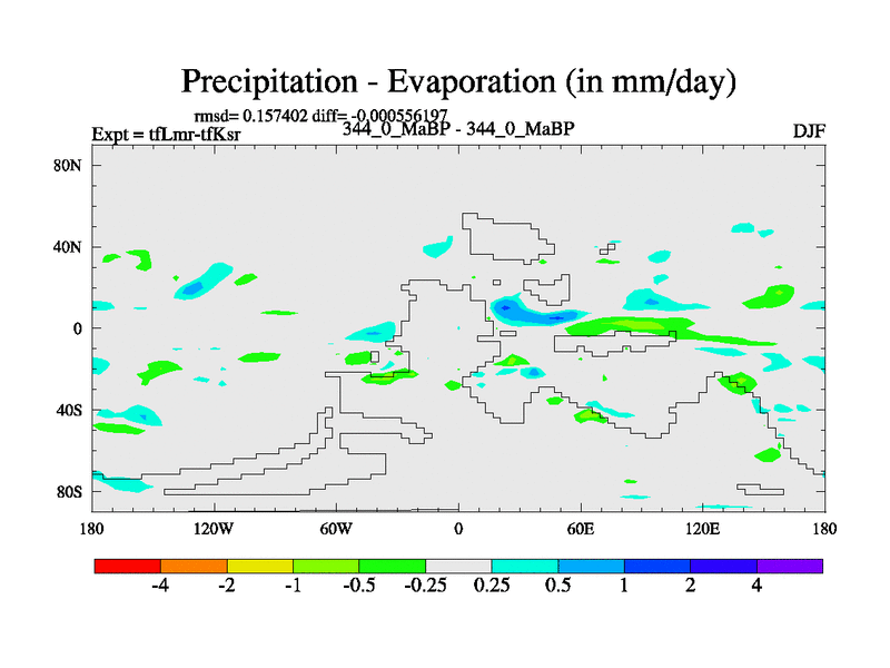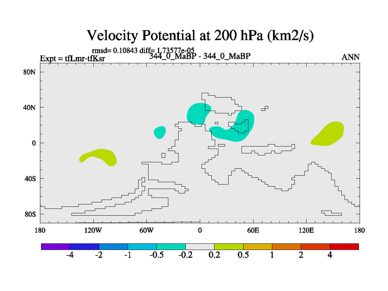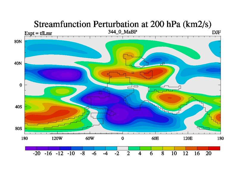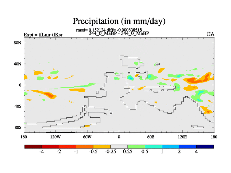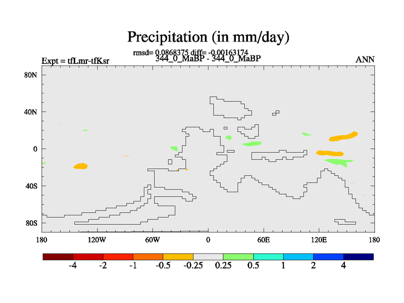 This is the 344.0 Ma simulation using the Scotese palaeogeographies and revised CCN etc. This version has islands and smoothing and desert albedo included. Tuned CO2 to give Scotese temperatures. Started from end of tfKsr. With JEDI output.