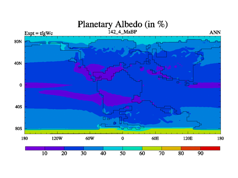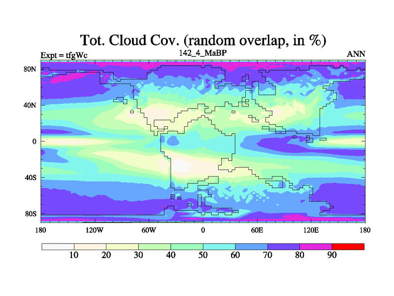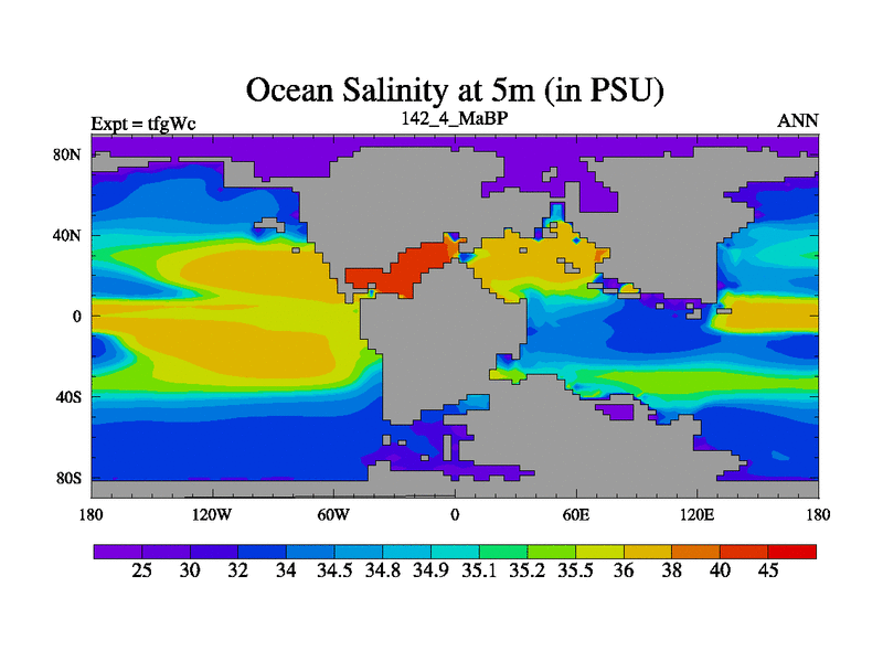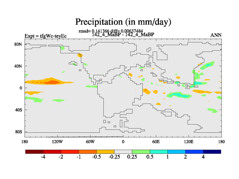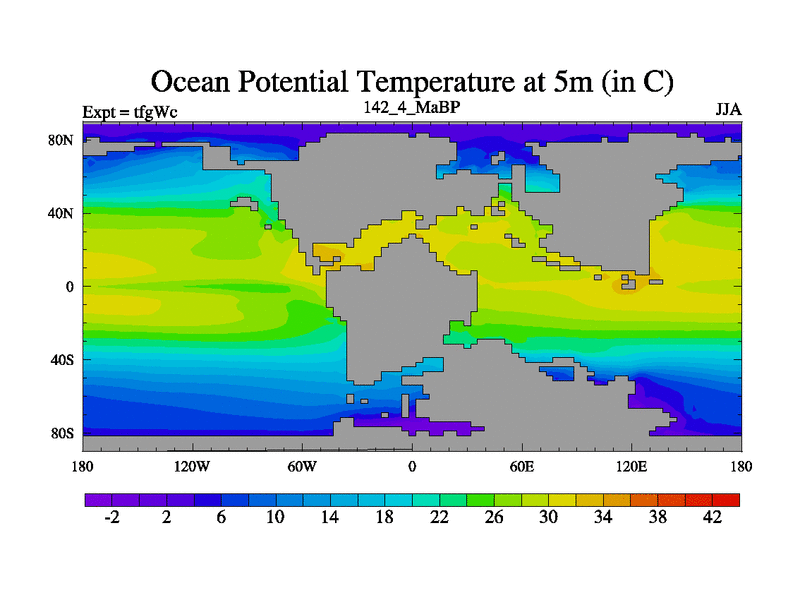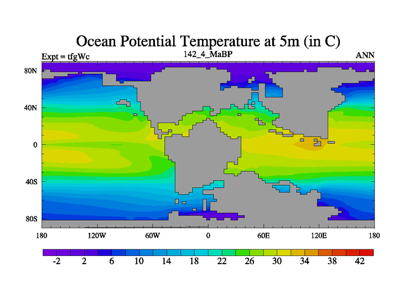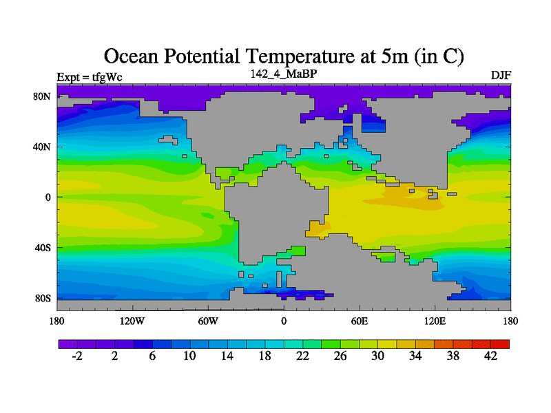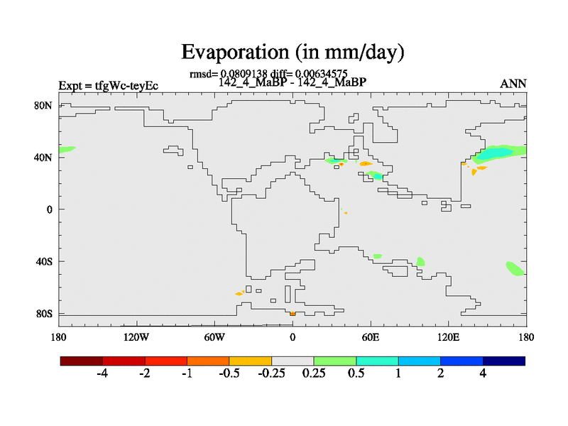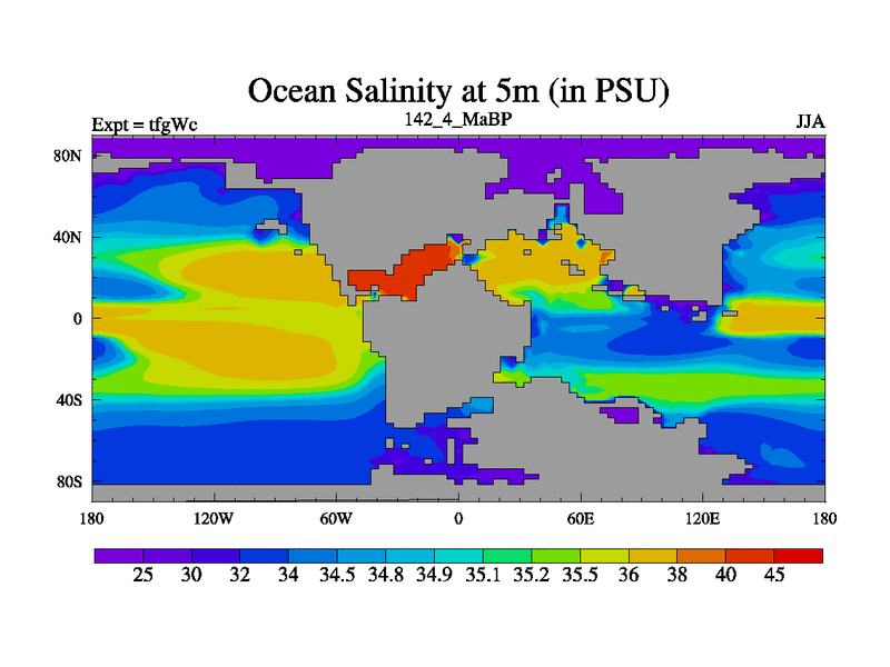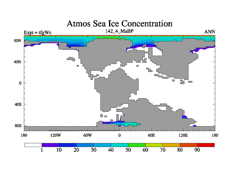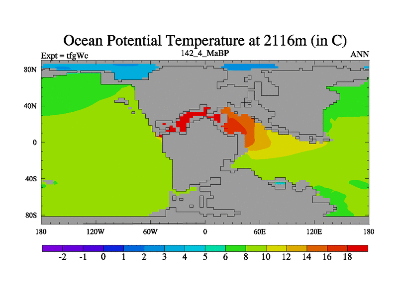 This is the 142.4 Ma simulation using the Scotese palaeogeographies and revised CCN etc. This version has islands included. Started from end of teyEc.