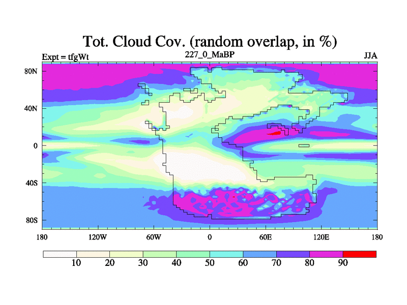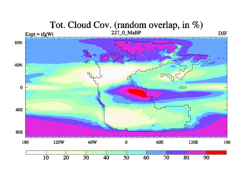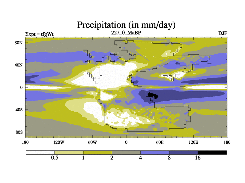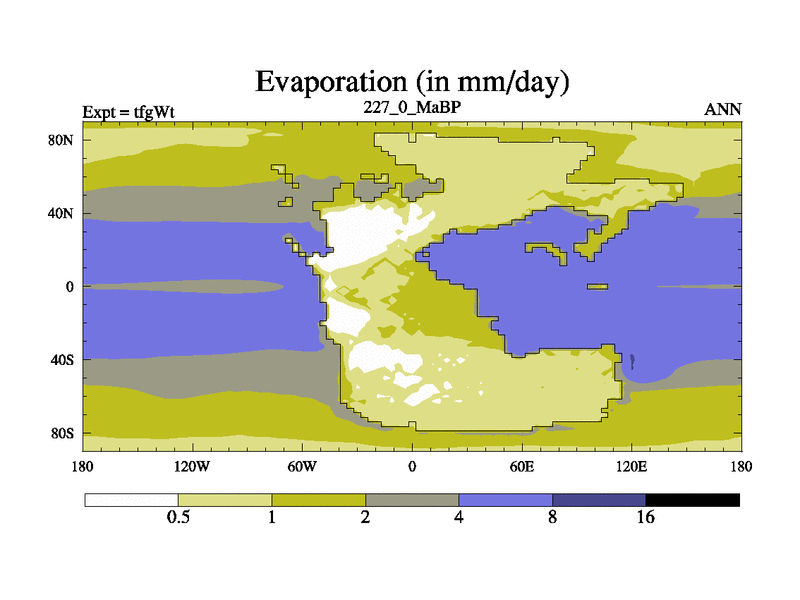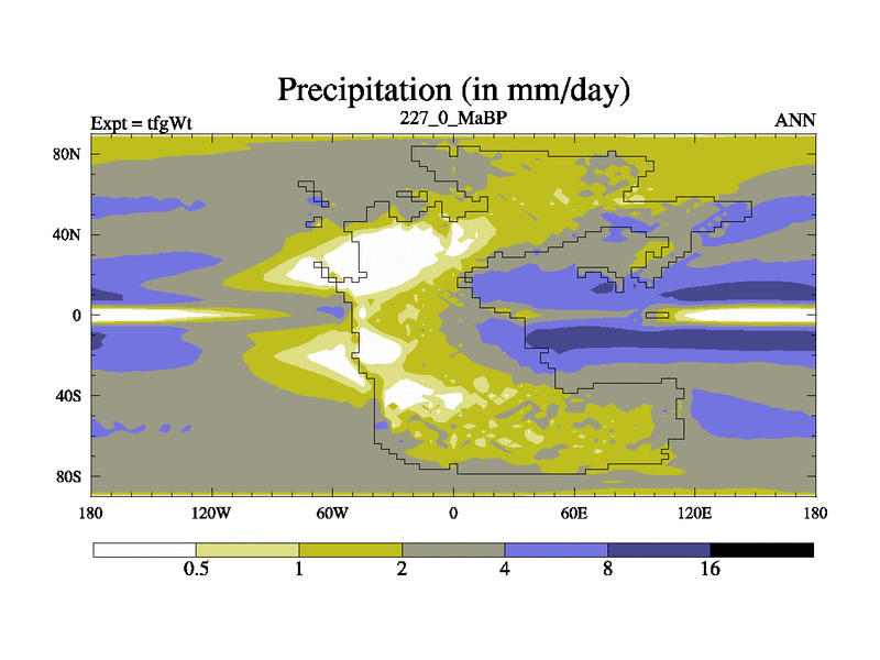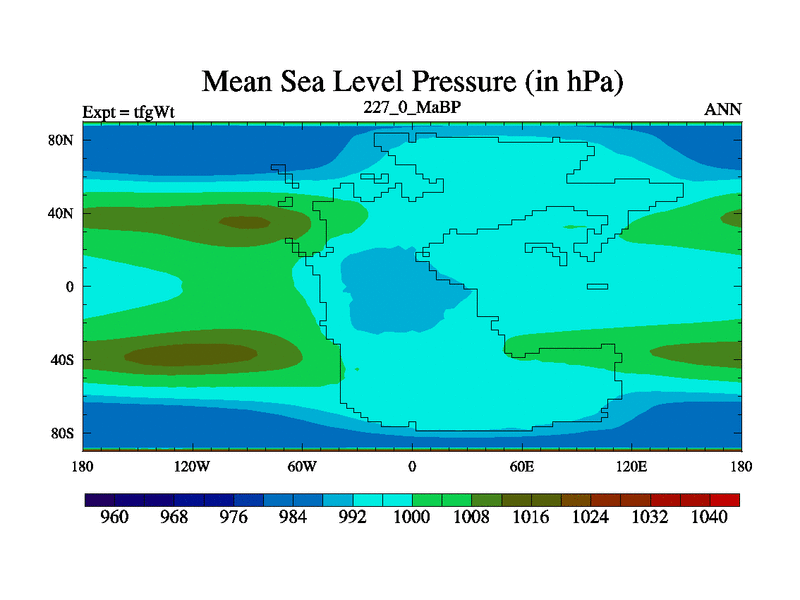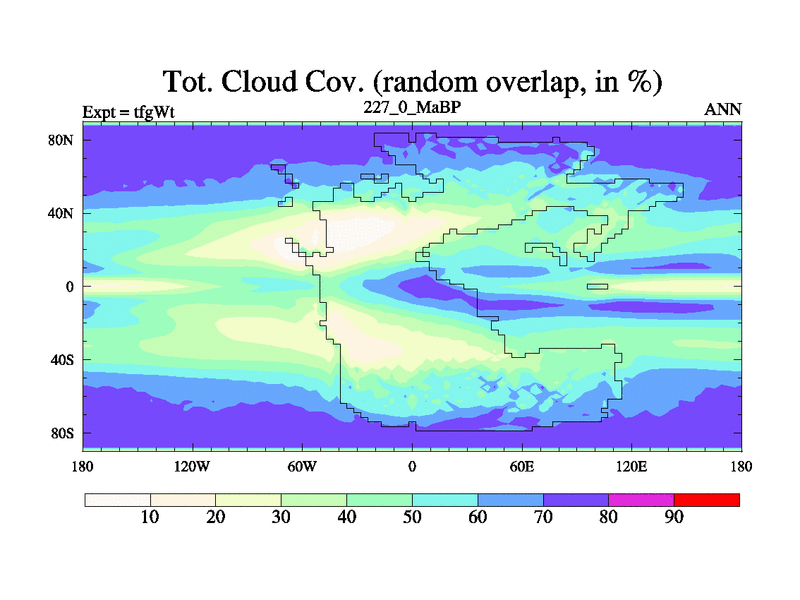 This is the 227.0 Ma simulation using the Scotese palaeogeographies and revised CCN etc. This version has islands included. Started from end of teyEt.