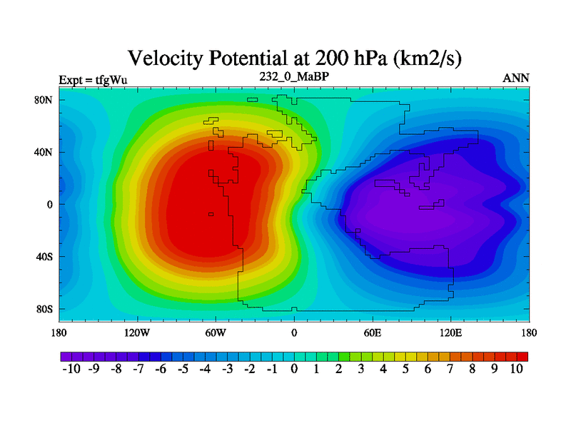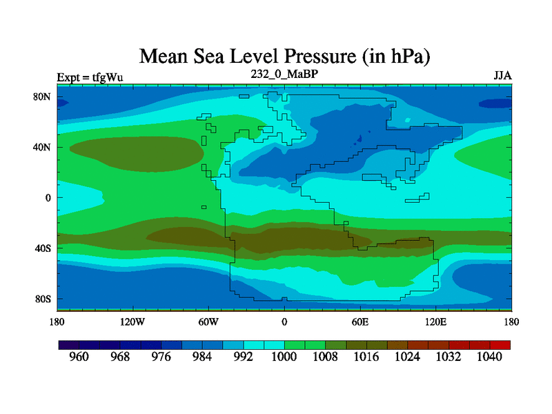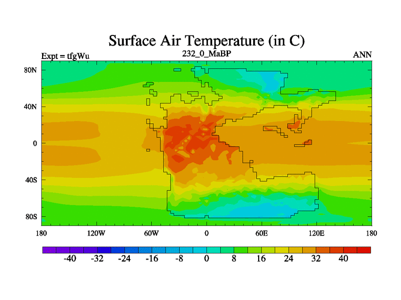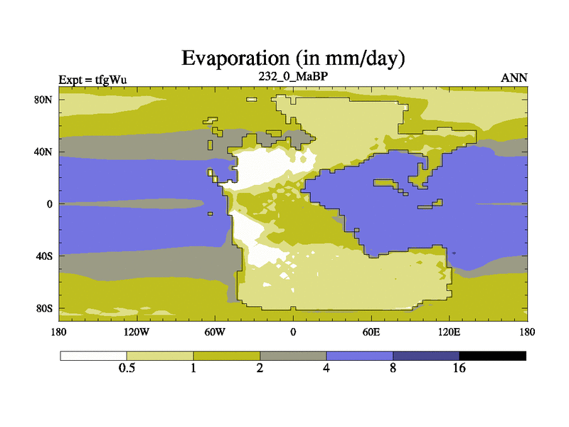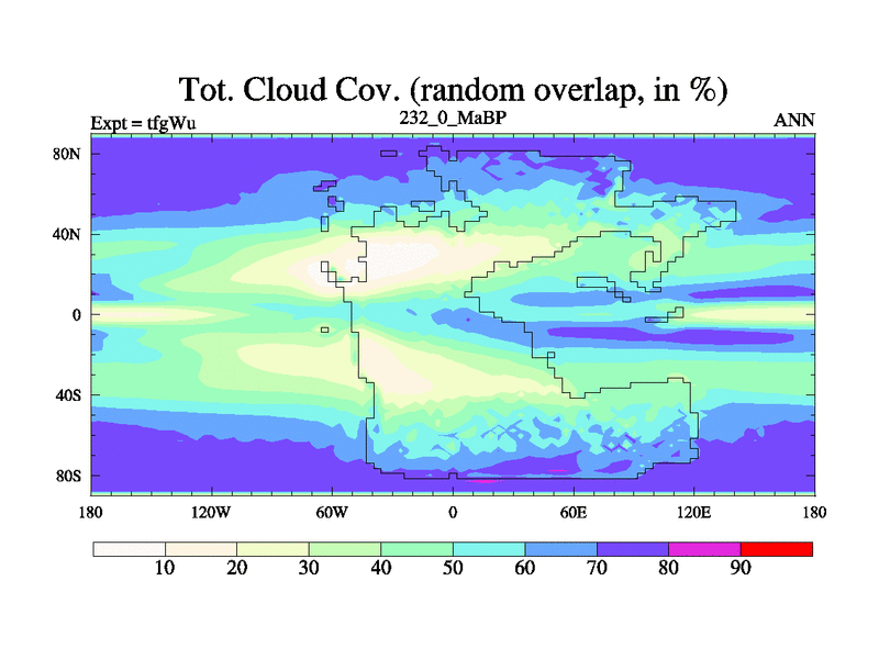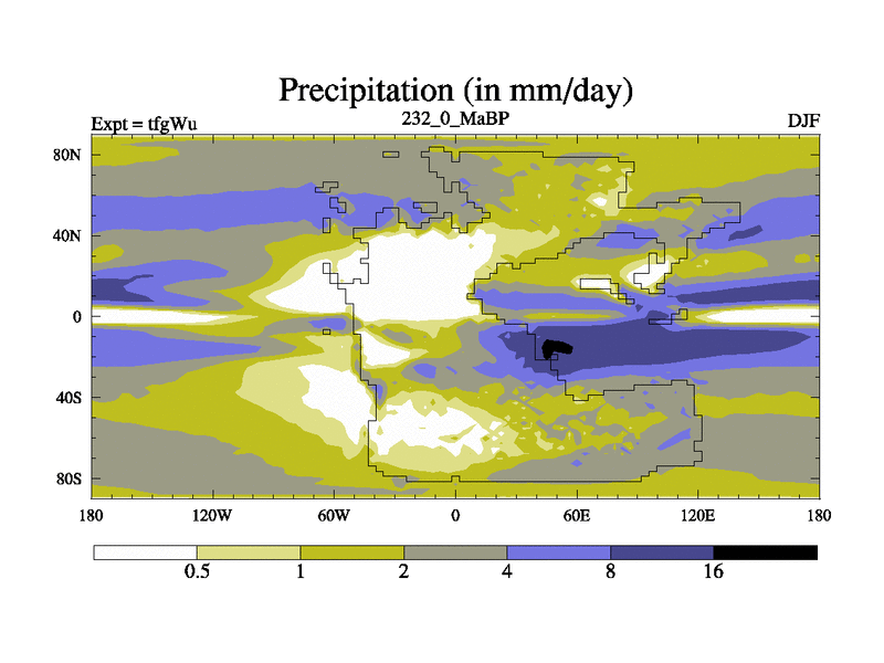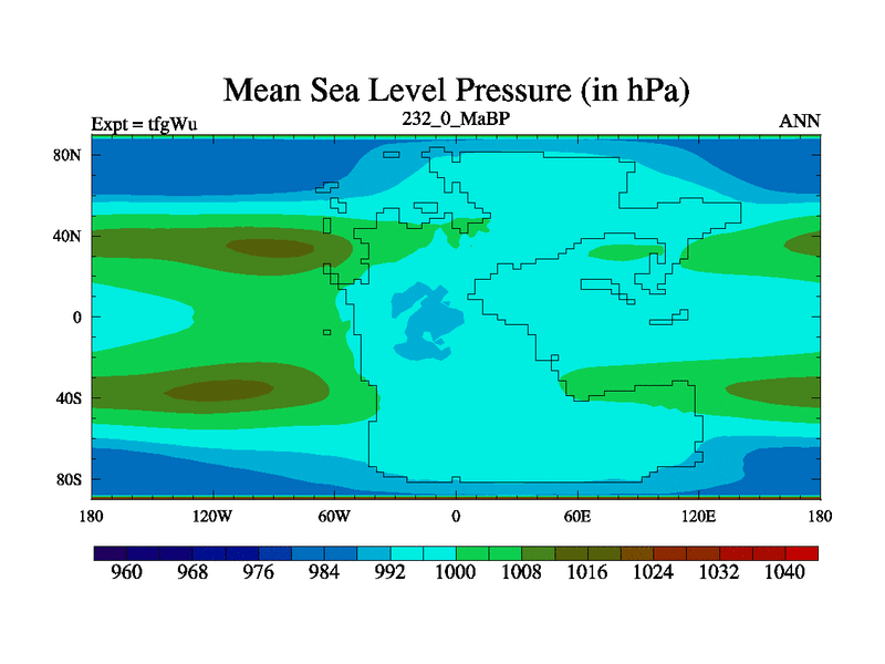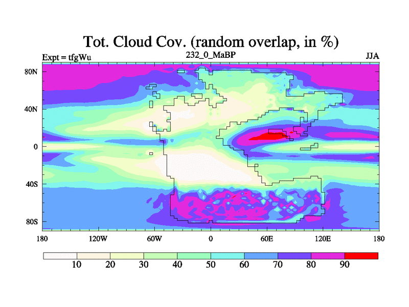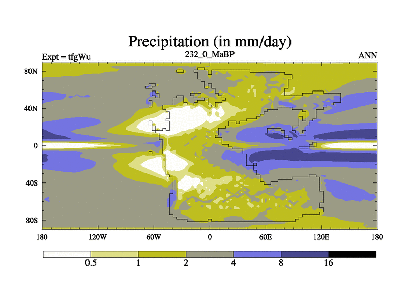 This is the 232.0 Ma simulation using the Scotese palaeogeographies and revised CCN etc. This version has islands included. Started from end of teyEu.