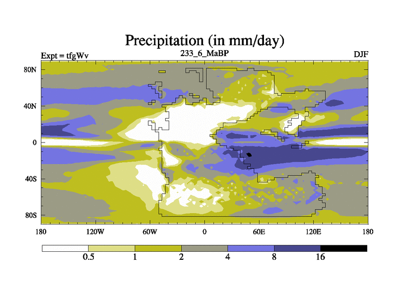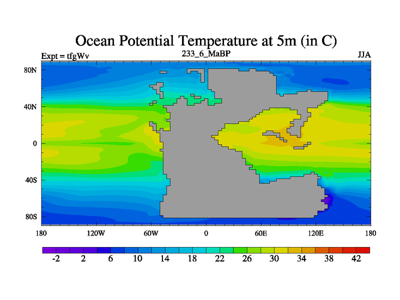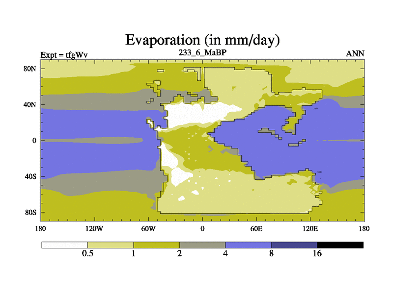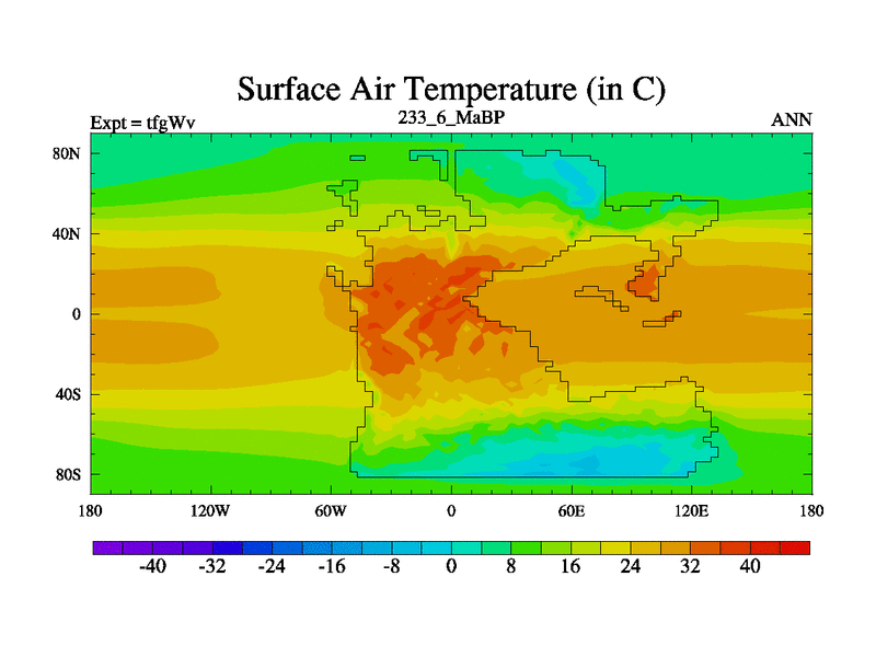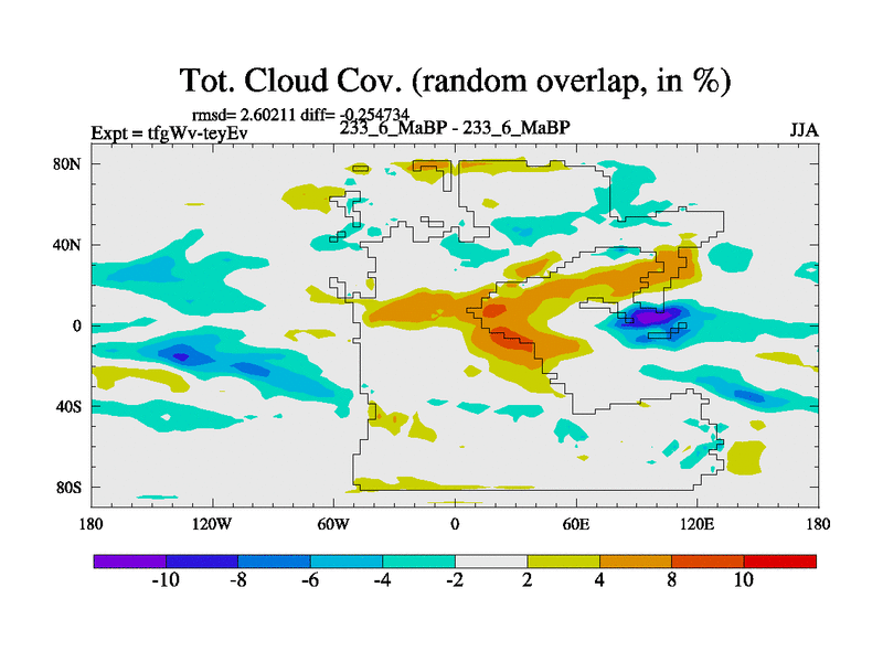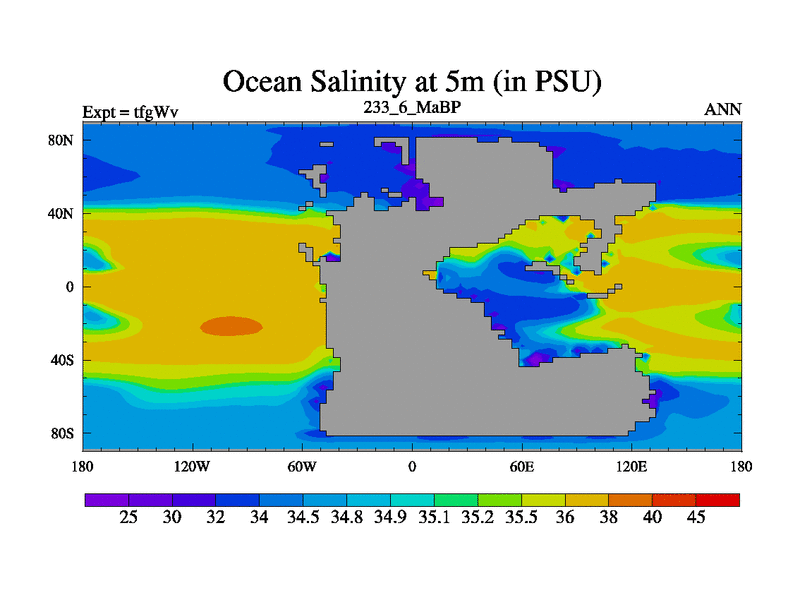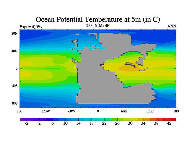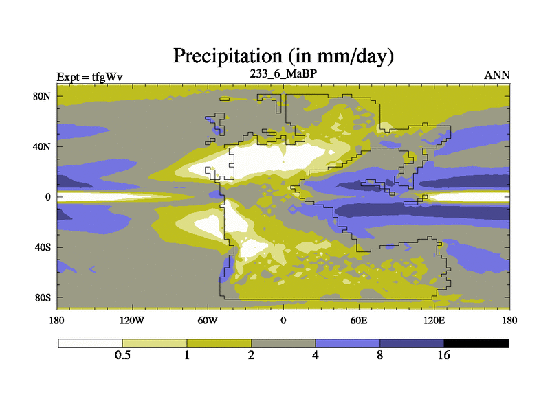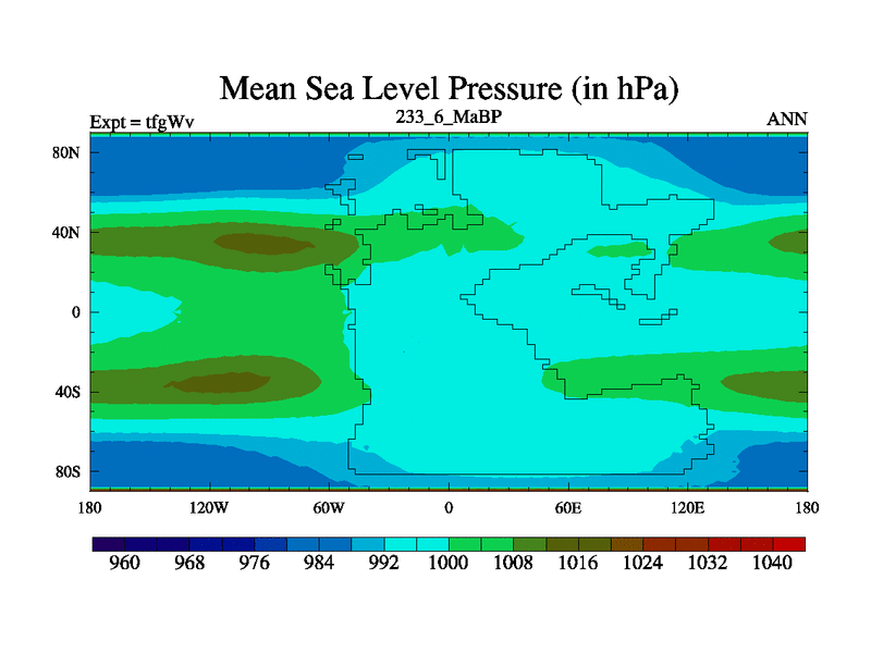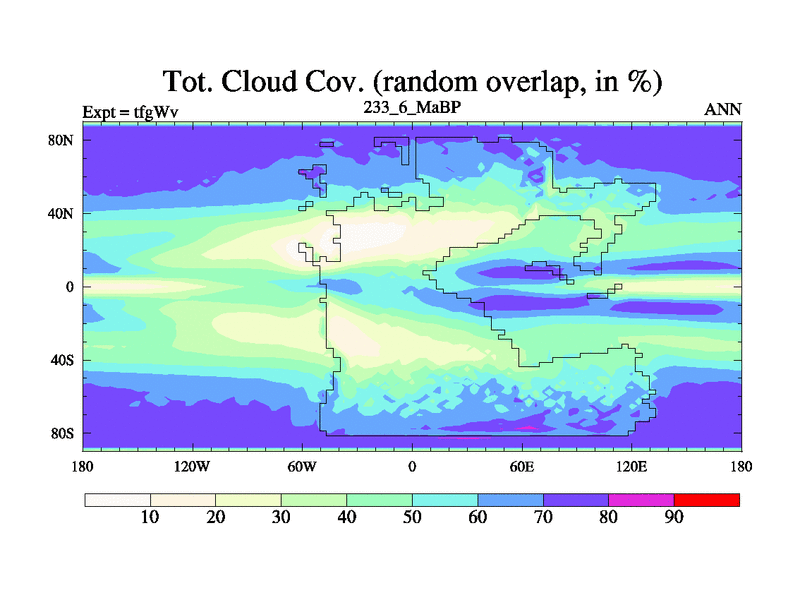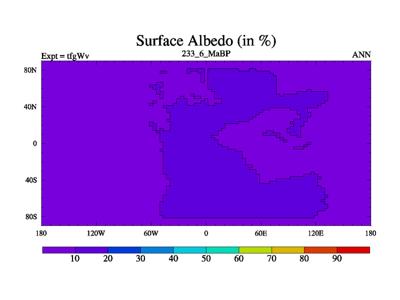 This is the 233.6 Ma simulation using the Scotese palaeogeographies and revised CCN etc. This version has islands included. Started from end of teyEv.