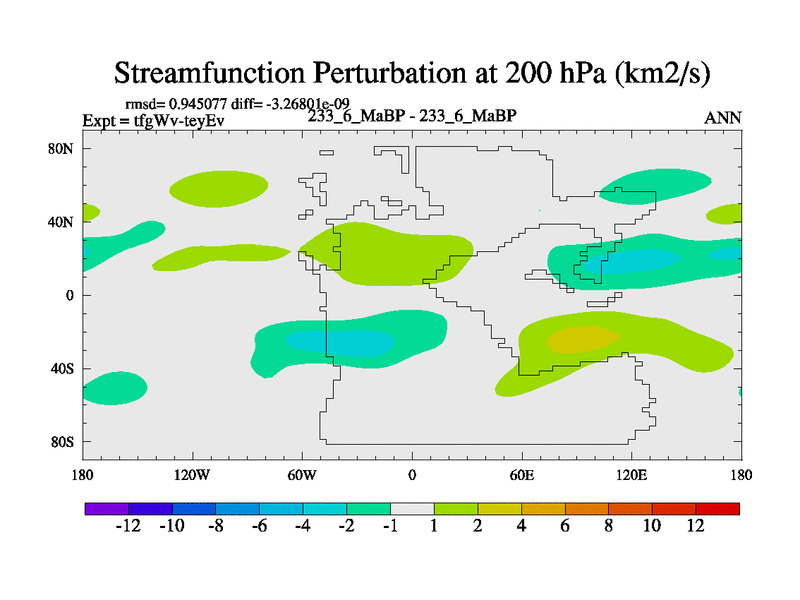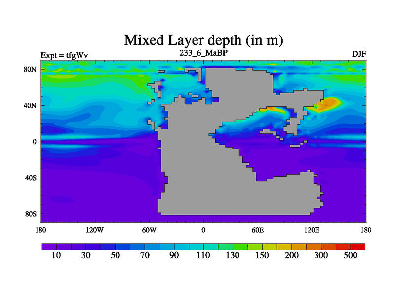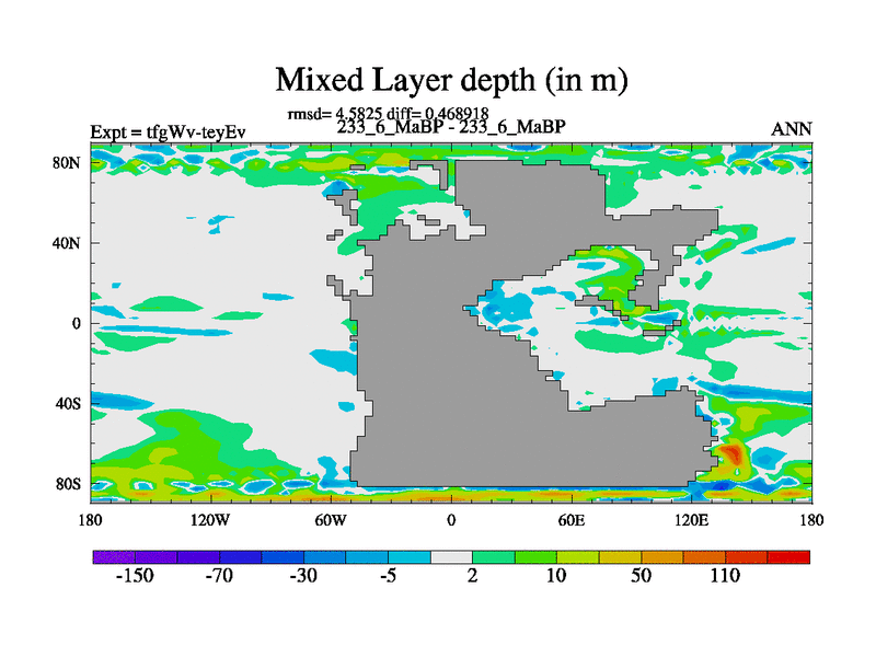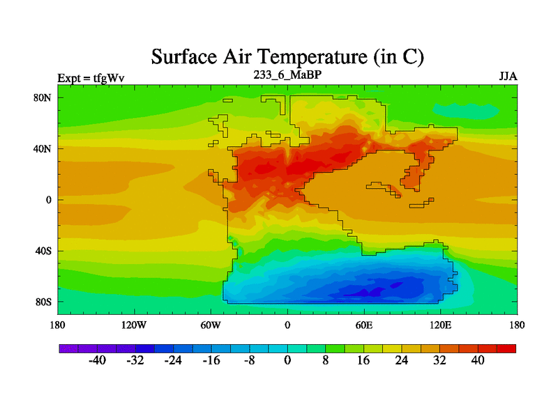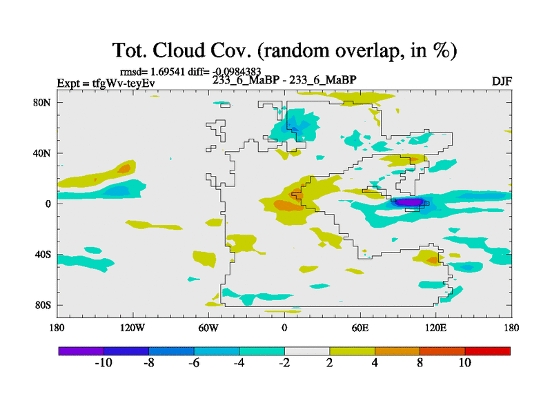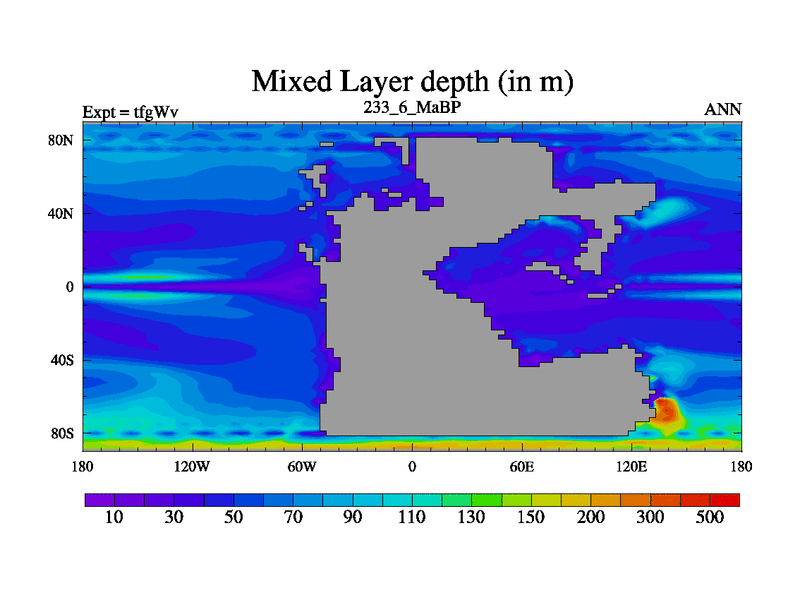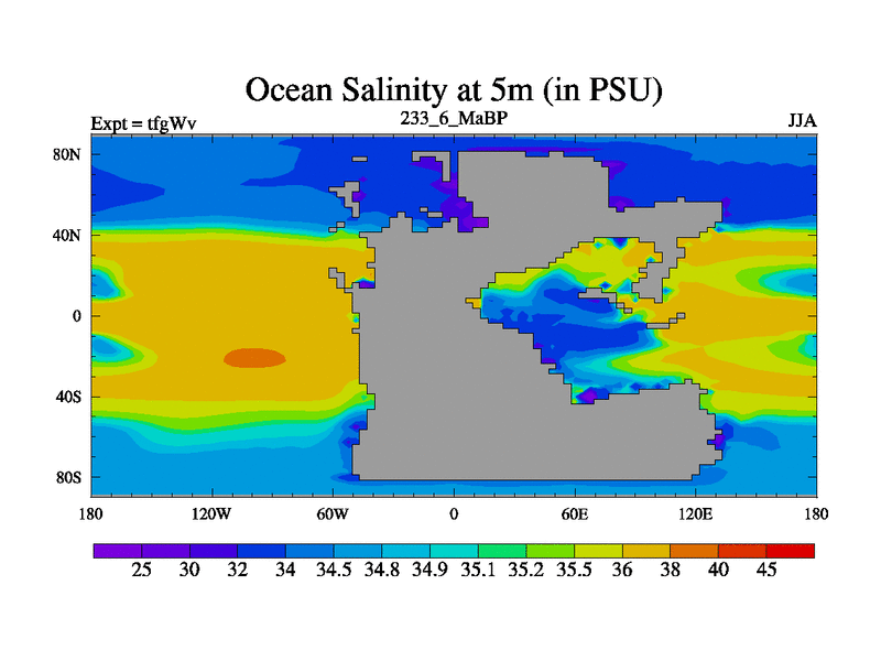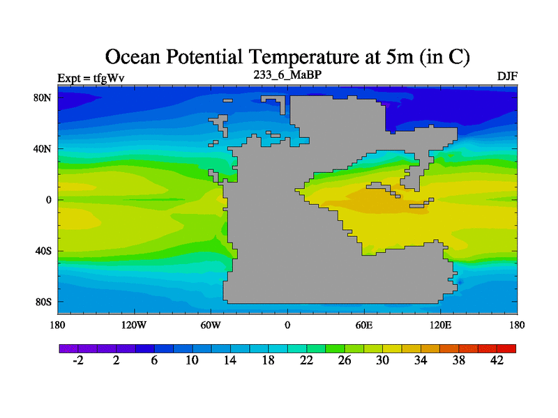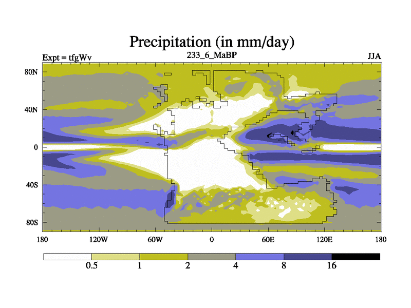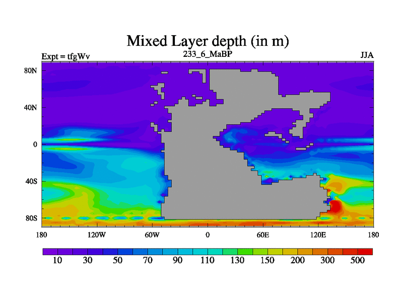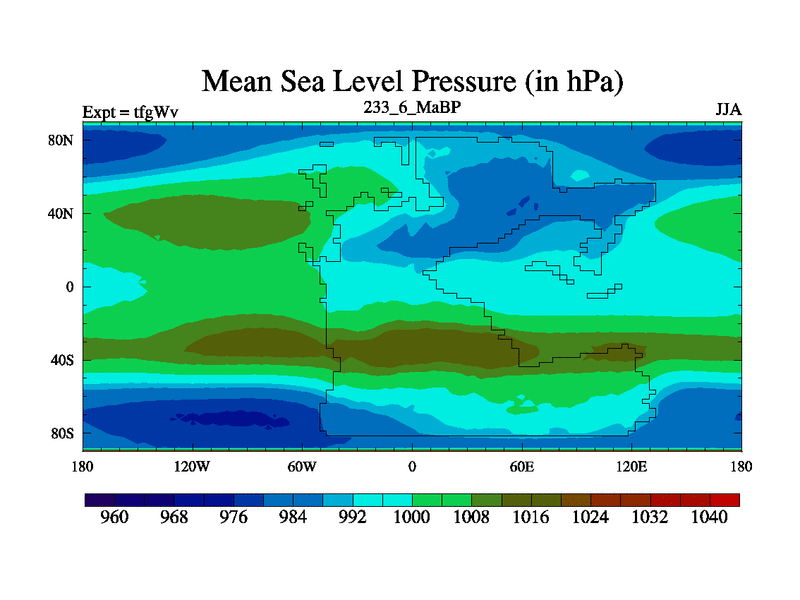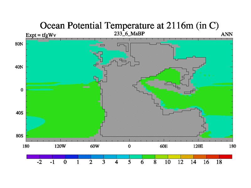 This is the 233.6 Ma simulation using the Scotese palaeogeographies and revised CCN etc. This version has islands included. Started from end of teyEv.