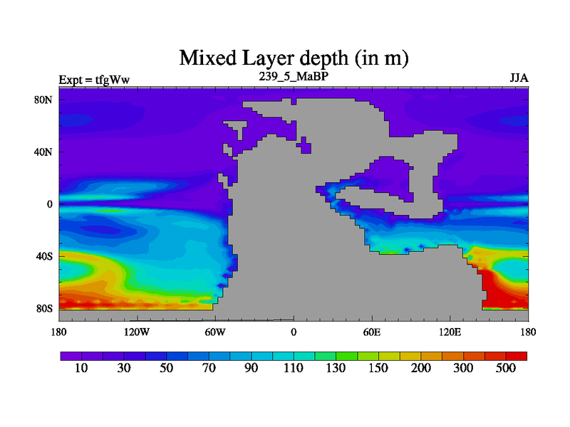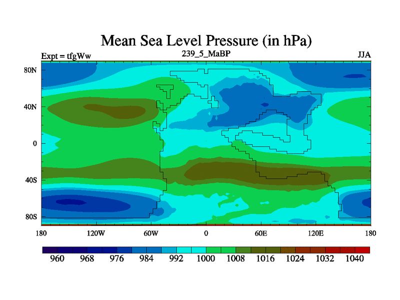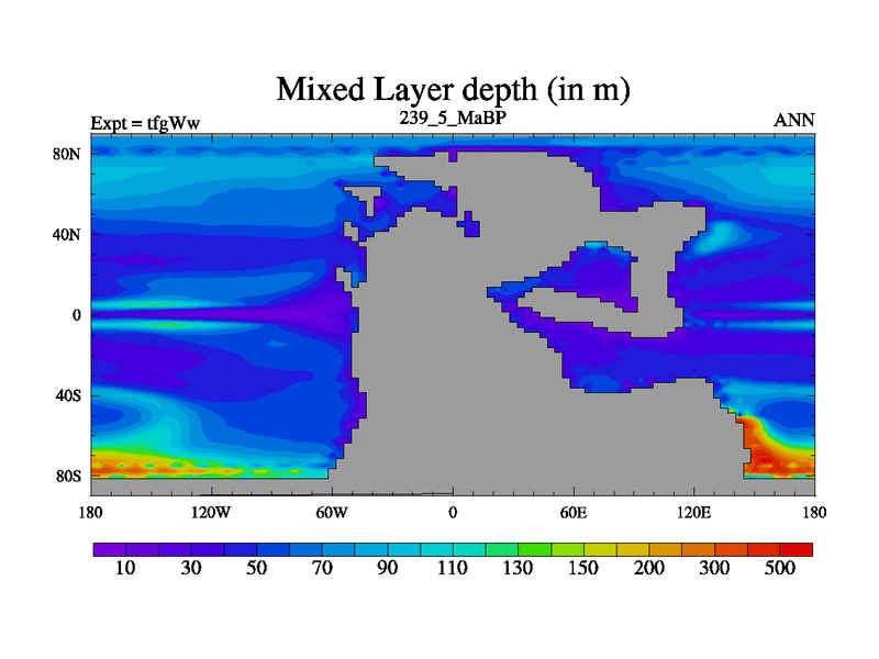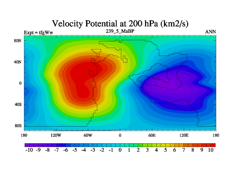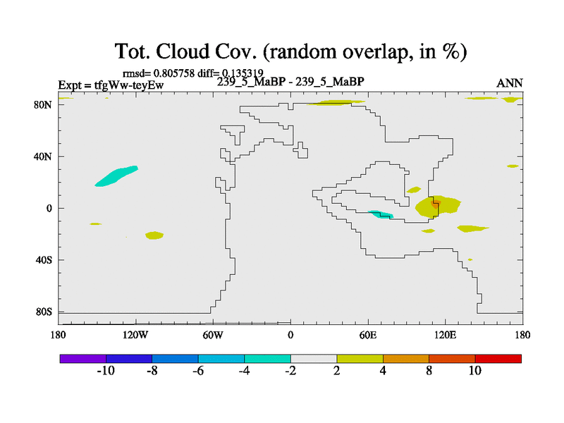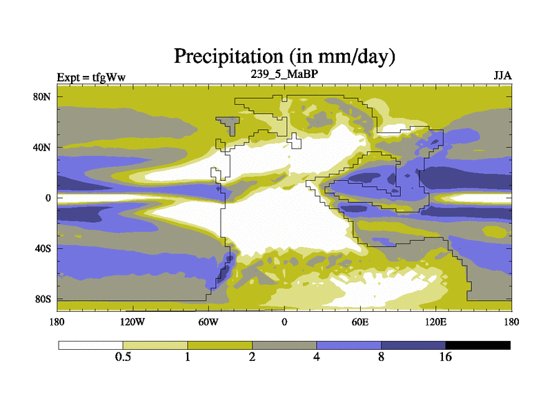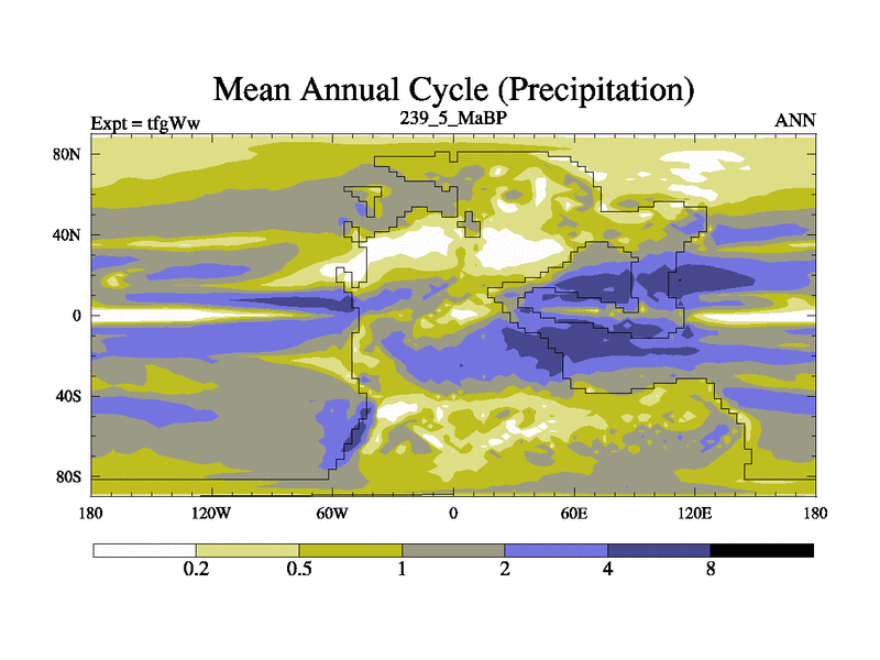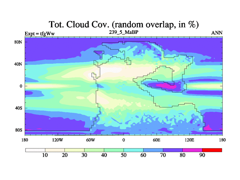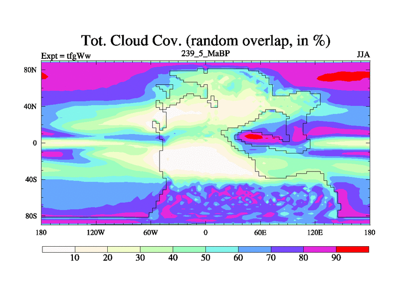 This is the 239.5 Ma simulation using the Scotese palaeogeographies and revised CCN etc. This version has islands included. Started from end of teyEw.
