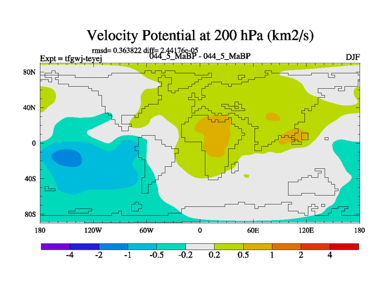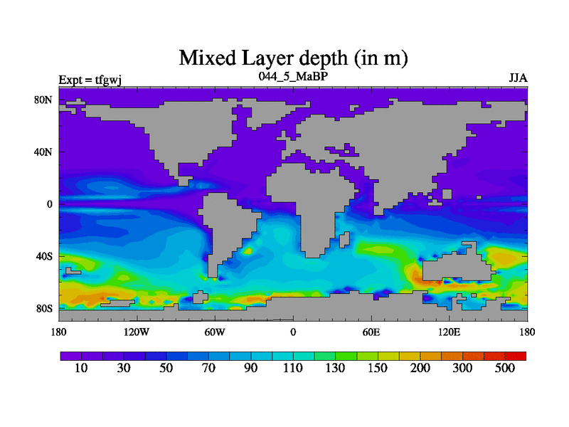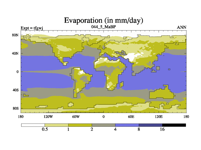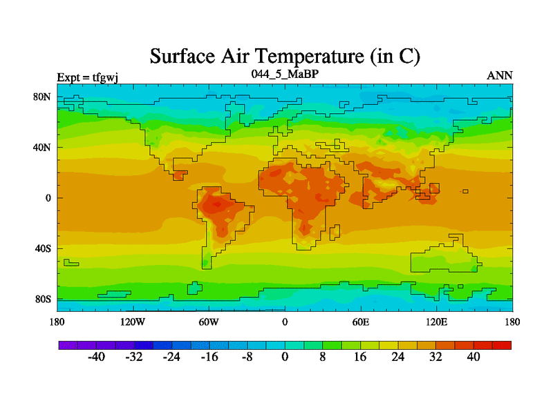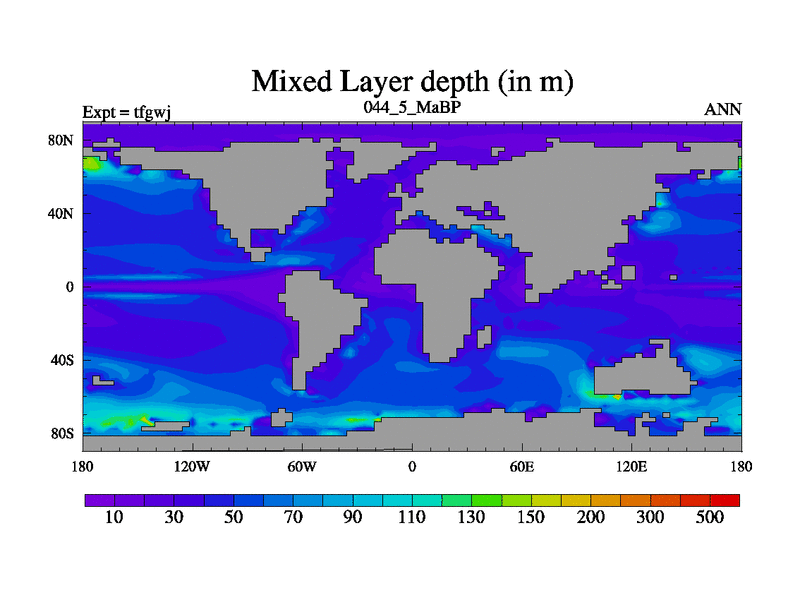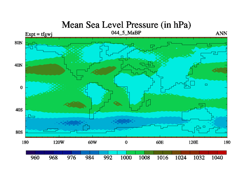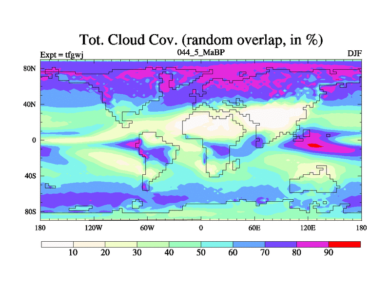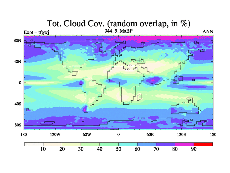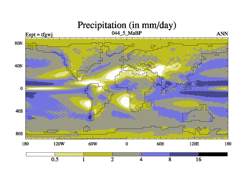 This is the 44.5 Ma simulation using the Scotese palaeogeographies and revised CCN etc. This version has islands included. Started from end of teyej.
