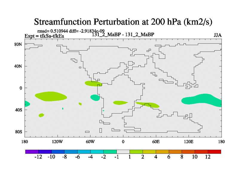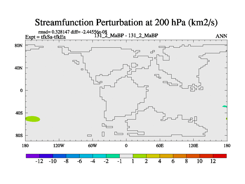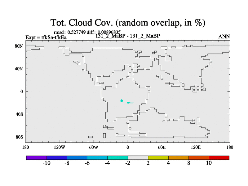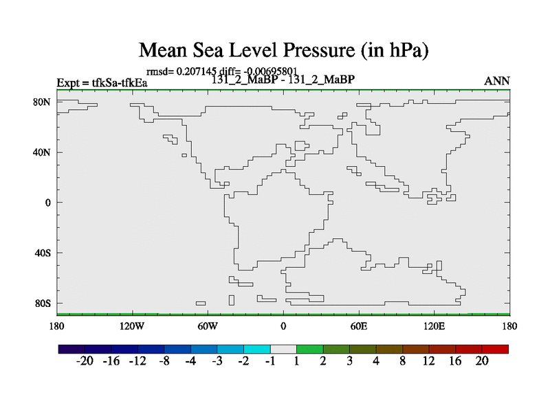 Scientifically as benchmark except using water age update, dark respiration, salinity conservation and revised ozone. Also using new orbital and solar update, and outputting leaf CO2. This version has islands included and atmospheric smoothing and desert albedo. Tuned CO2 to give Scotese temperatures. Started from end of tfkEa.
