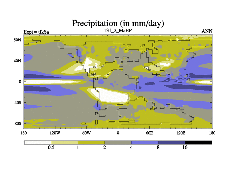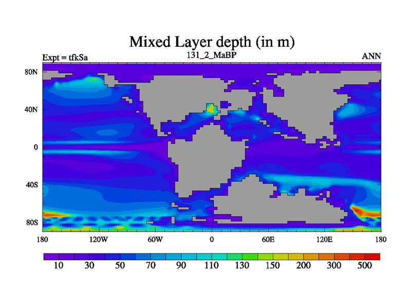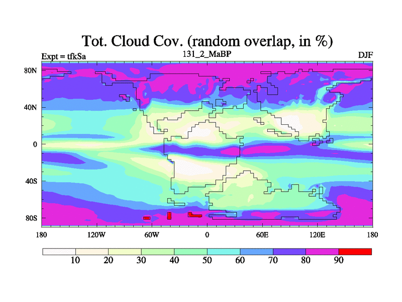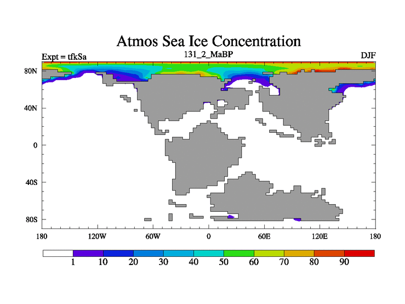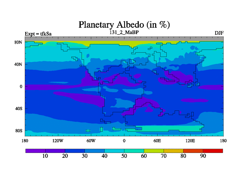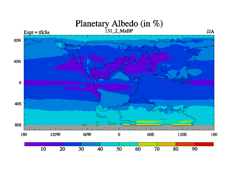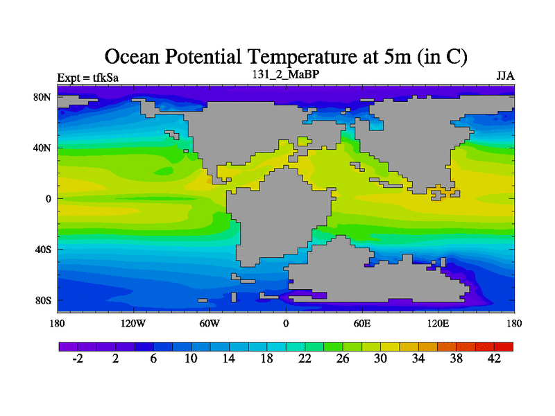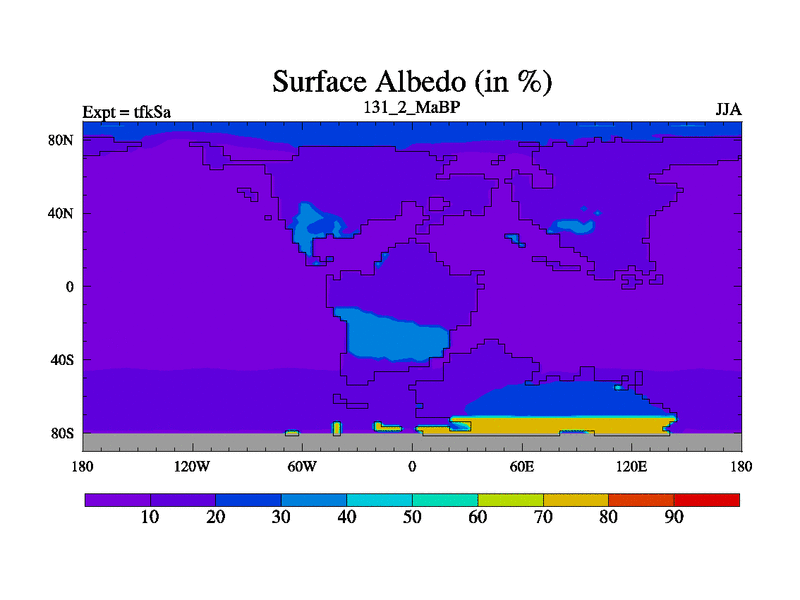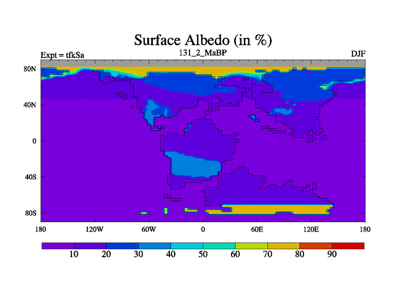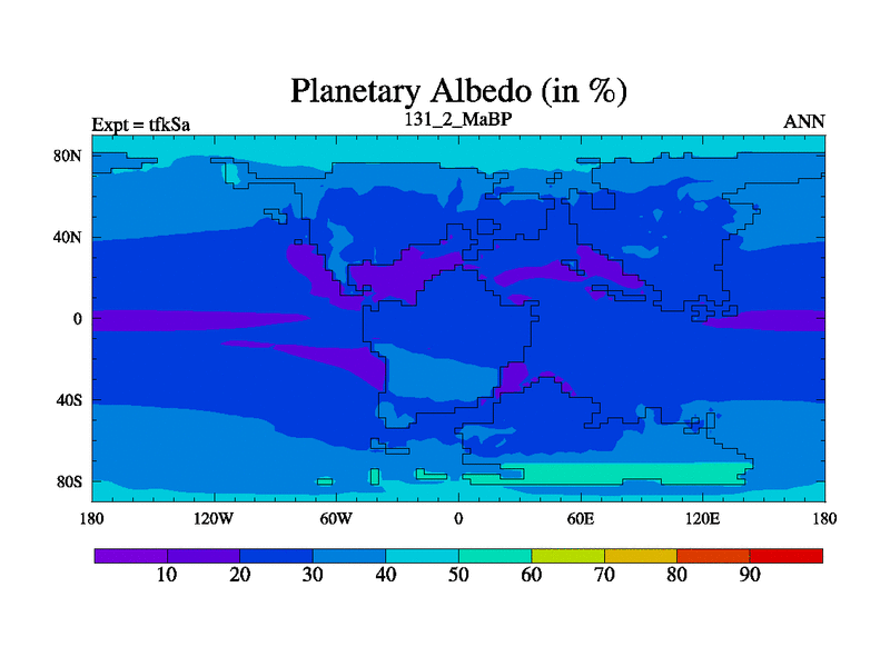This is the 131.2 Ma simulation using the Scotese palaeogeographies and revised CCN etc. This version has islands and smoothing and desert albedo included. Tuned CO2 to give Scotese temperatures. Started from end of tfkEa.