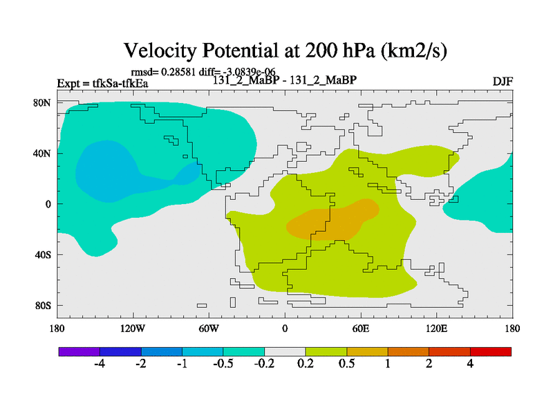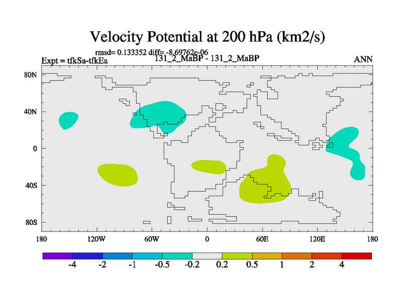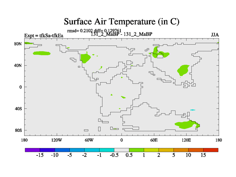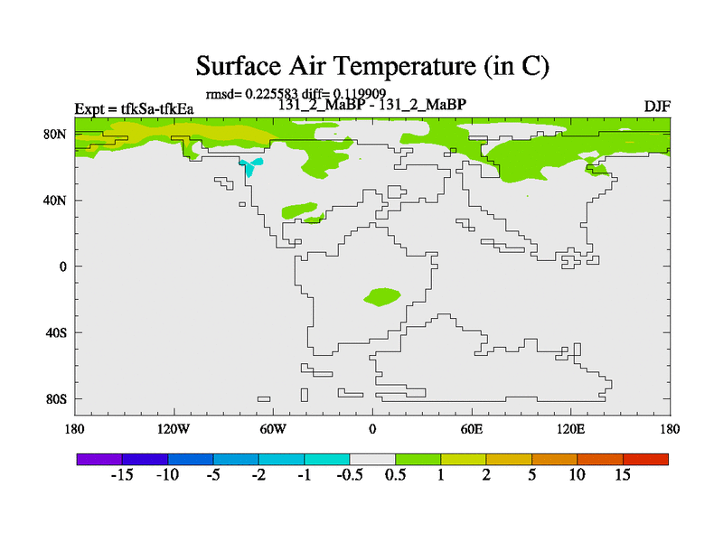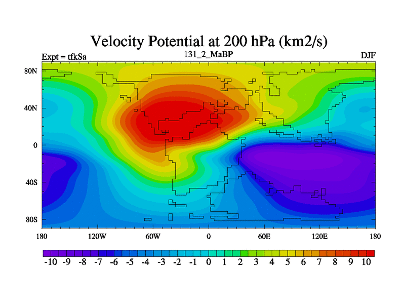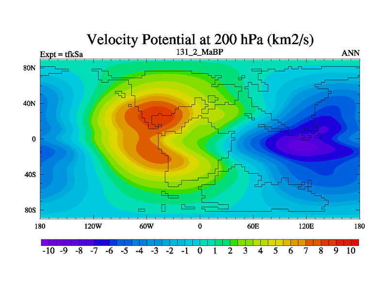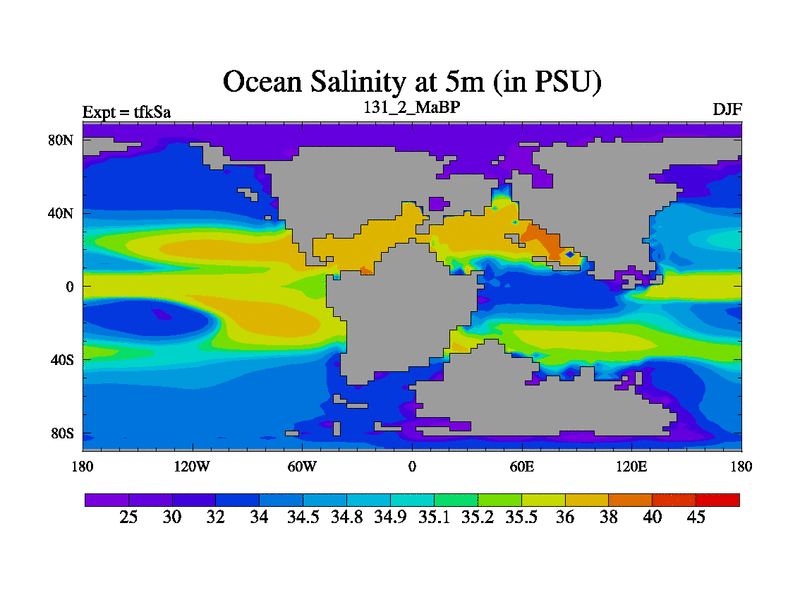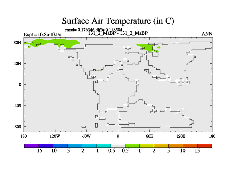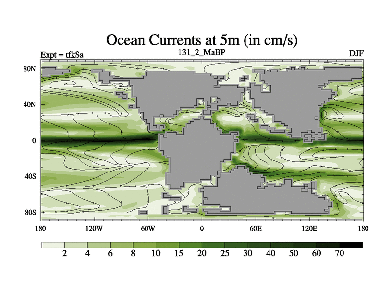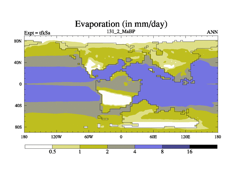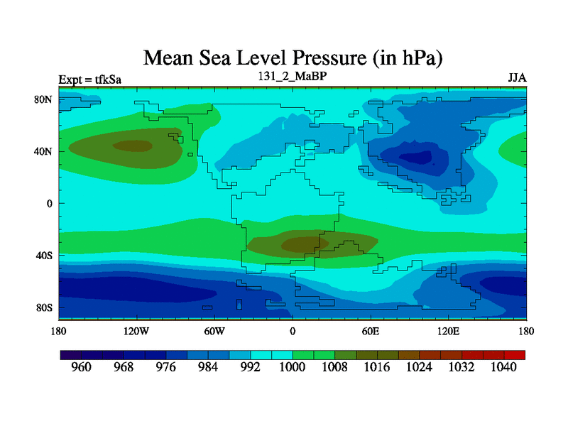 This is the 131.2 Ma simulation using the Scotese palaeogeographies and revised CCN etc. This version has islands and smoothing and desert albedo included. Tuned CO2 to give Scotese temperatures. Started from end of tfkEa.