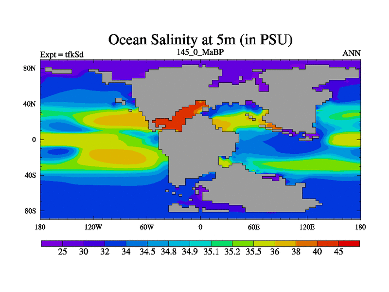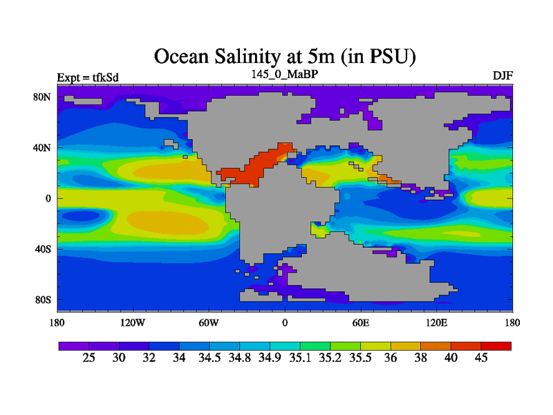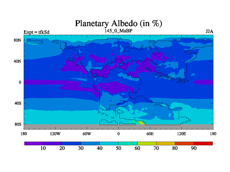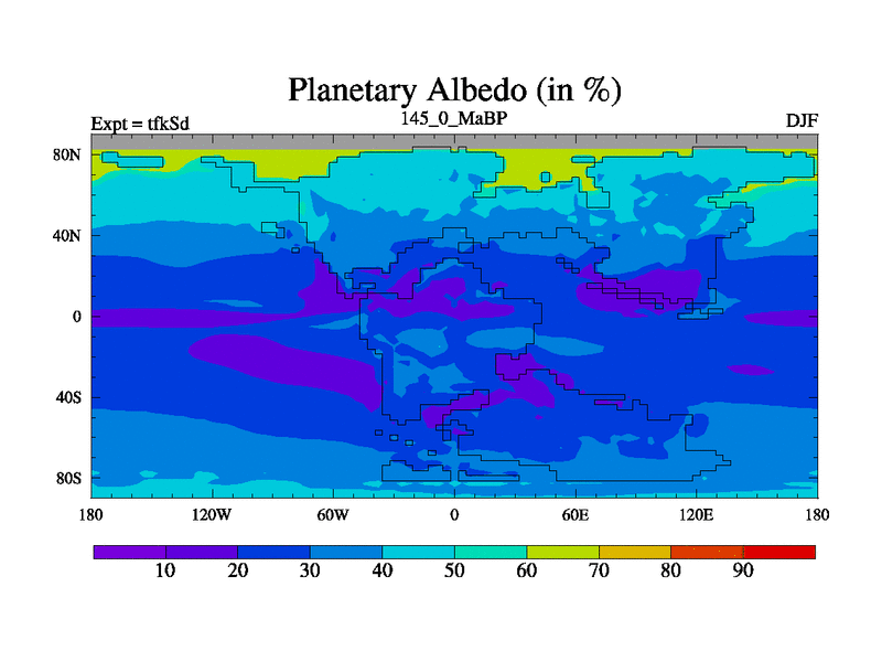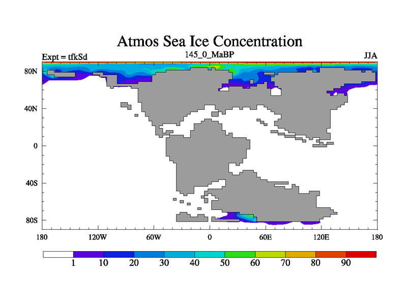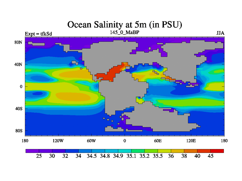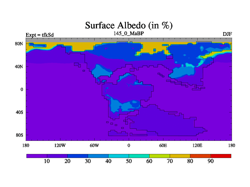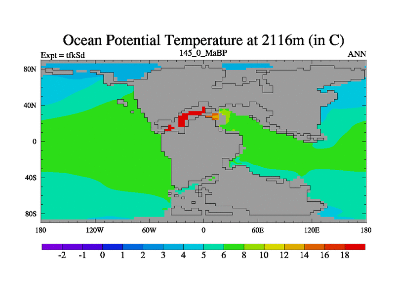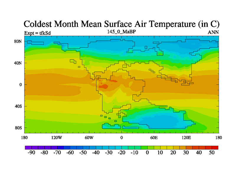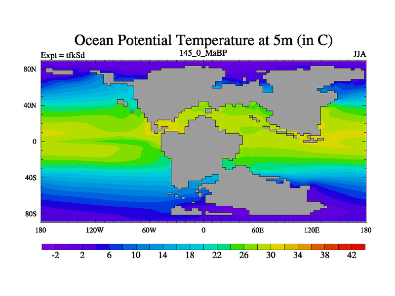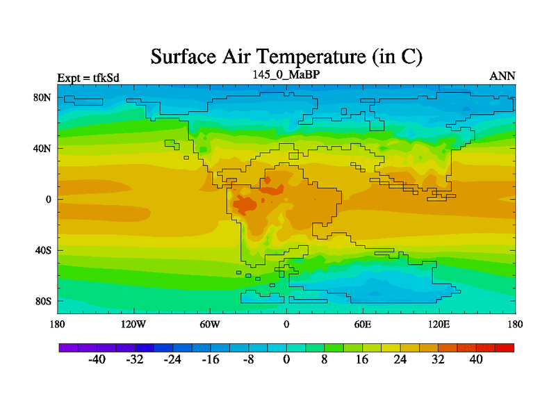 This is the 145.0 Ma simulation using the Scotese palaeogeographies and revised CCN etc. This version has islands and smoothing and desert albedo included. Tuned CO2 to give Scotese temperatures. Started from end of tfkEd.
