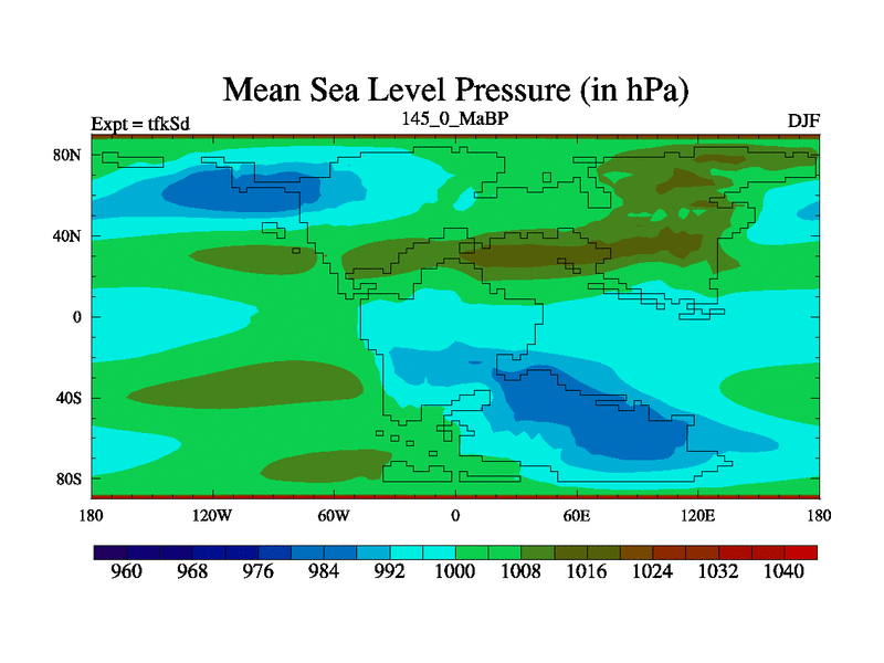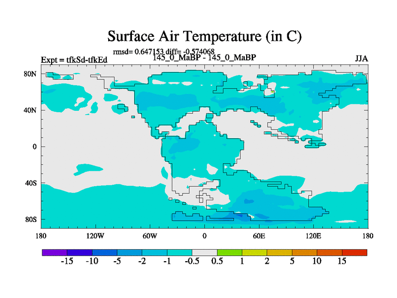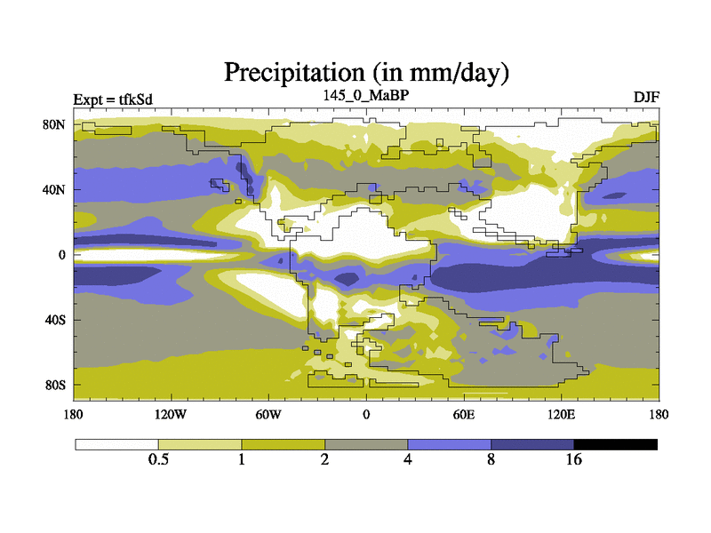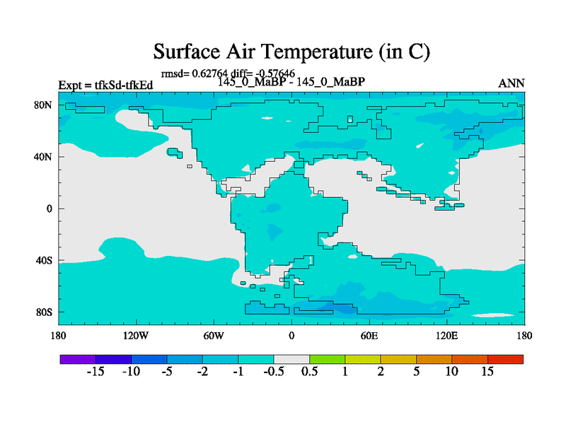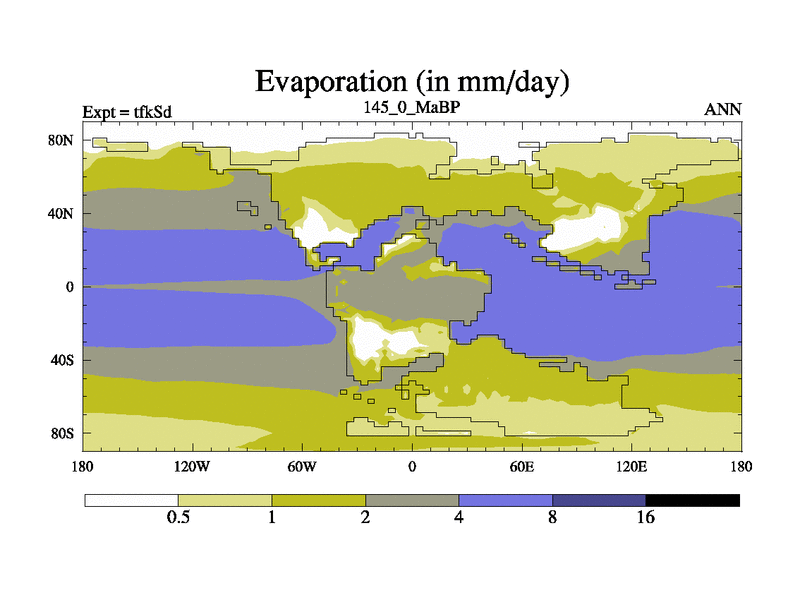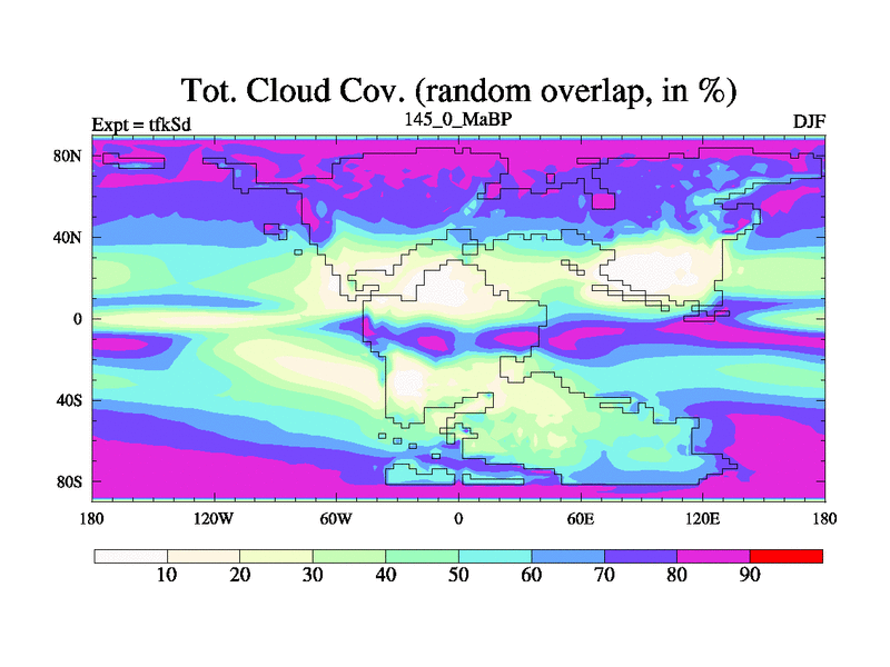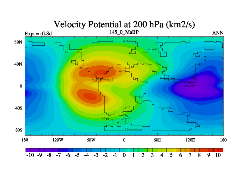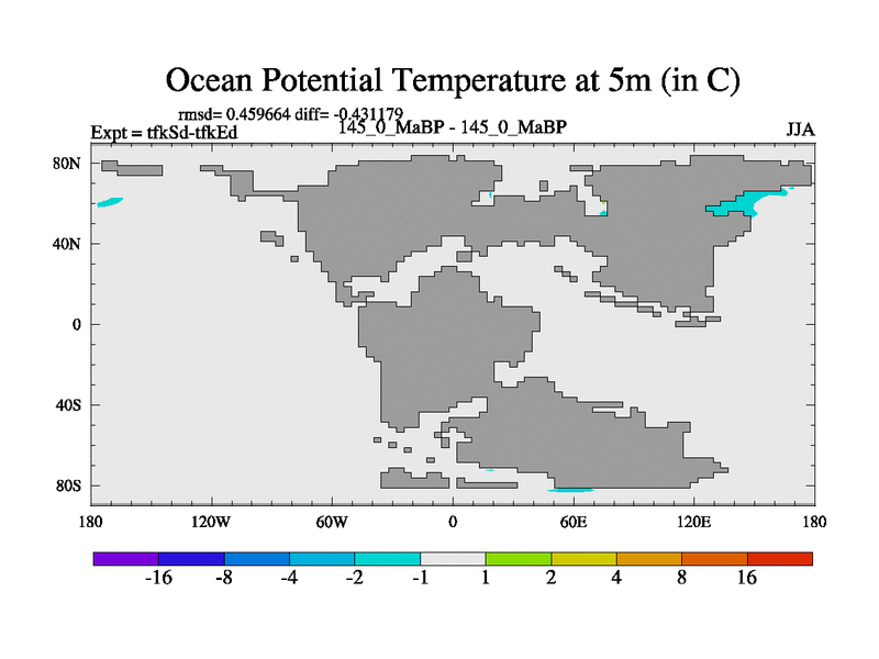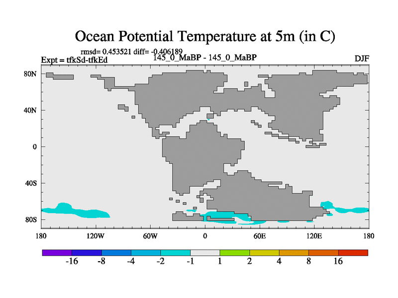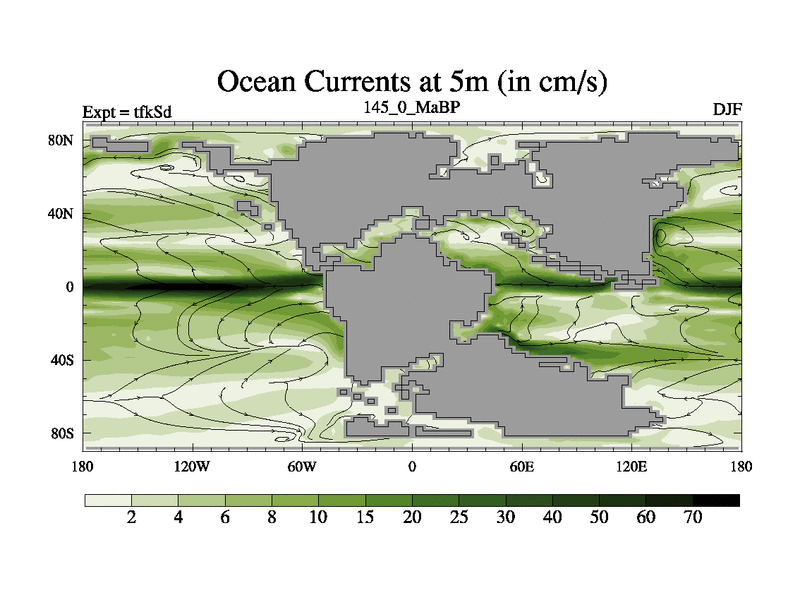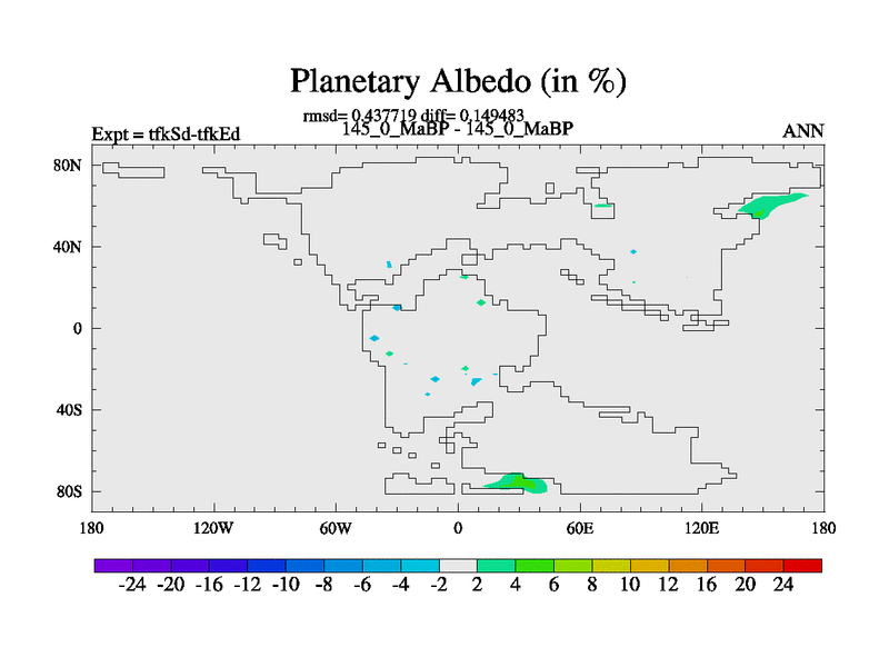 This is the 145.0 Ma simulation using the Scotese palaeogeographies and revised CCN etc. This version has islands and smoothing and desert albedo included. Tuned CO2 to give Scotese temperatures. Started from end of tfkEd.