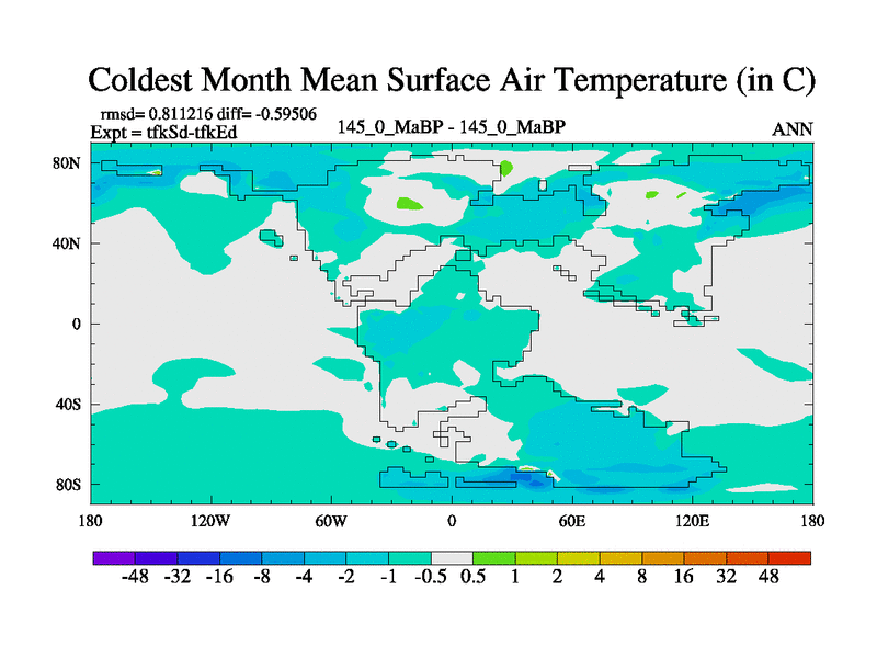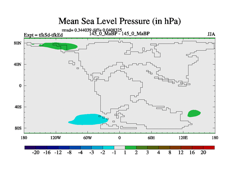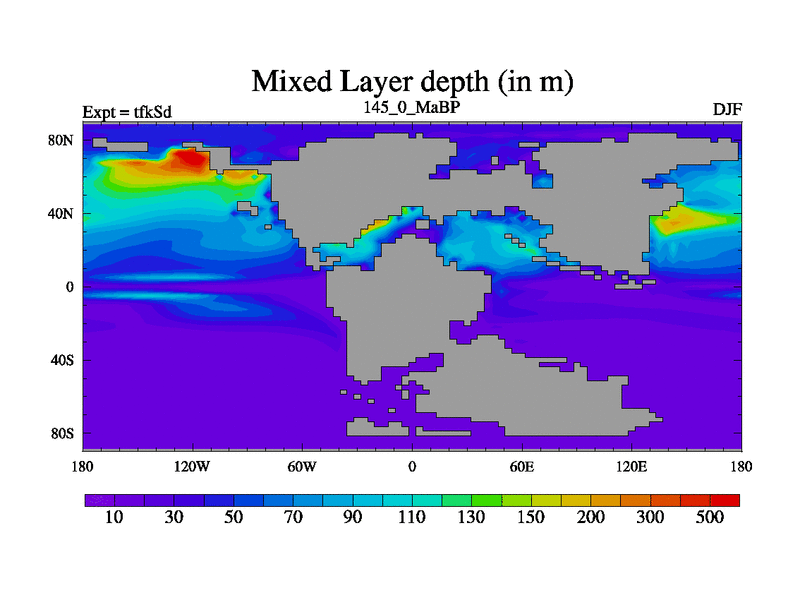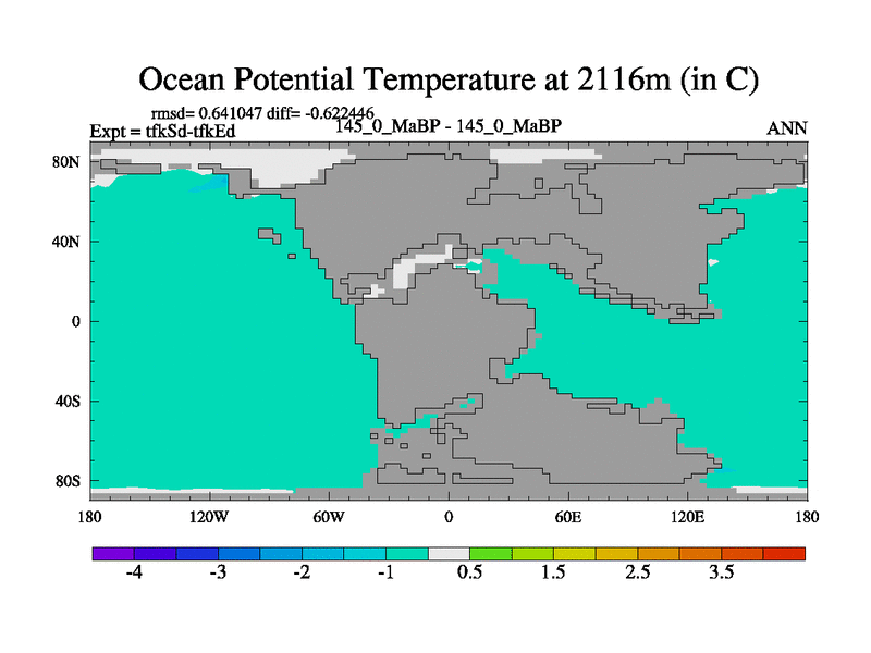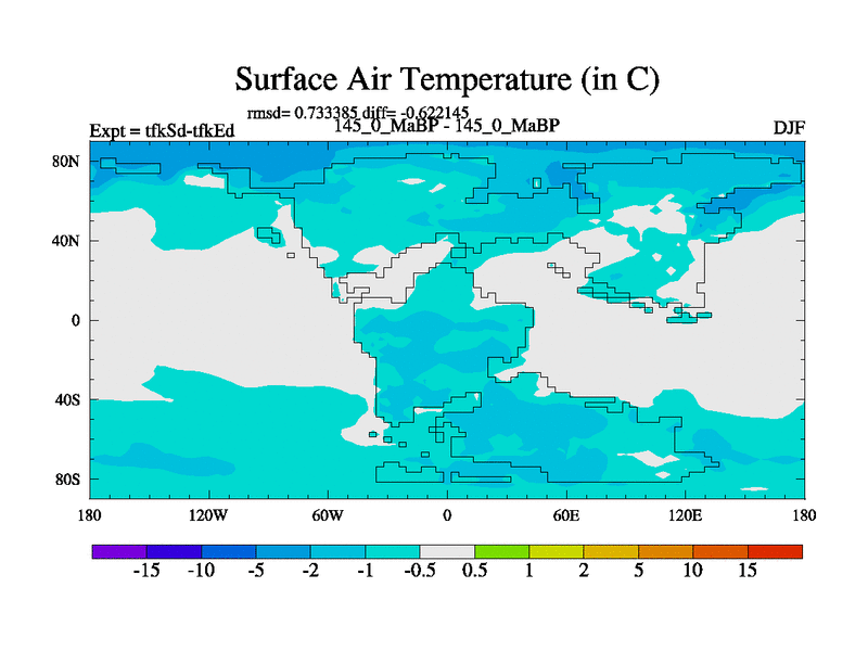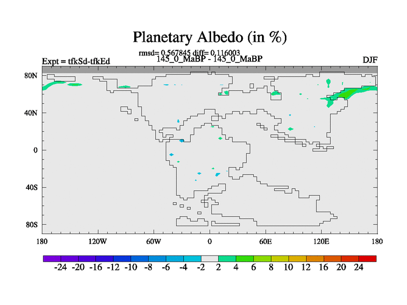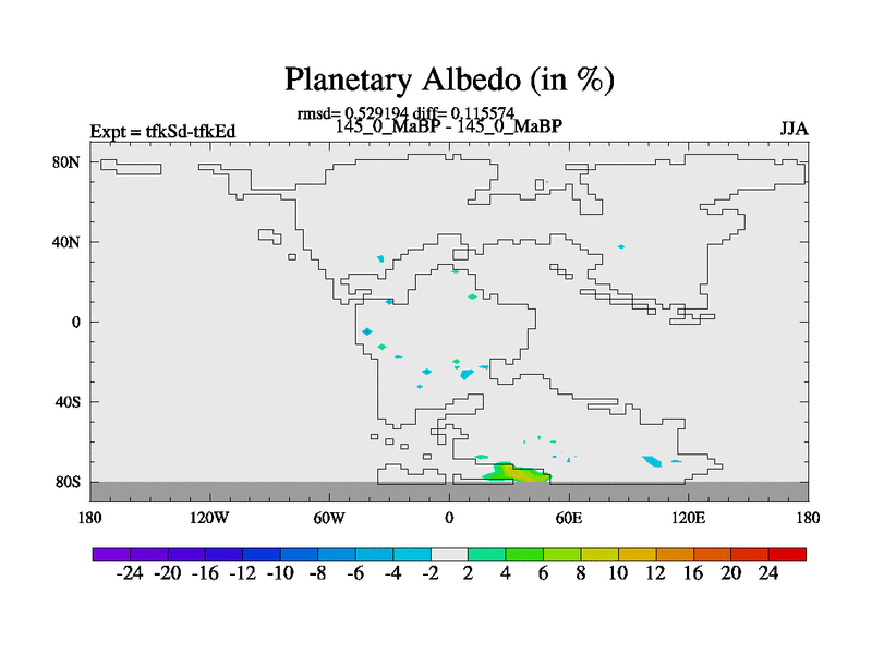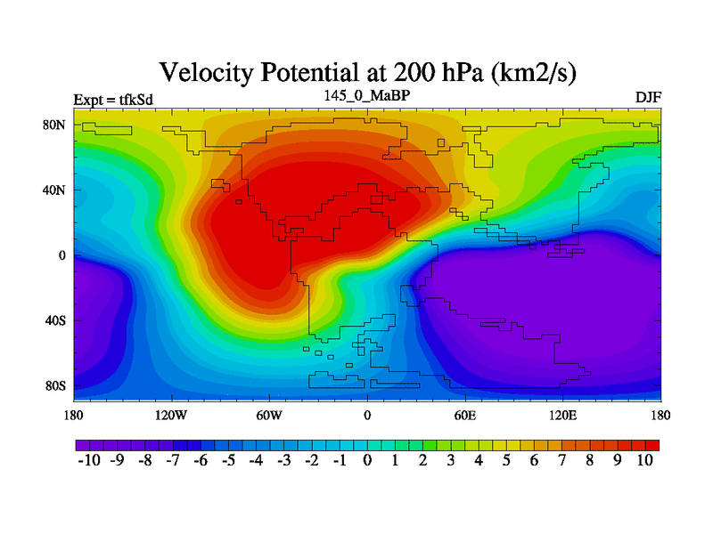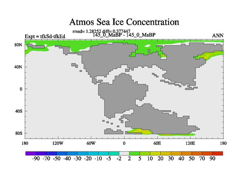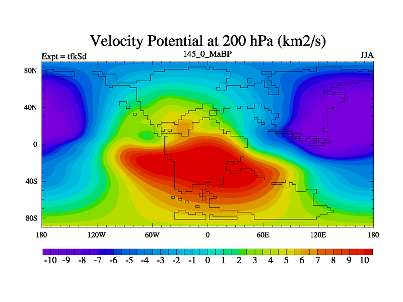 This is the 145.0 Ma simulation using the Scotese palaeogeographies and revised CCN etc. This version has islands and smoothing and desert albedo included. Tuned CO2 to give Scotese temperatures. Started from end of tfkEd.