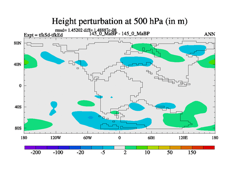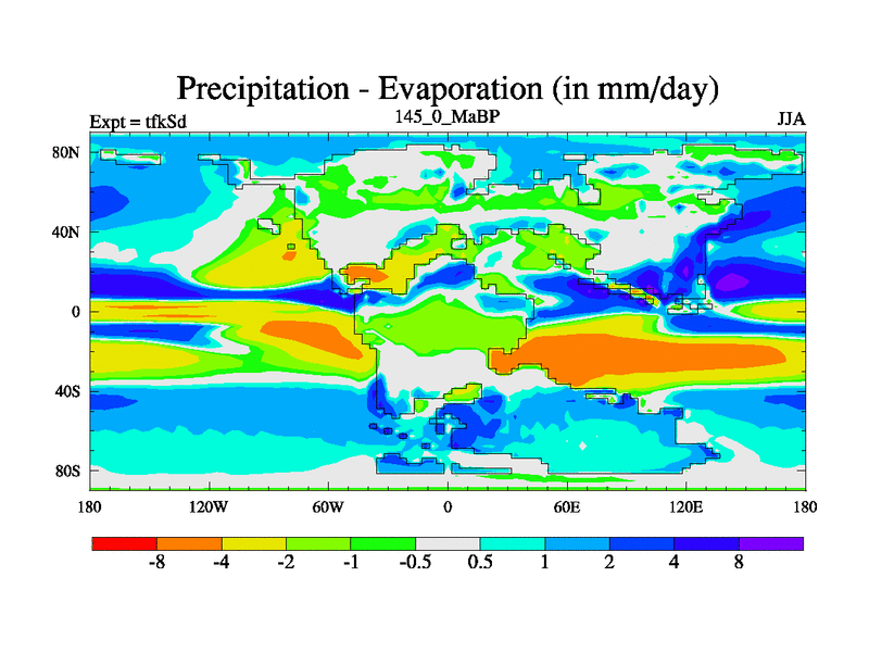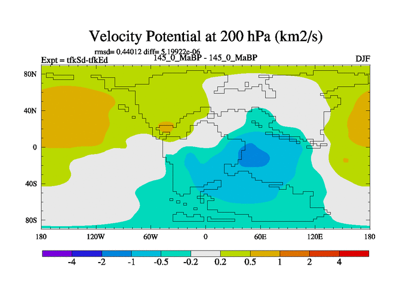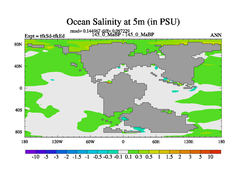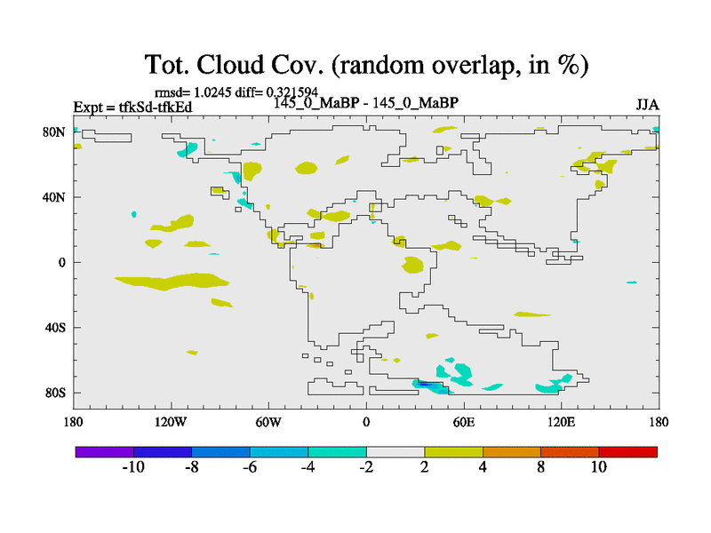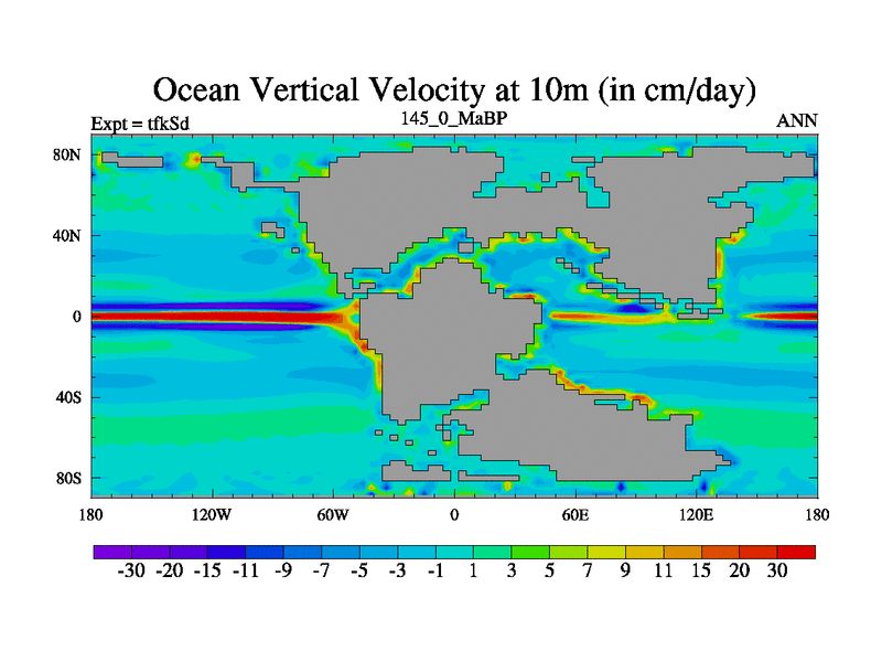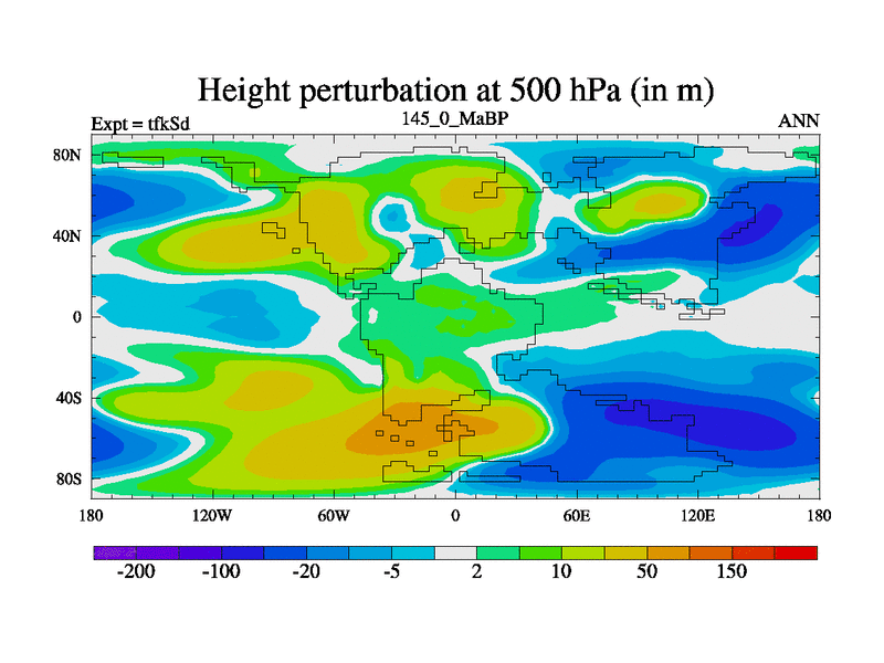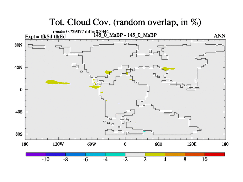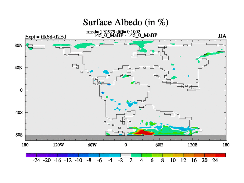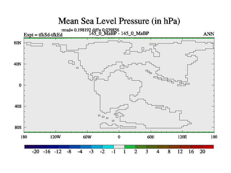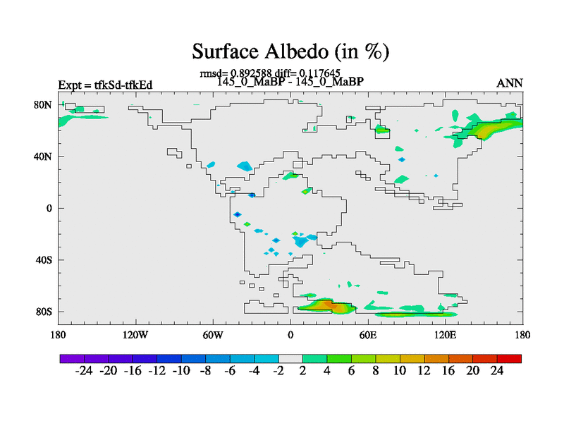 This is the 145.0 Ma simulation using the Scotese palaeogeographies and revised CCN etc. This version has islands and smoothing and desert albedo included. Tuned CO2 to give Scotese temperatures. Started from end of tfkEd.