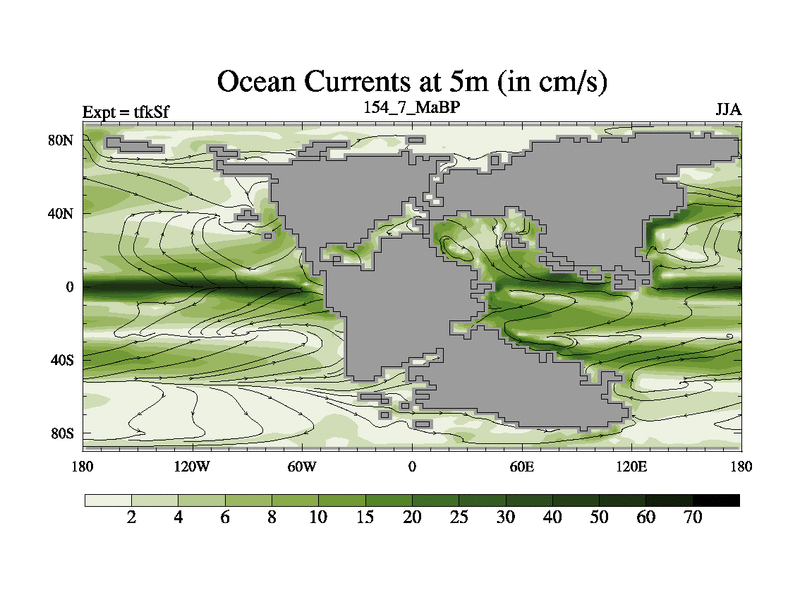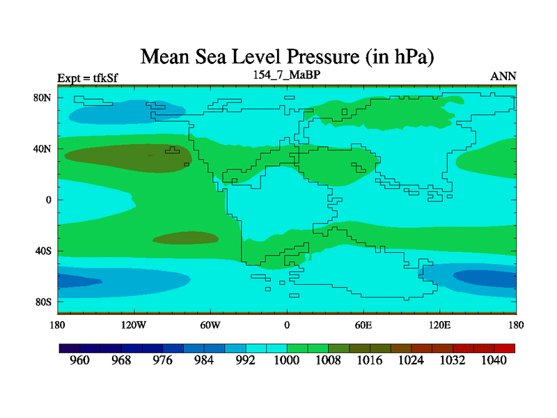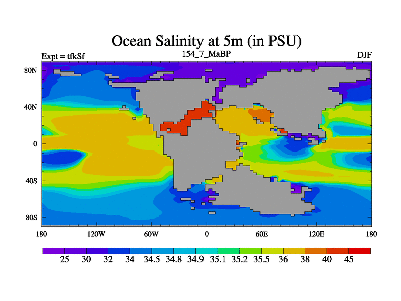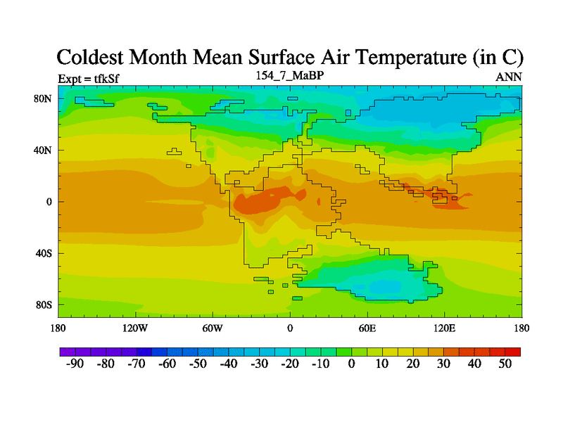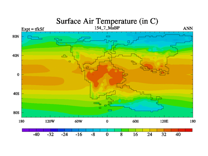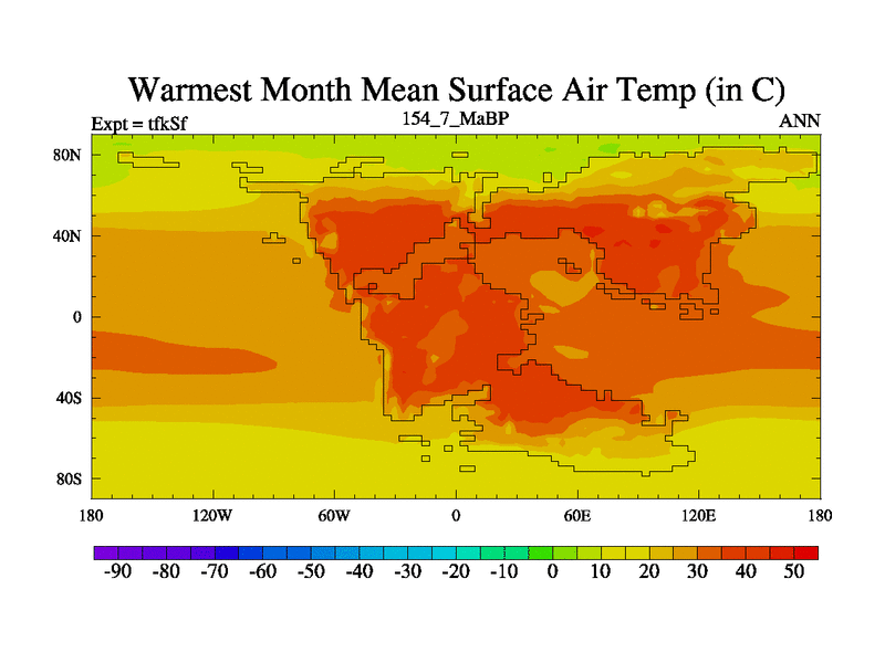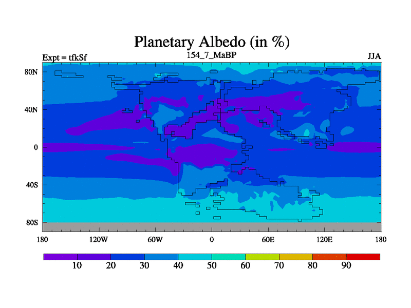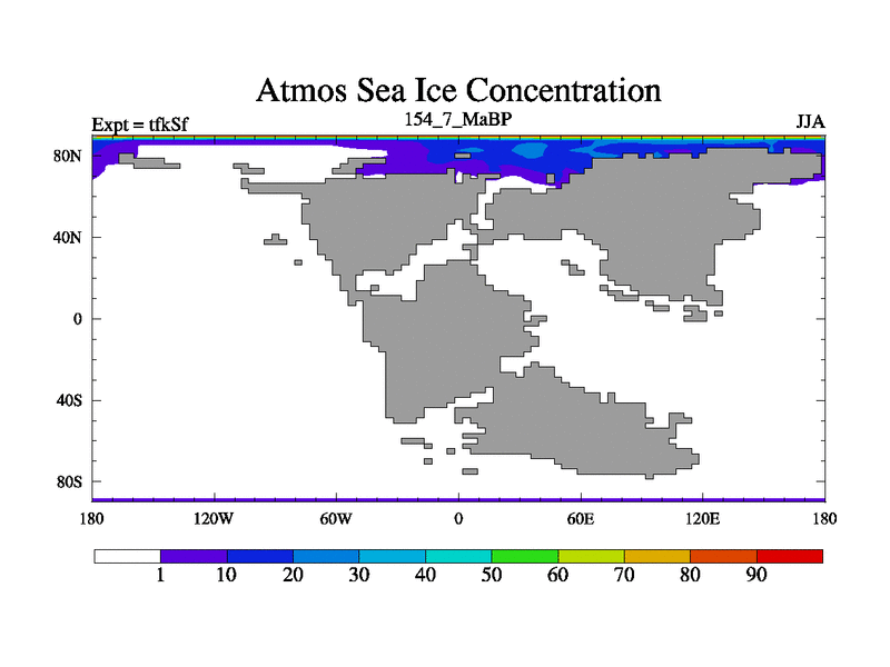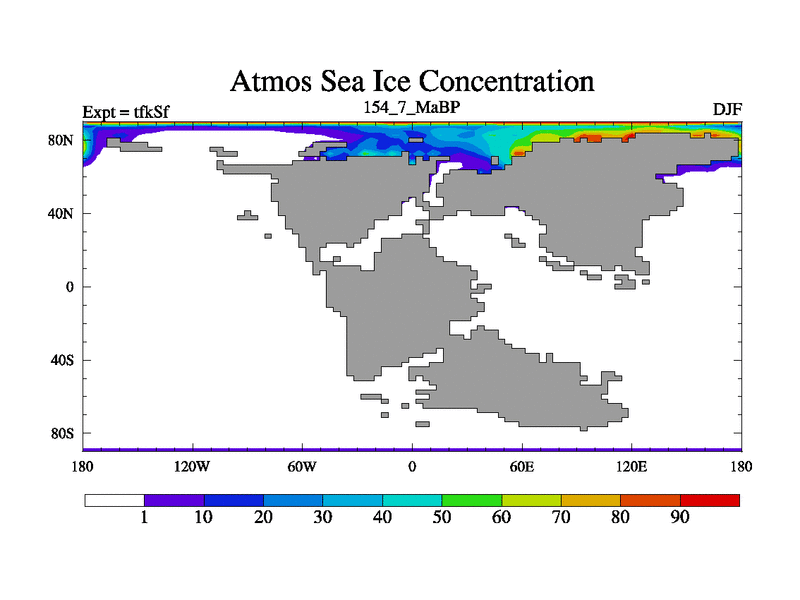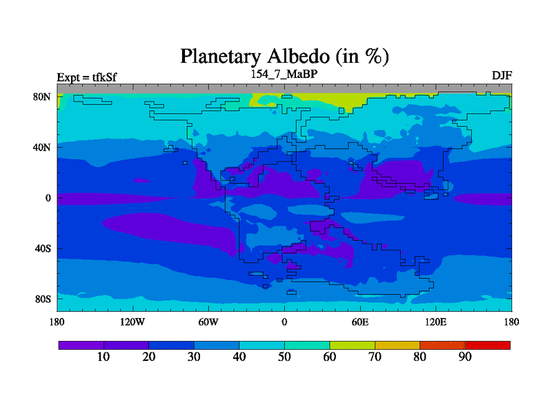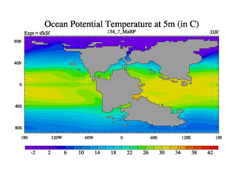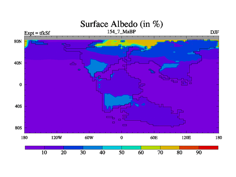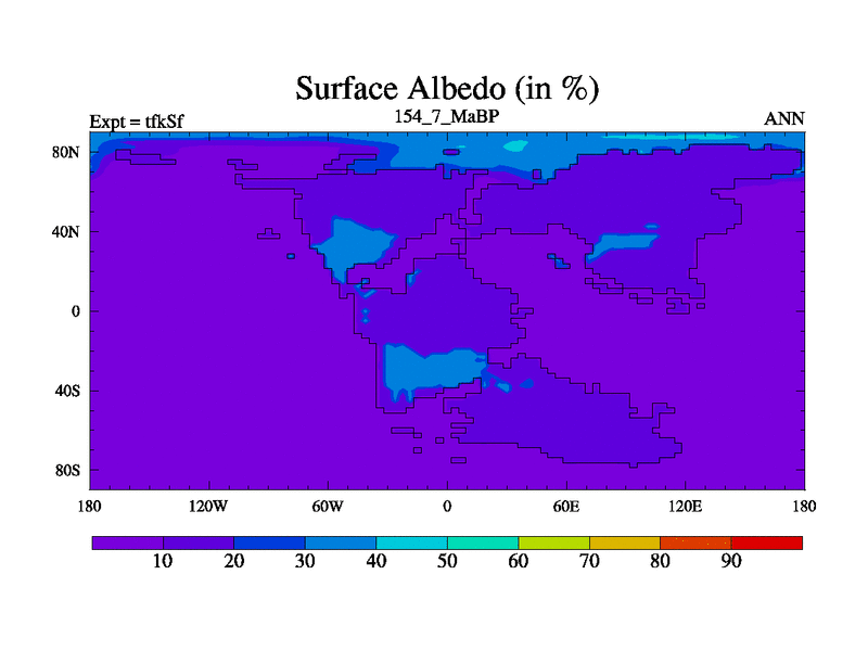 This is the 154.7 Ma simulation using the Scotese palaeogeographies and revised CCN etc. This version has islands and smoothing and desert albedo included. Tuned CO2 to give Scotese temperatures. Started from end of tfkEf.