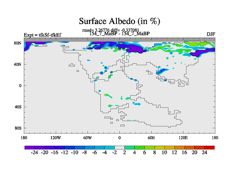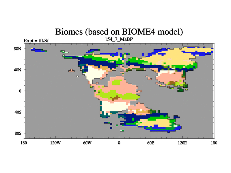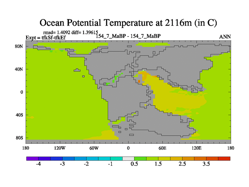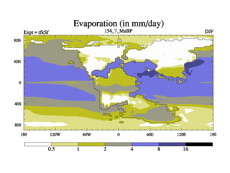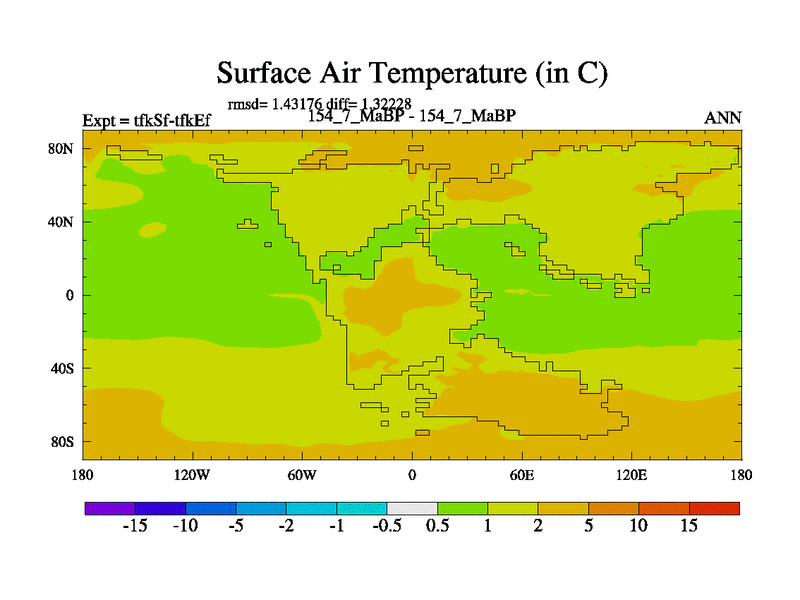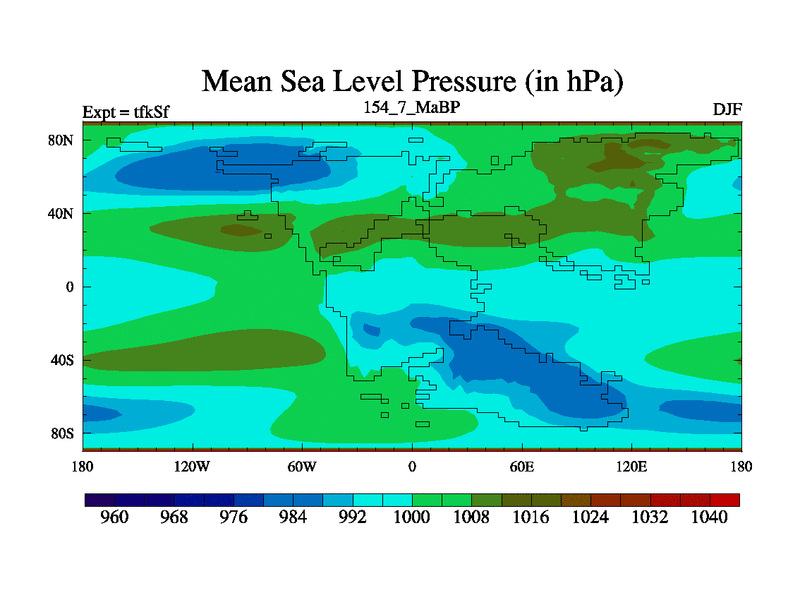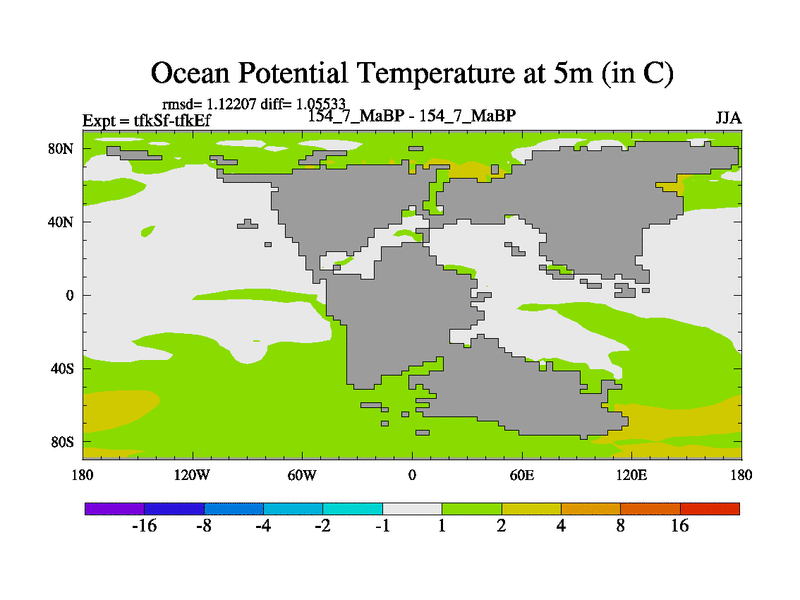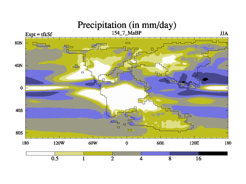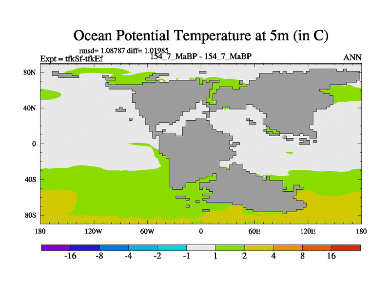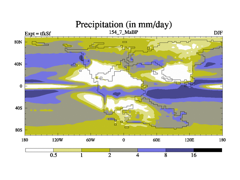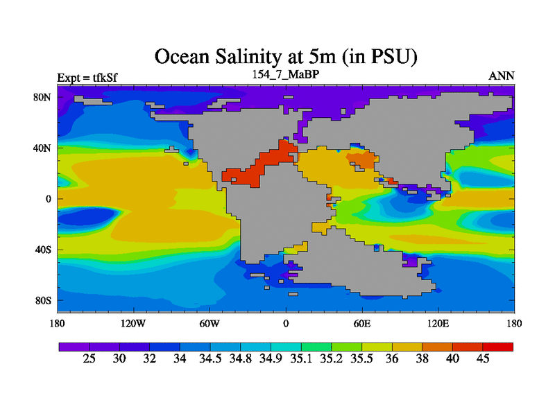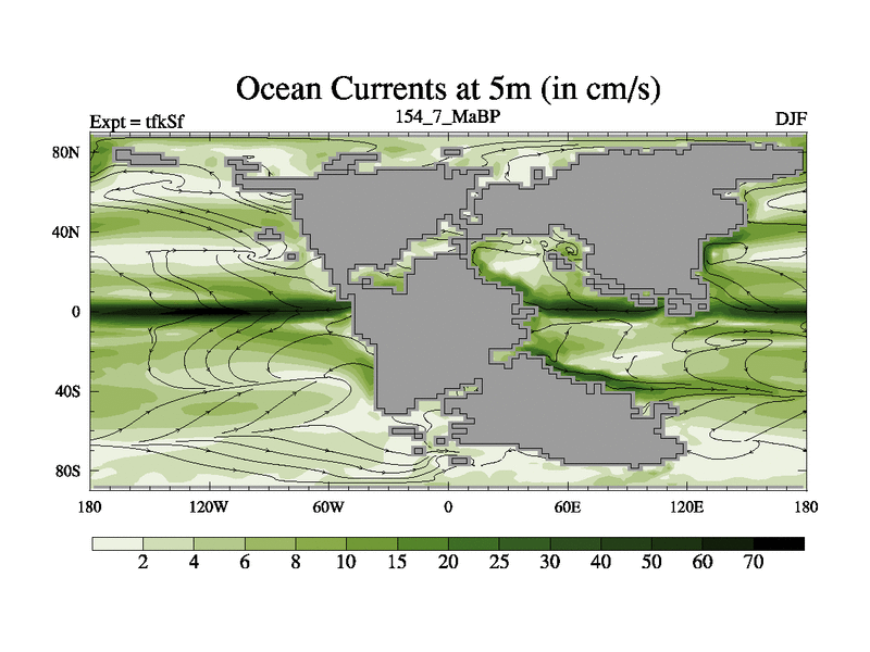 This is the 154.7 Ma simulation using the Scotese palaeogeographies and revised CCN etc. This version has islands and smoothing and desert albedo included. Tuned CO2 to give Scotese temperatures. Started from end of tfkEf.
