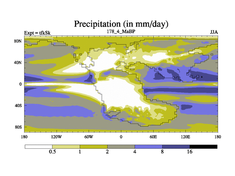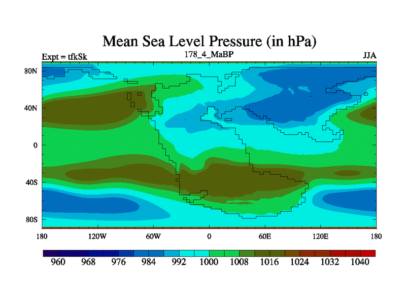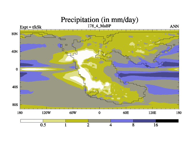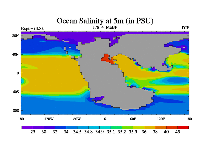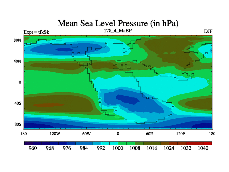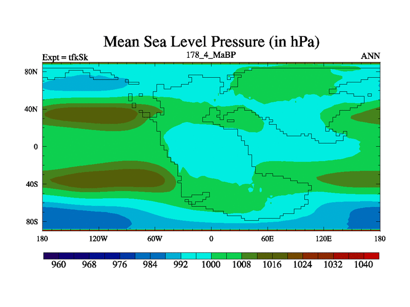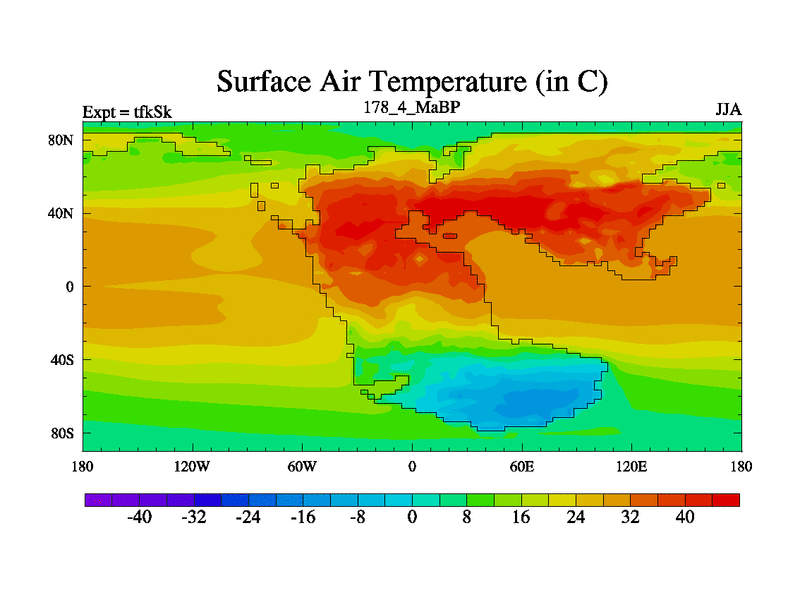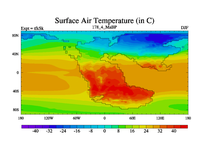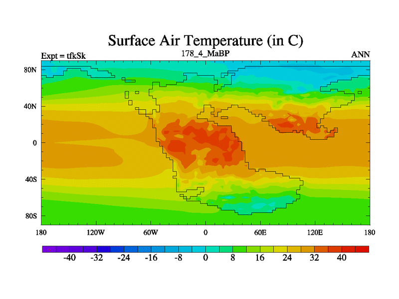 This is the 178.4 Ma simulation using the Scotese palaeogeographies and revised CCN etc. This version has islands and smoothing and desert albedo included. Tuned CO2 to give Scotese temperatures. Started from end of tfkEk.