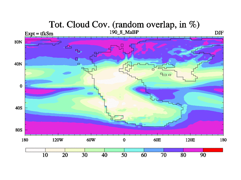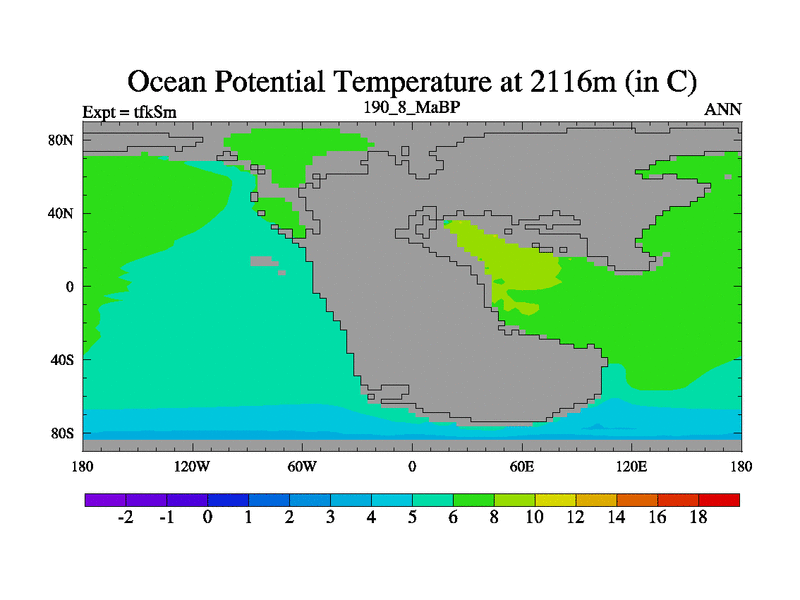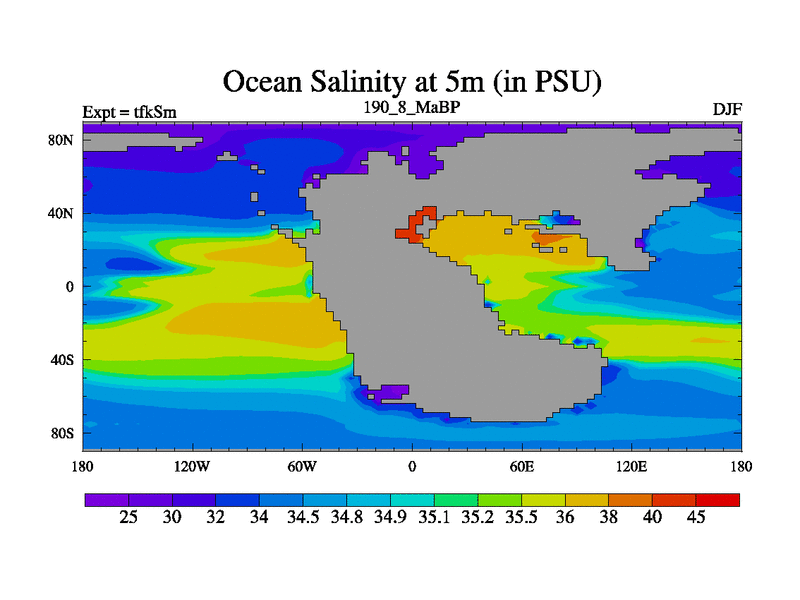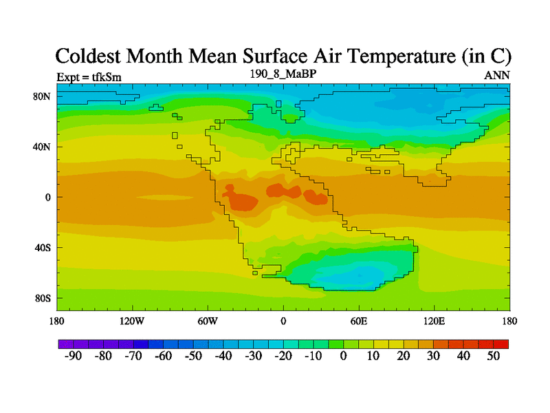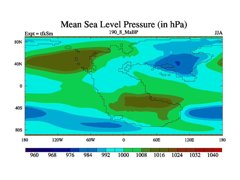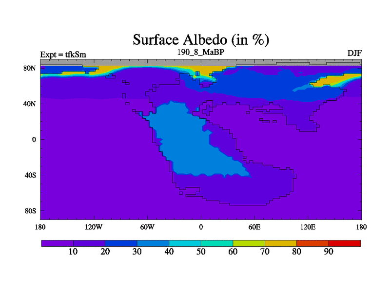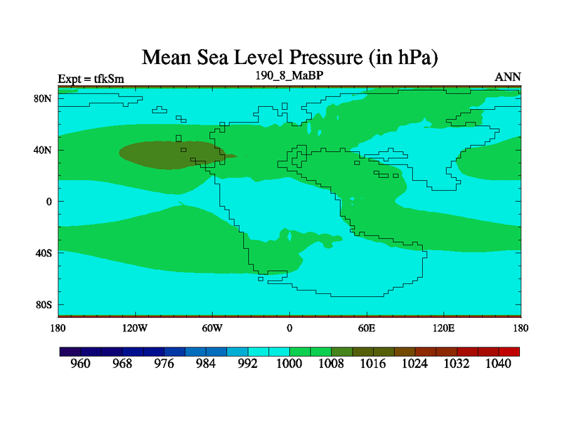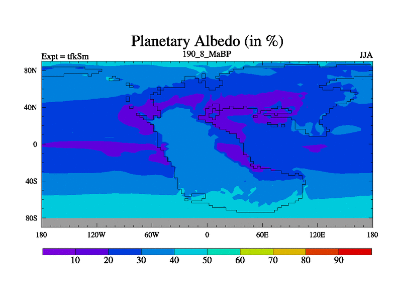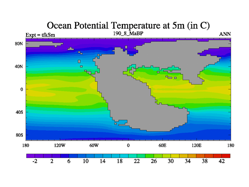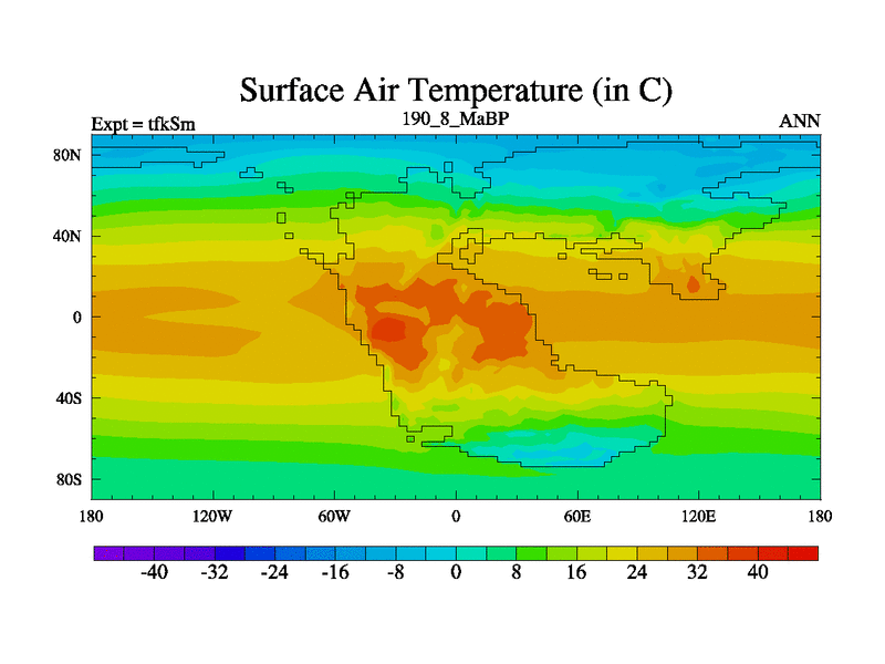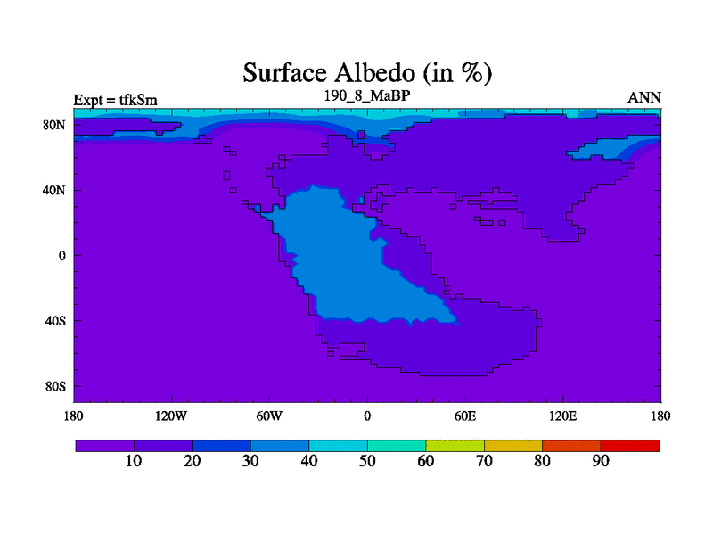 This is the 190.8 Ma simulation using the Scotese palaeogeographies and revised CCN etc. This version has islands and smoothing and desert albedo included. Tuned CO2 to give Scotese temperatures. Started from end of tfkEm.