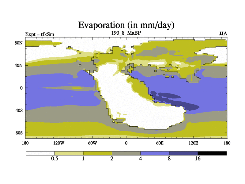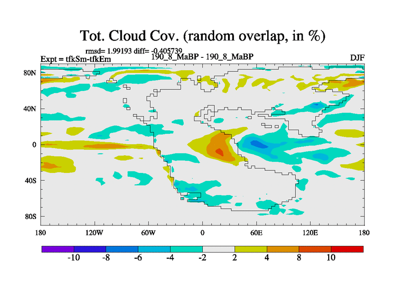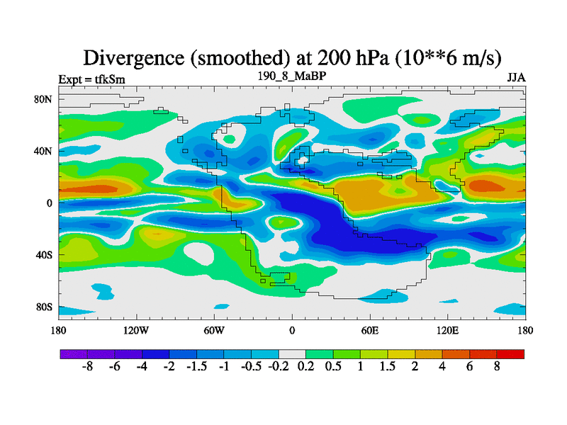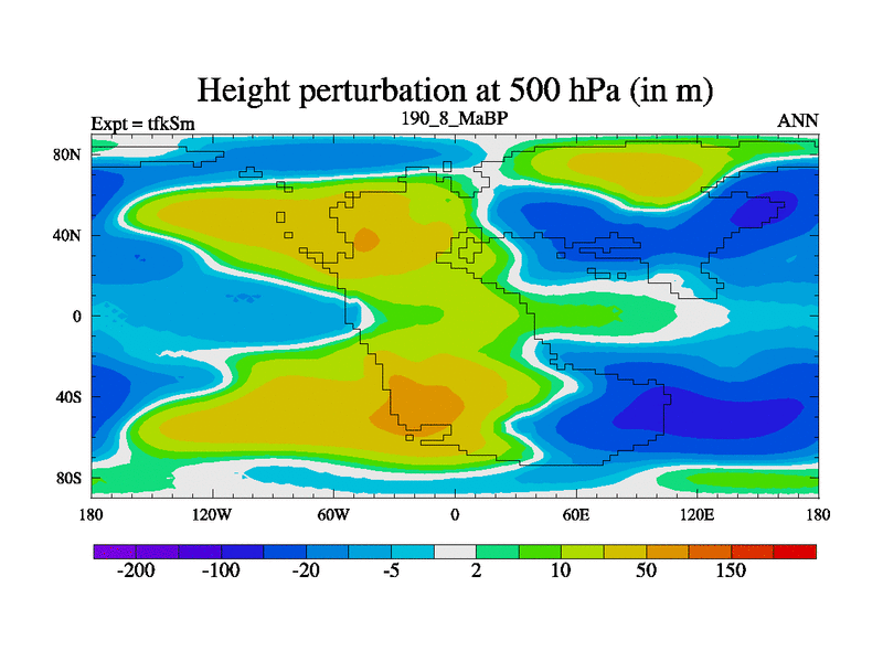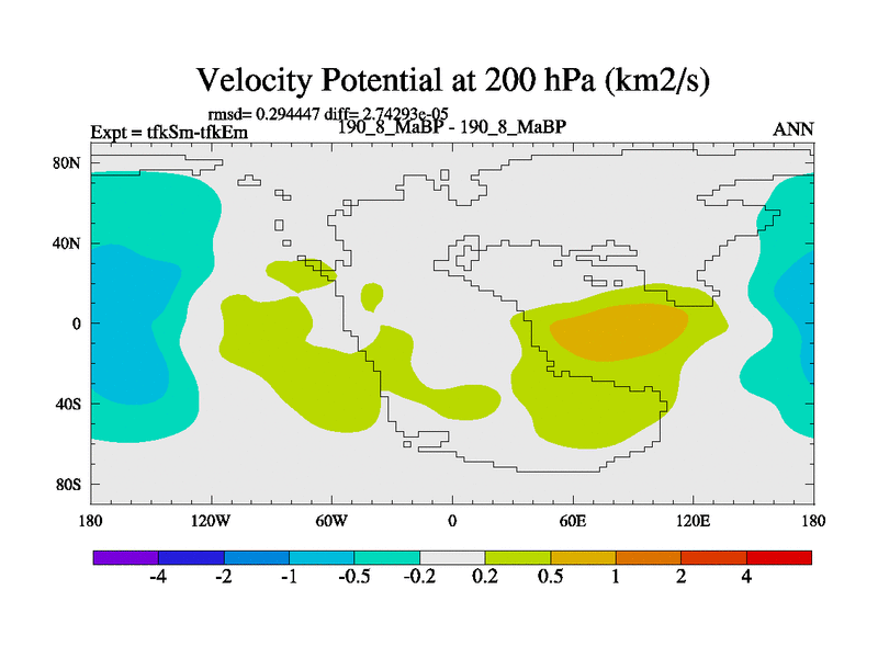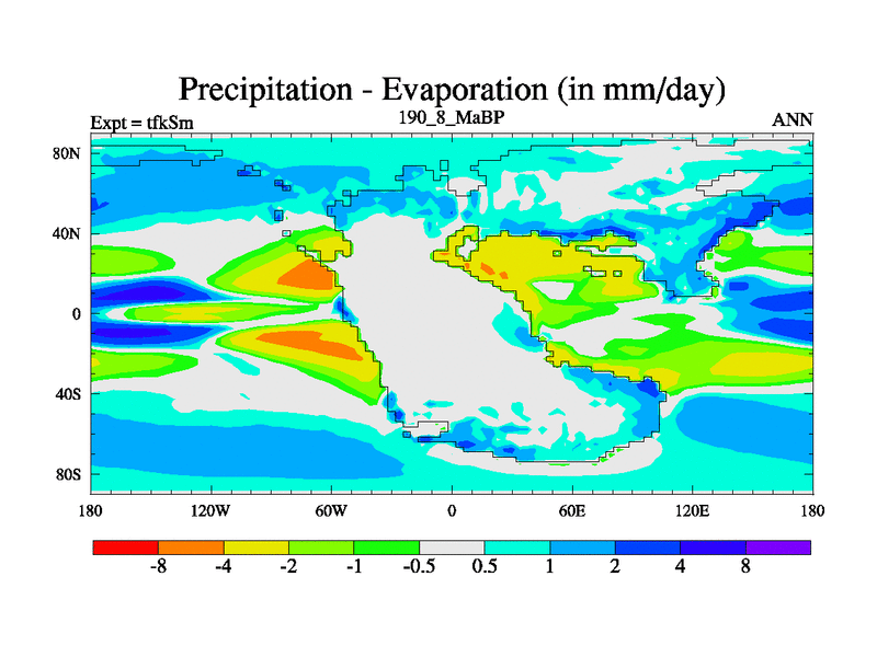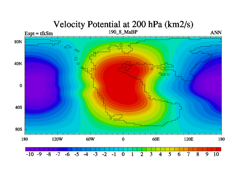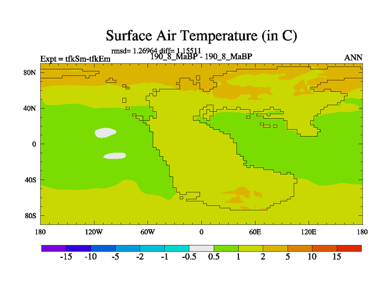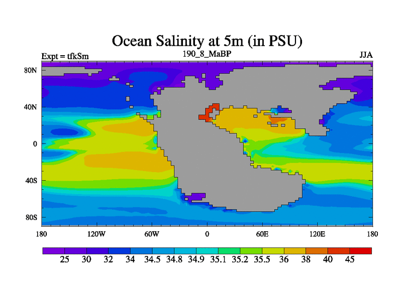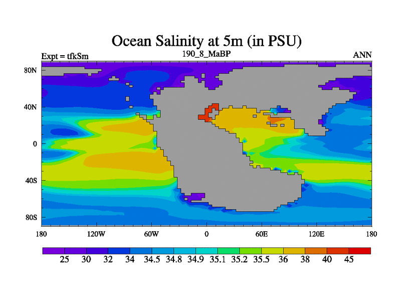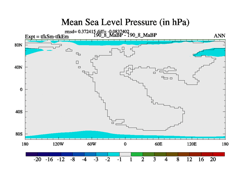 This is the 190.8 Ma simulation using the Scotese palaeogeographies and revised CCN etc. This version has islands and smoothing and desert albedo included. Tuned CO2 to give Scotese temperatures. Started from end of tfkEm.
