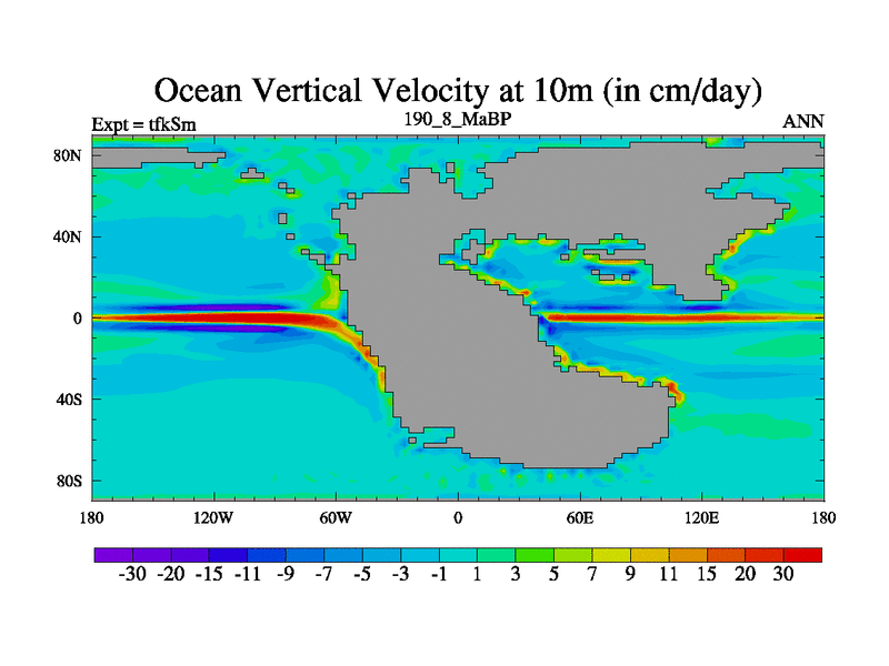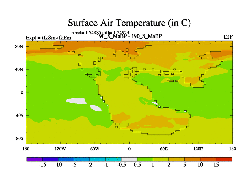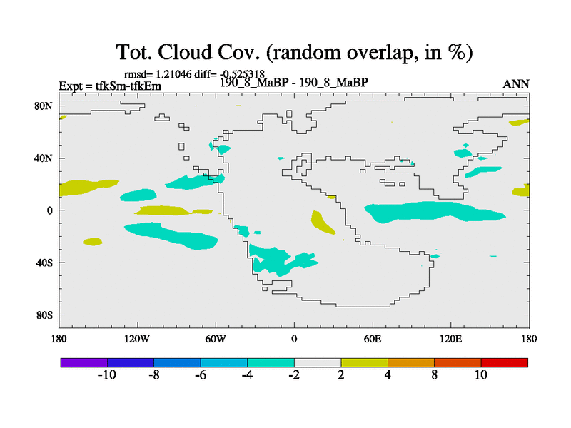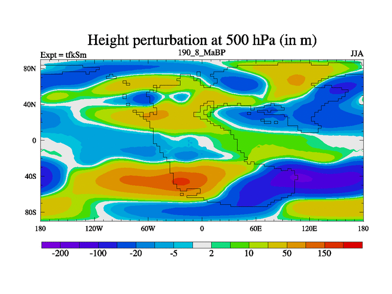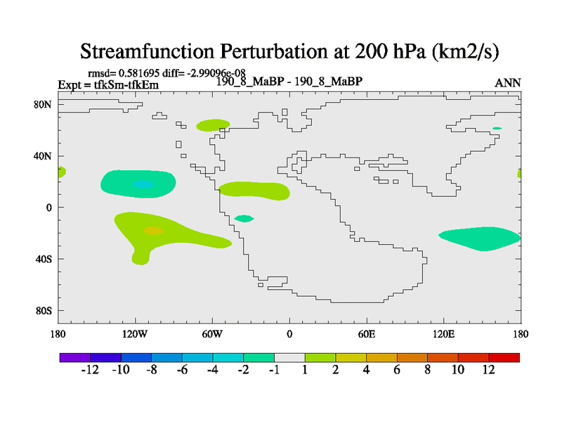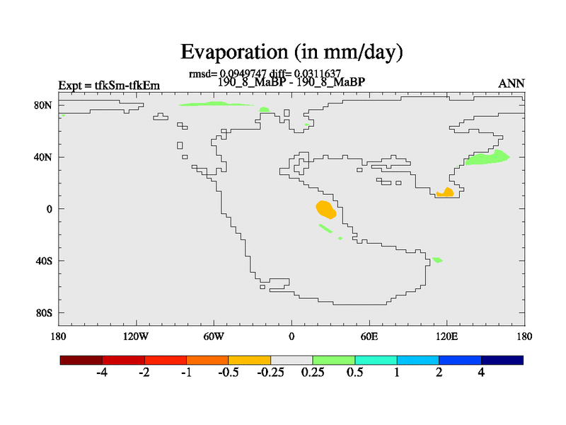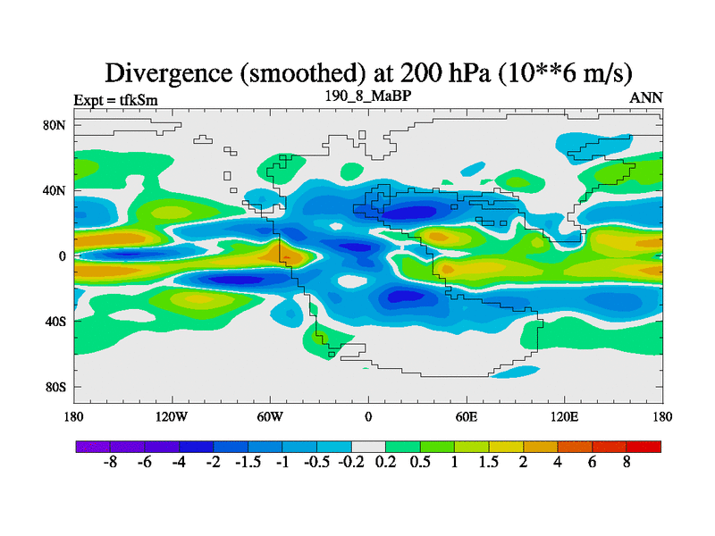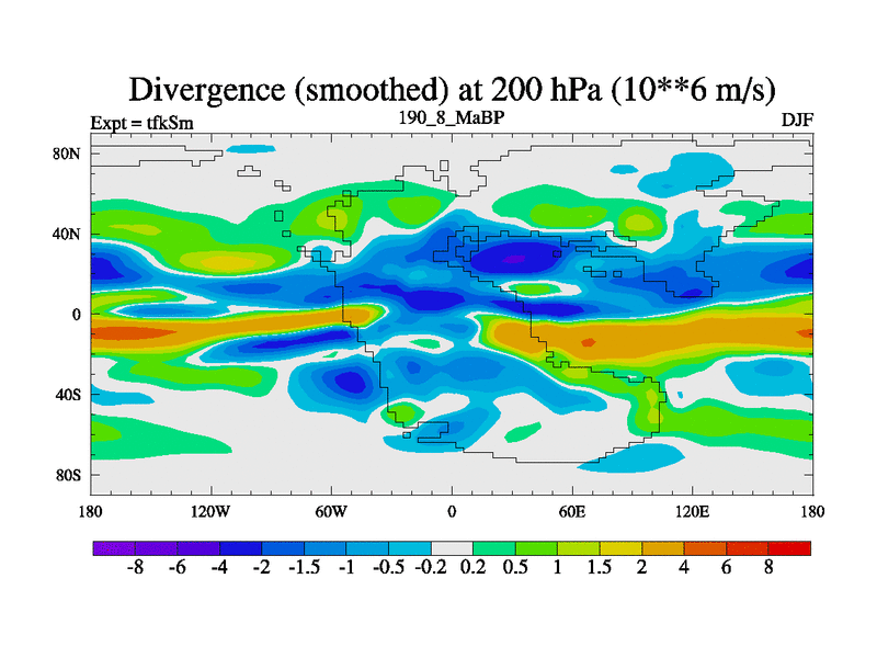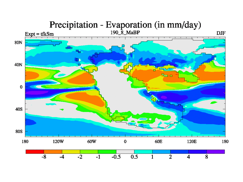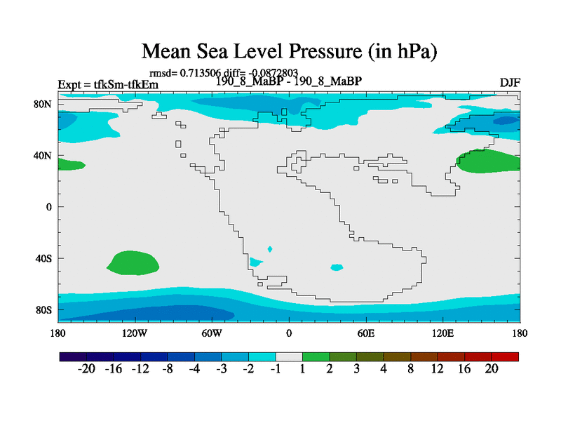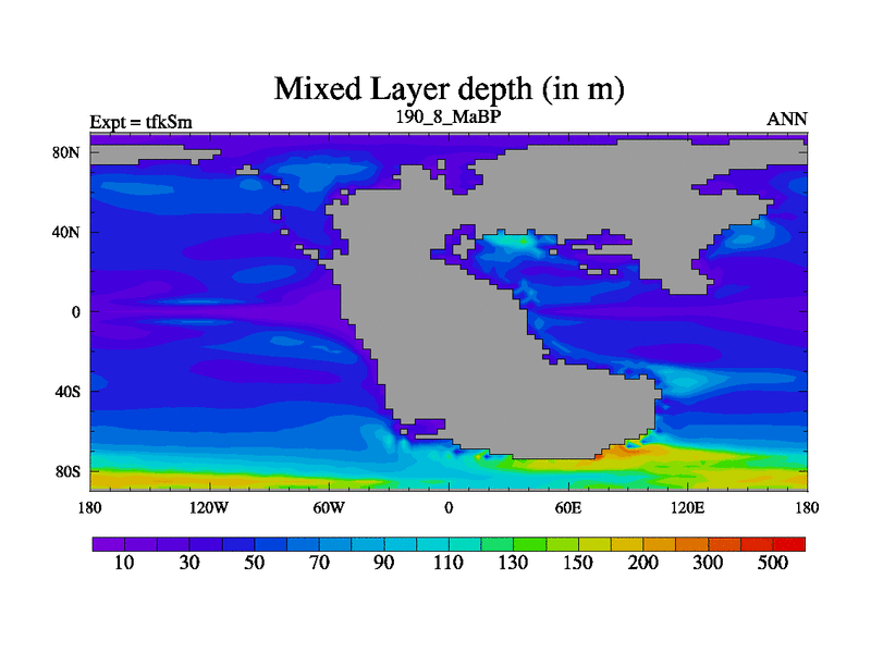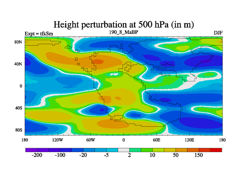 This is the 190.8 Ma simulation using the Scotese palaeogeographies and revised CCN etc. This version has islands and smoothing and desert albedo included. Tuned CO2 to give Scotese temperatures. Started from end of tfkEm.