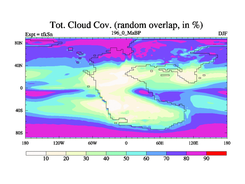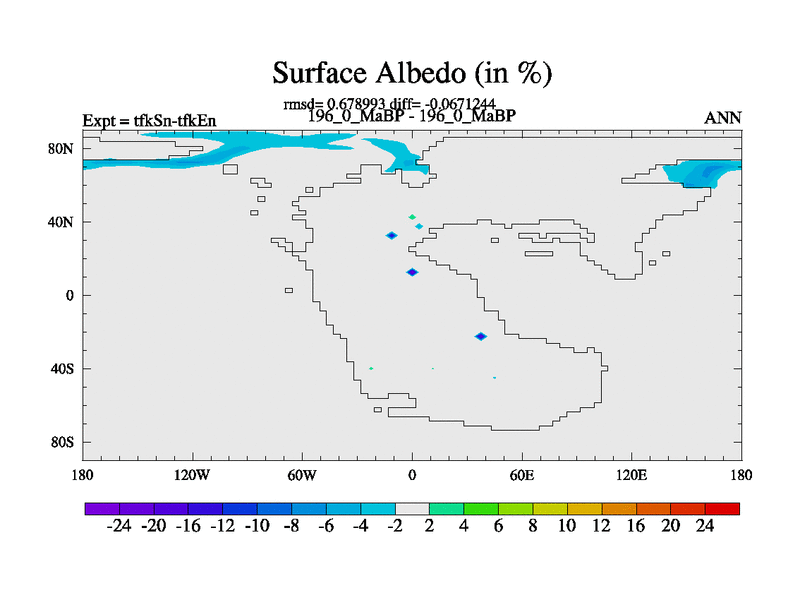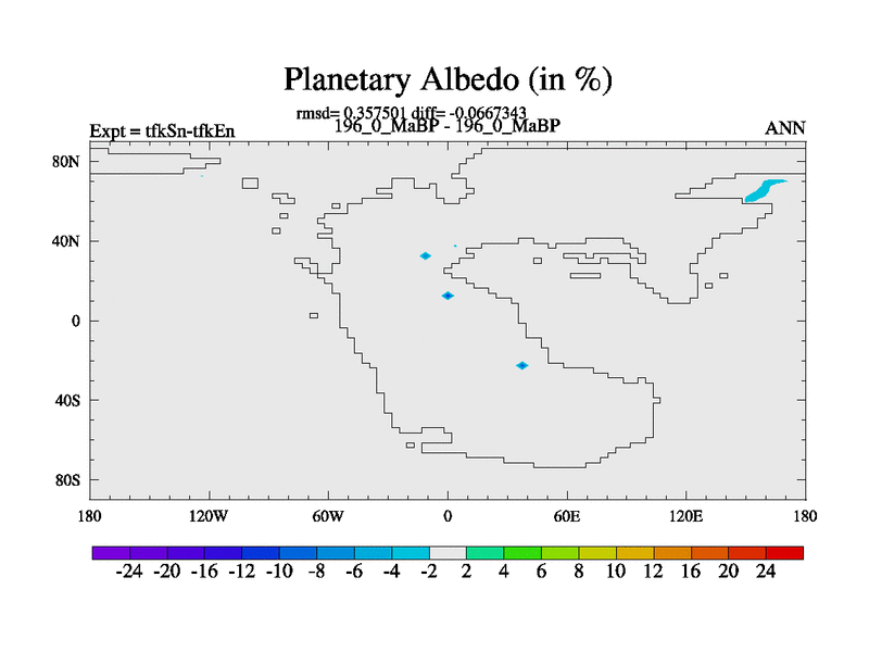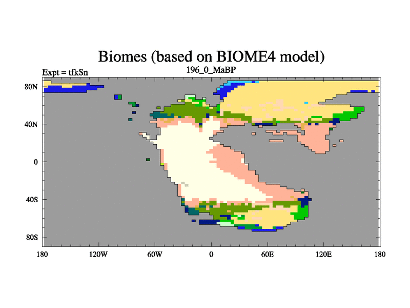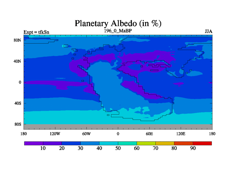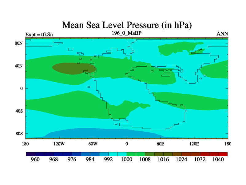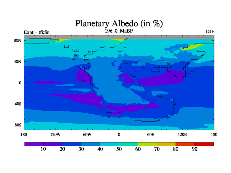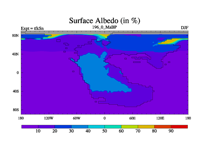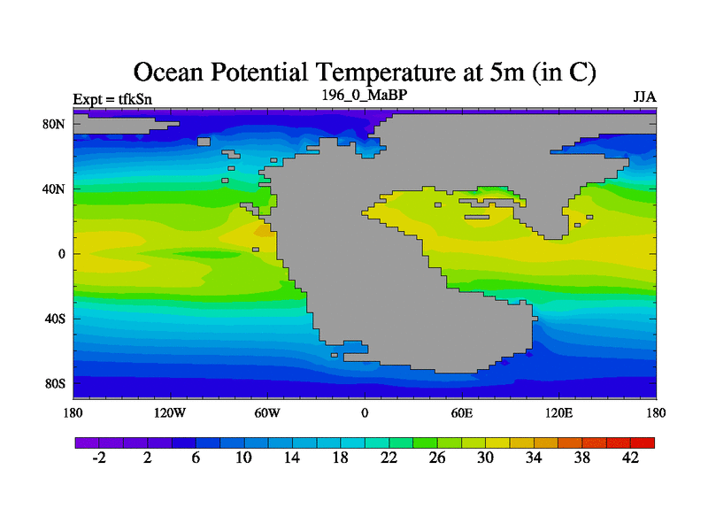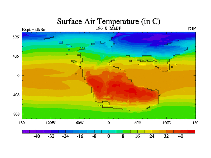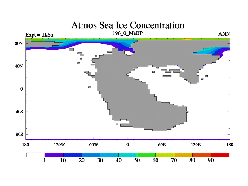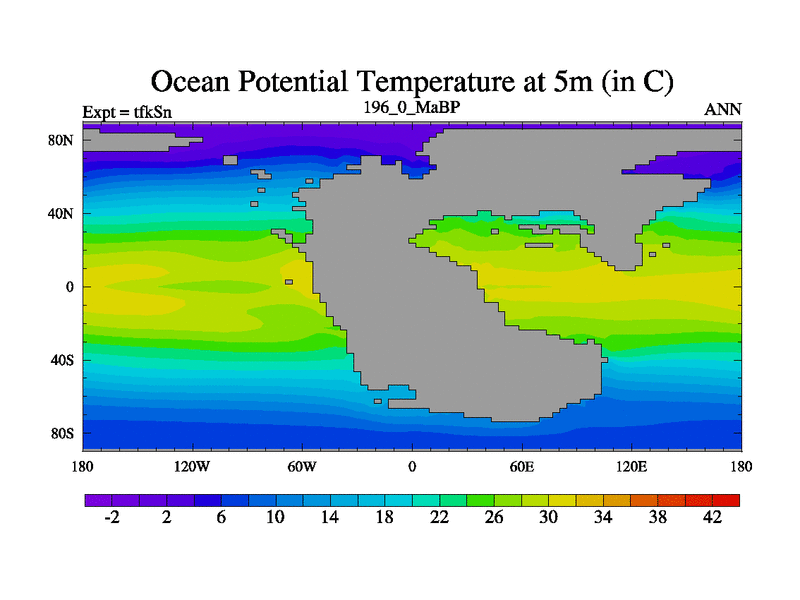 This is the 196.0 Ma simulation using the Scotese palaeogeographies and revised CCN etc. This version has islands and smoothing and desert albedo included. Tuned CO2 to give Scotese temperatures. Started from end of tfkEn.