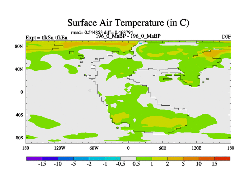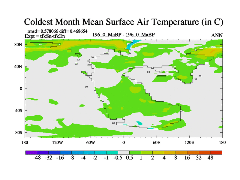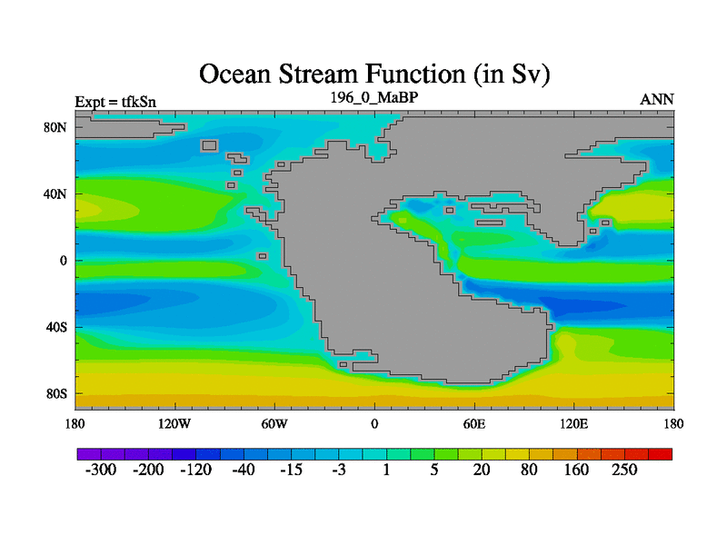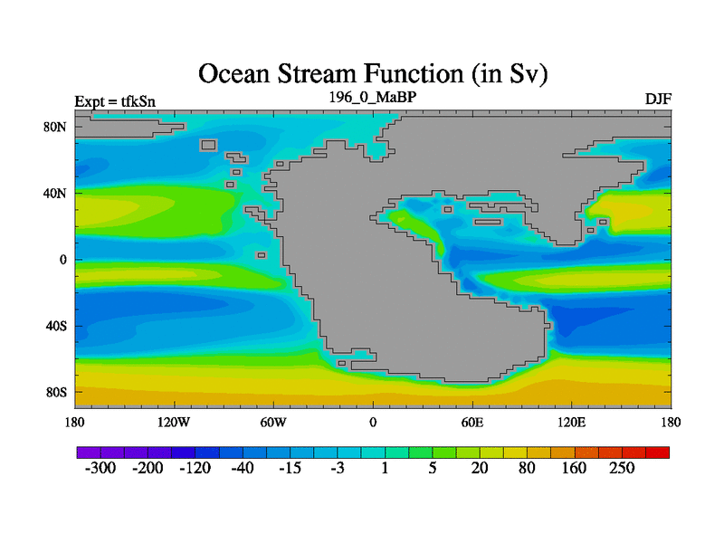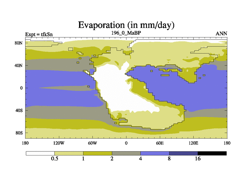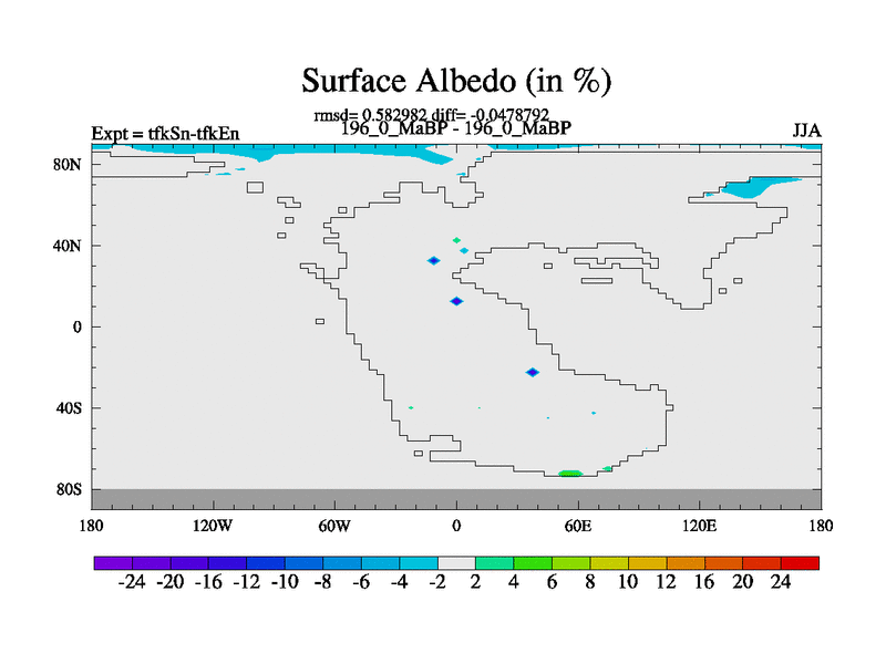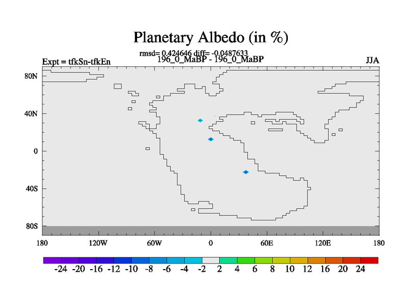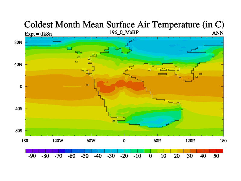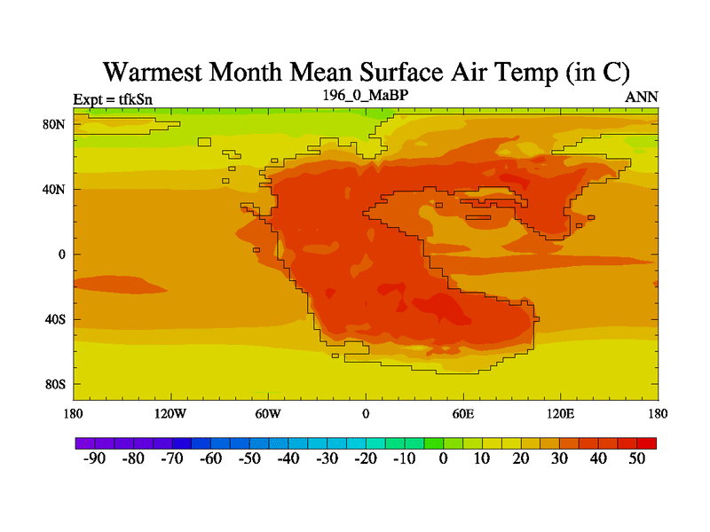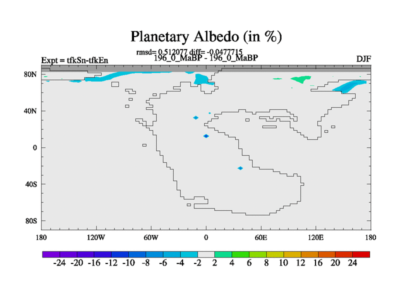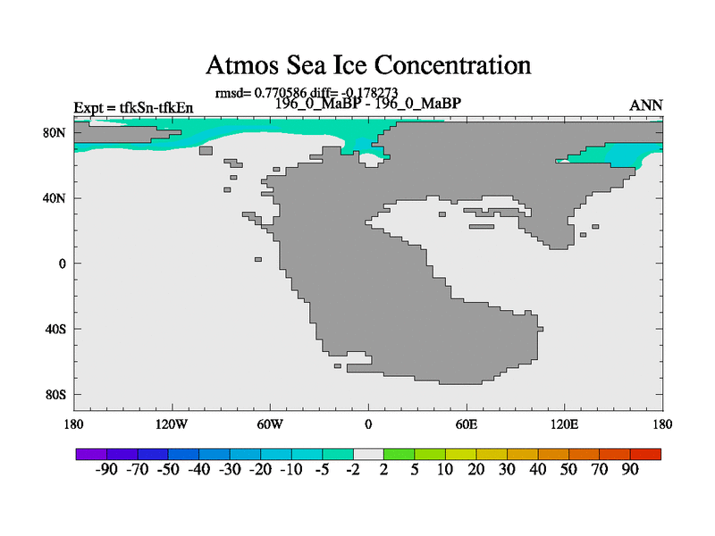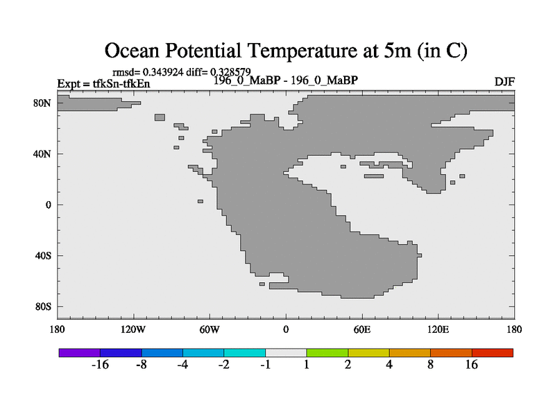 This is the 196.0 Ma simulation using the Scotese palaeogeographies and revised CCN etc. This version has islands and smoothing and desert albedo included. Tuned CO2 to give Scotese temperatures. Started from end of tfkEn.