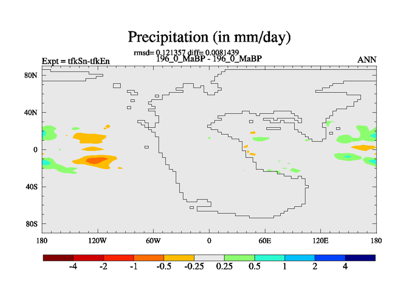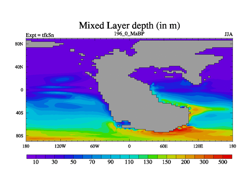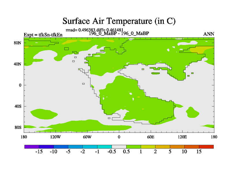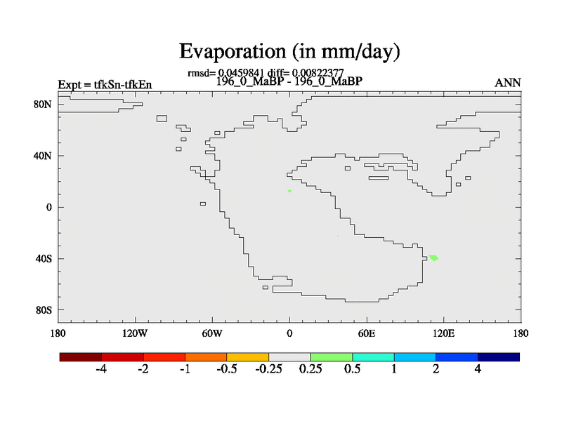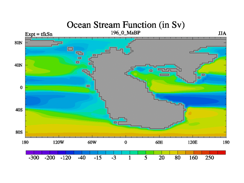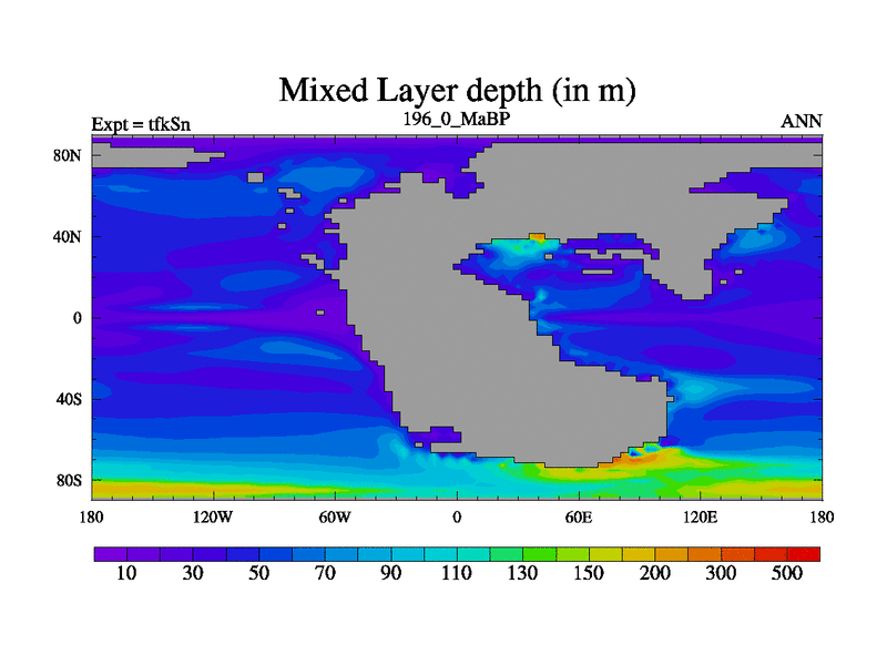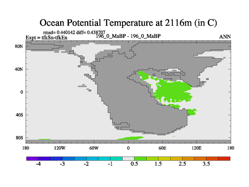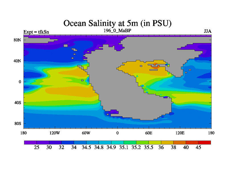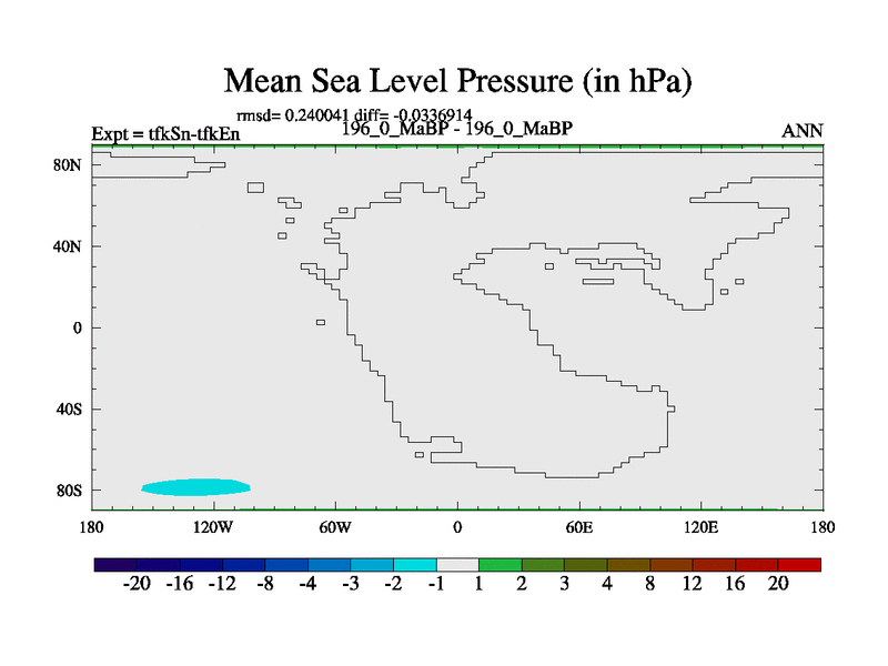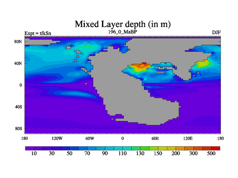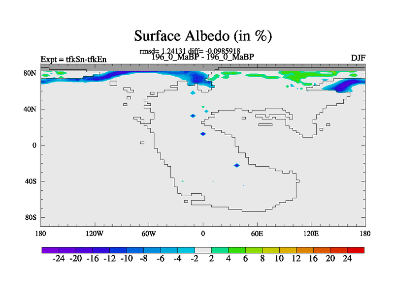 This is the 196.0 Ma simulation using the Scotese palaeogeographies and revised CCN etc. This version has islands and smoothing and desert albedo included. Tuned CO2 to give Scotese temperatures. Started from end of tfkEn.