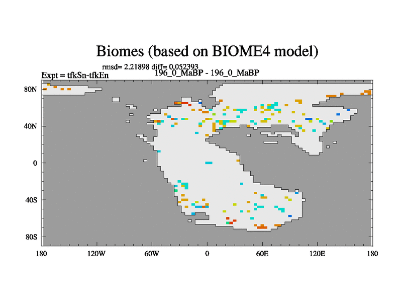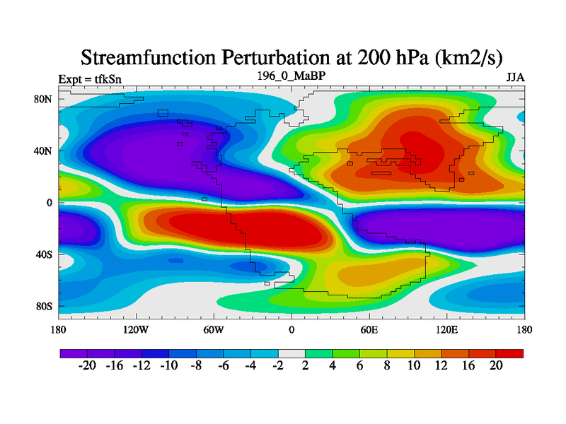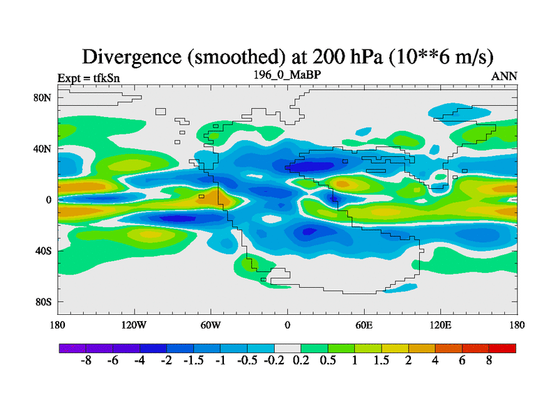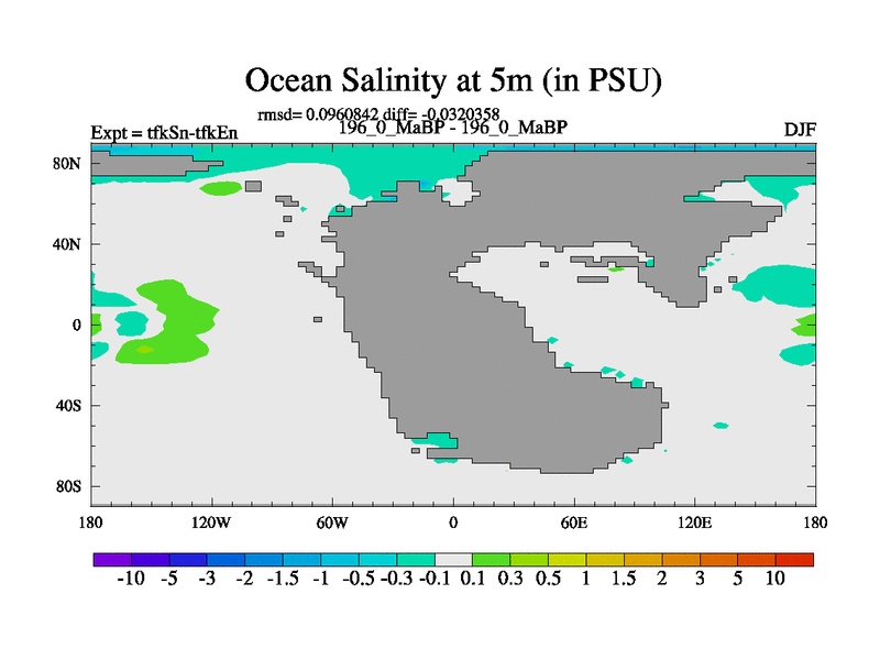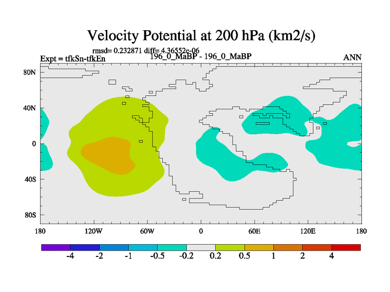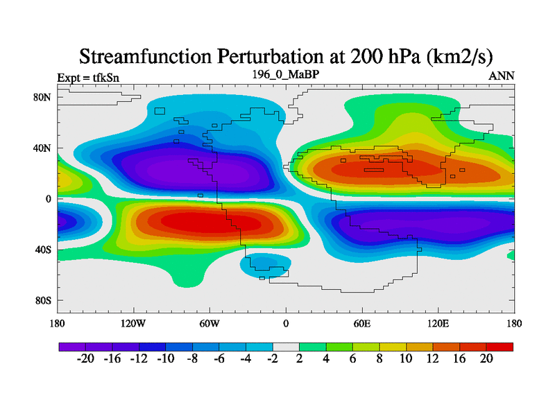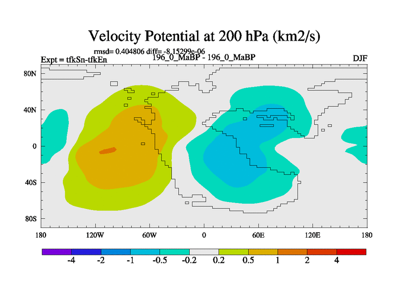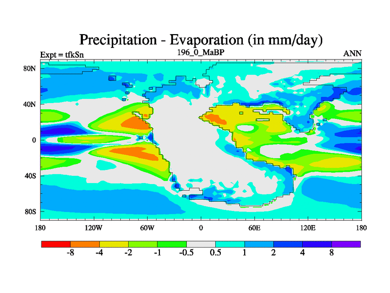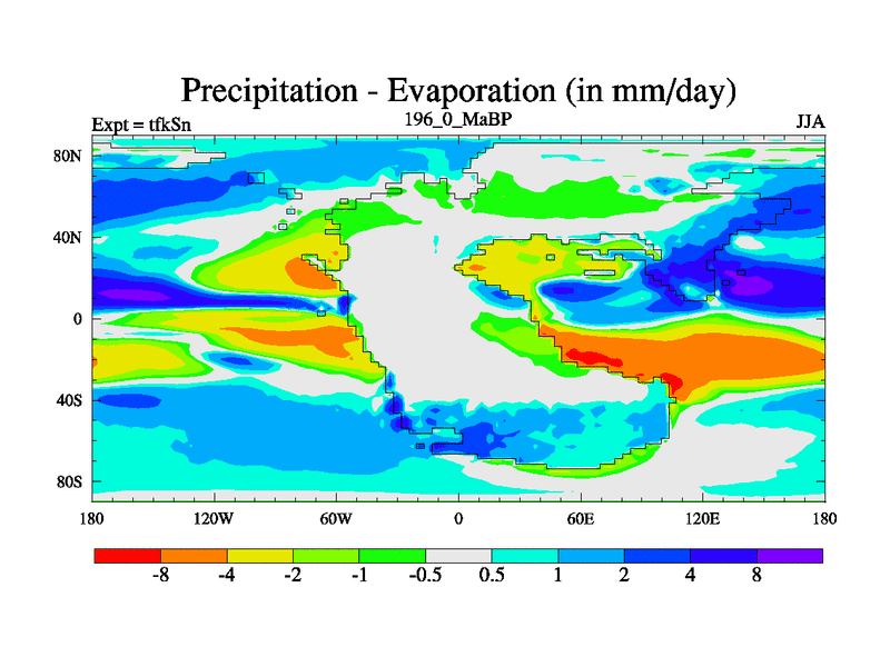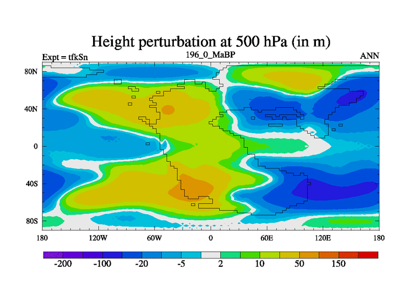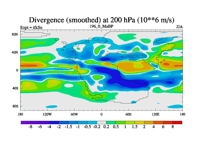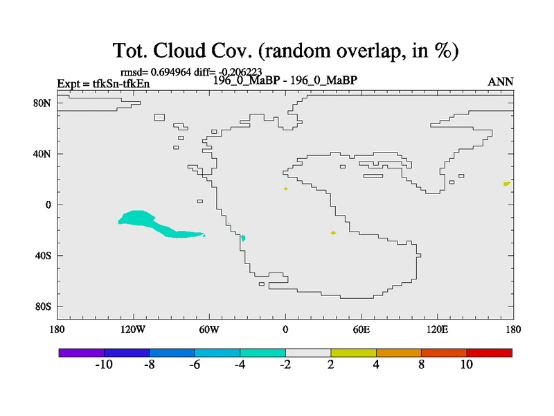 This is the 196.0 Ma simulation using the Scotese palaeogeographies and revised CCN etc. This version has islands and smoothing and desert albedo included. Tuned CO2 to give Scotese temperatures. Started from end of tfkEn.