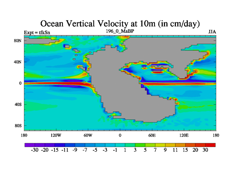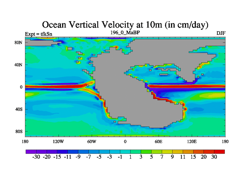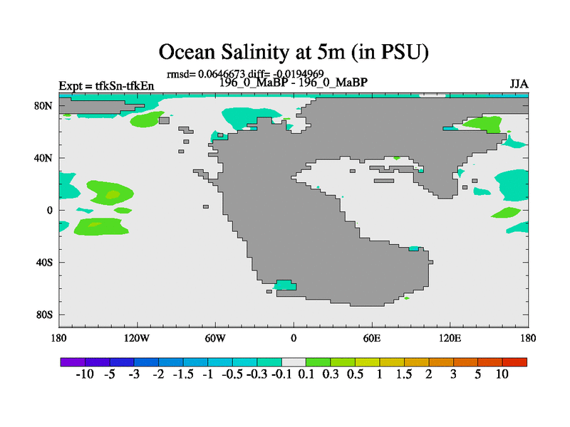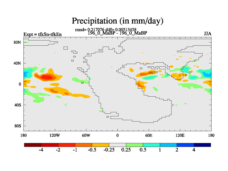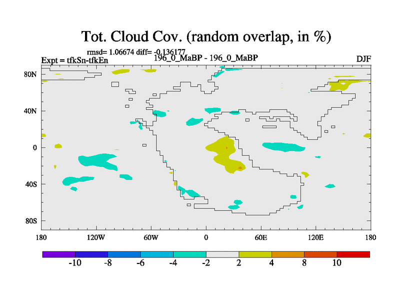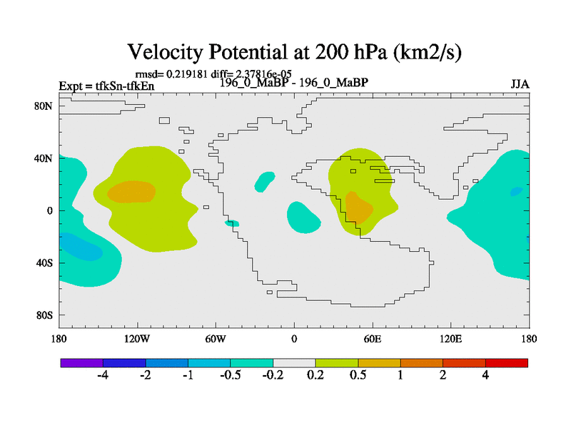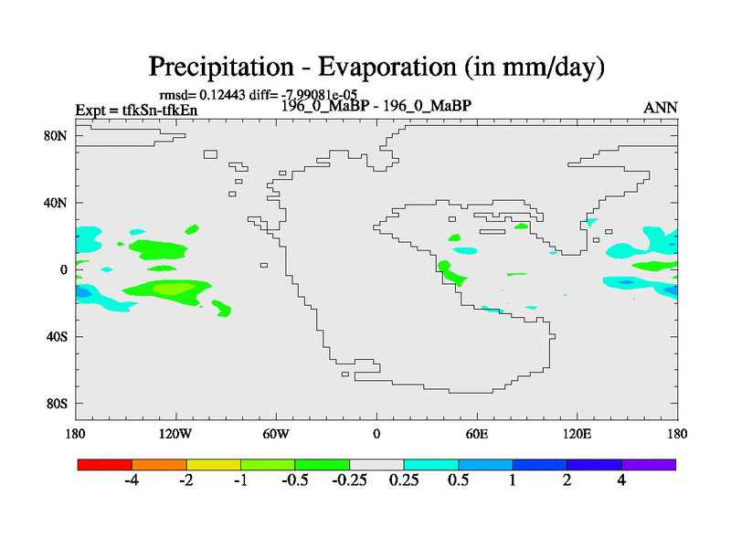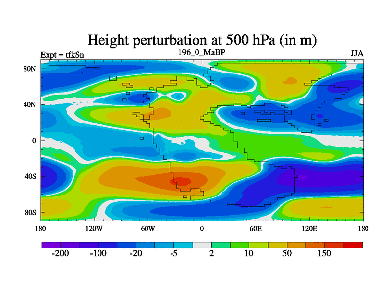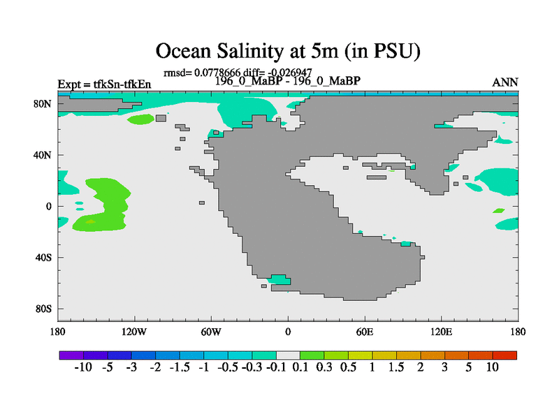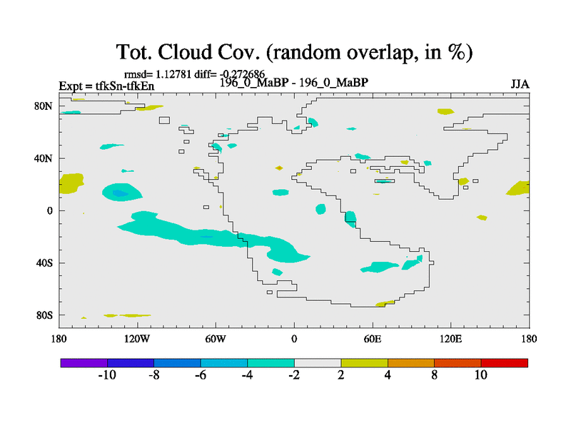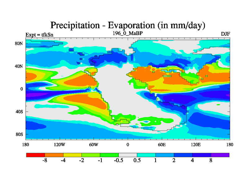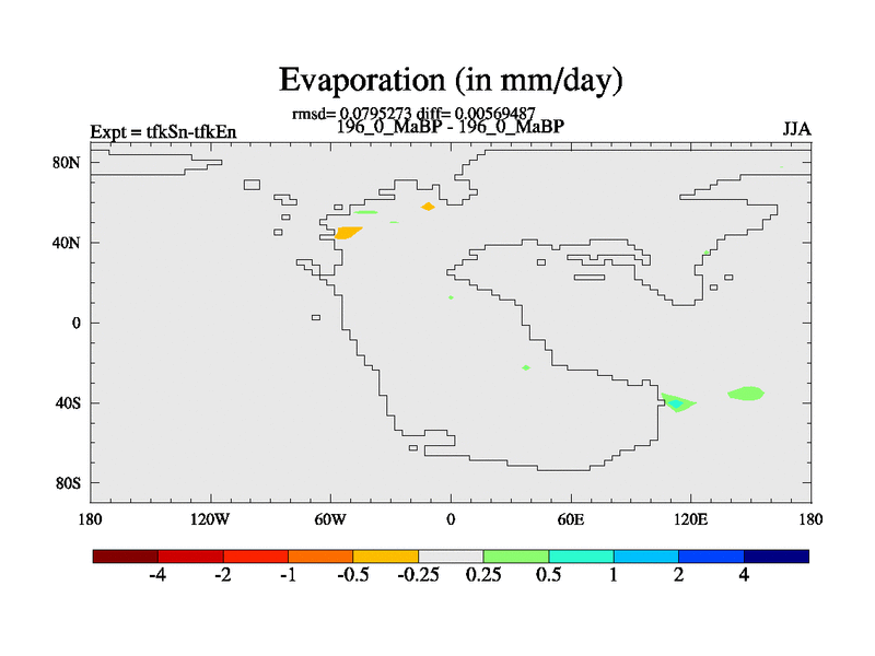 This is the 196.0 Ma simulation using the Scotese palaeogeographies and revised CCN etc. This version has islands and smoothing and desert albedo included. Tuned CO2 to give Scotese temperatures. Started from end of tfkEn.