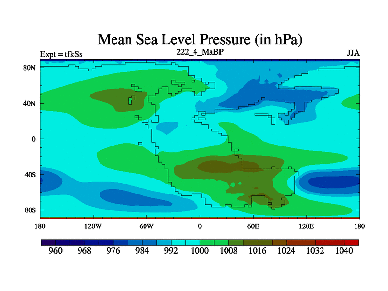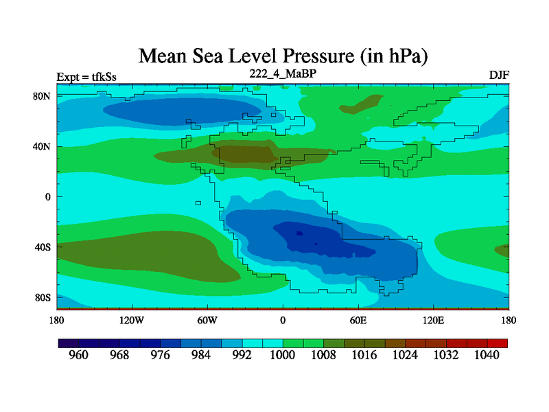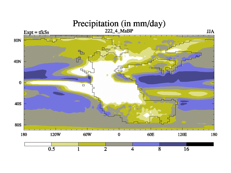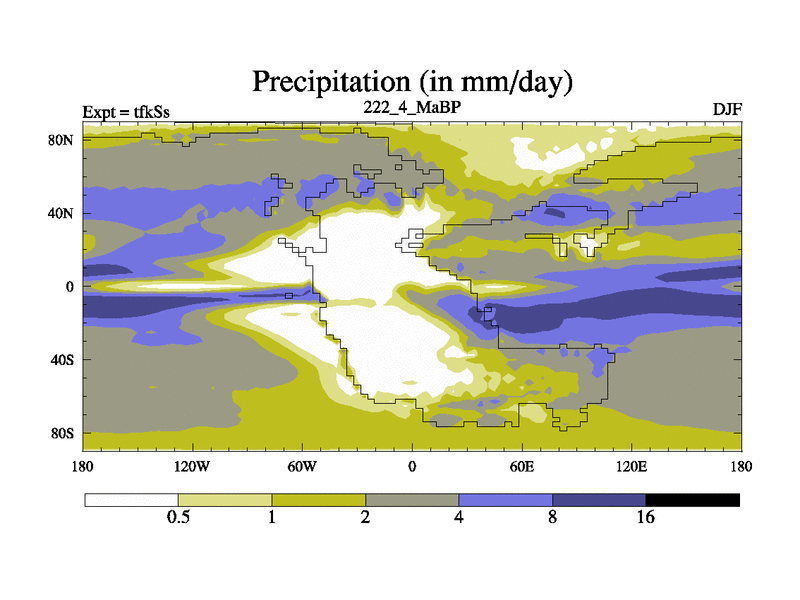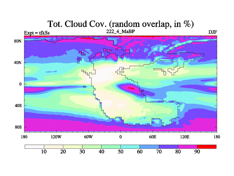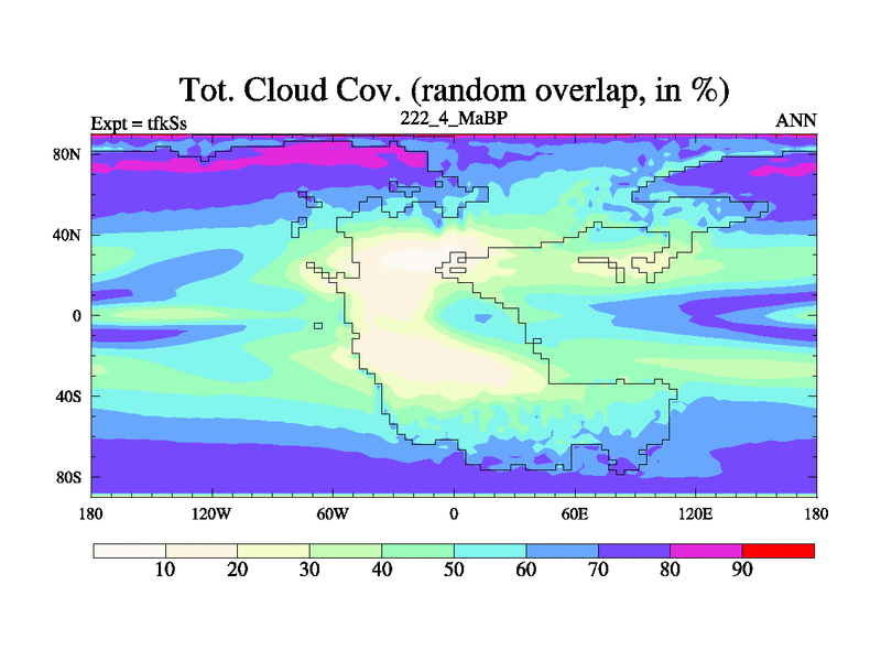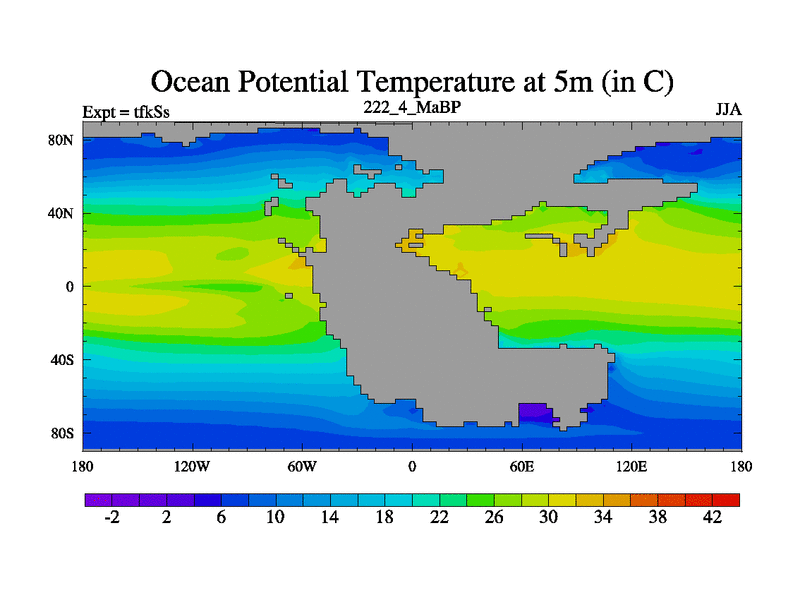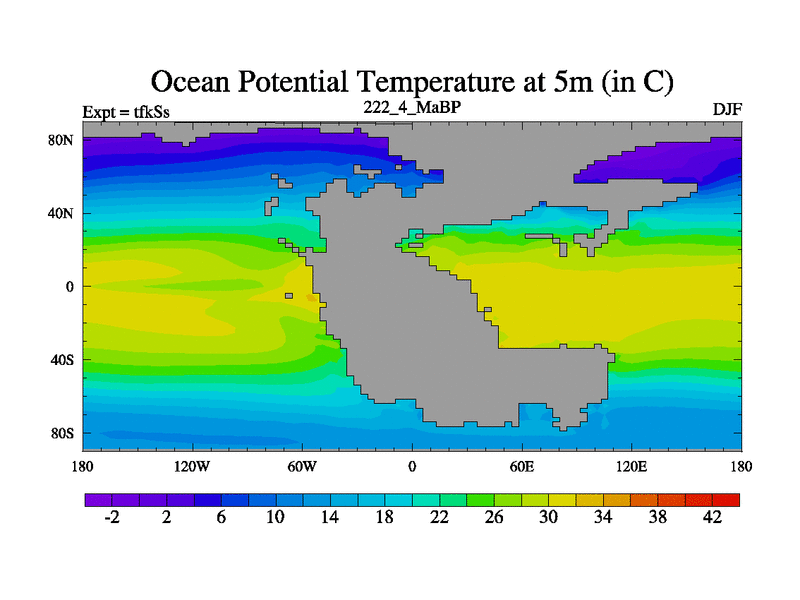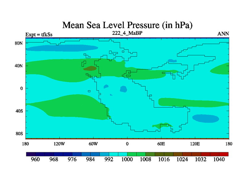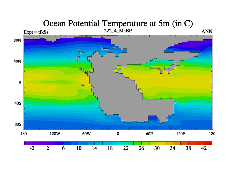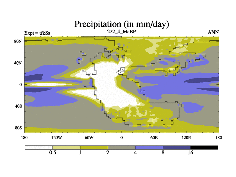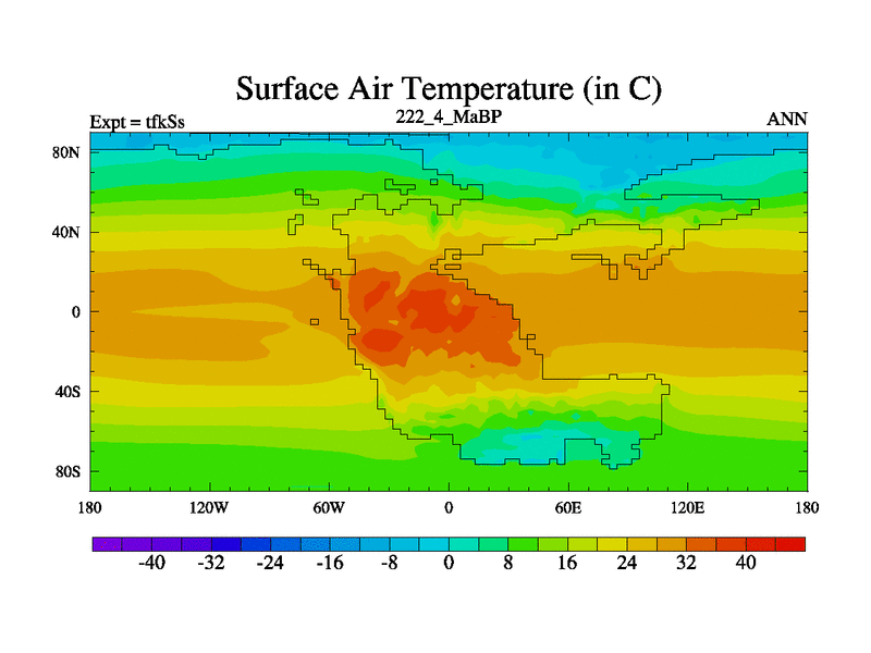 This is the 222.4 Ma simulation using the Scotese palaeogeographies and revised CCN etc. This version has islands and smoothing and desert albedo included. Tuned CO2 to give Scotese temperatures. Started from end of tfkEs.