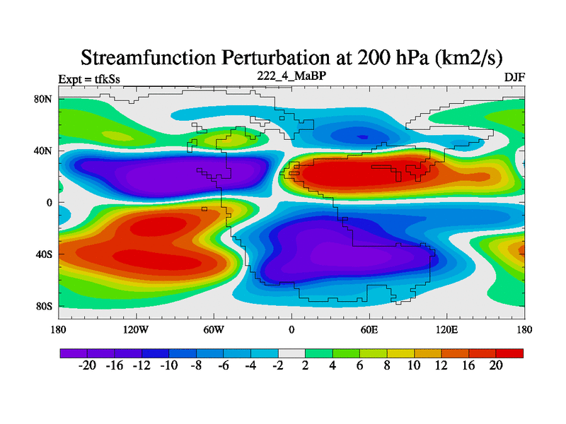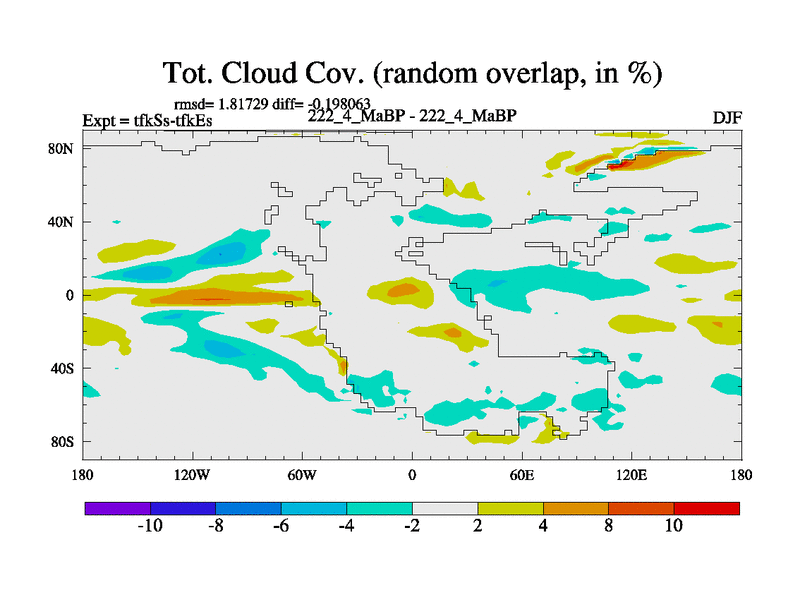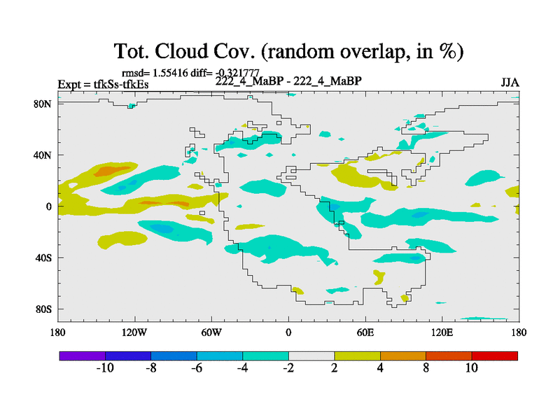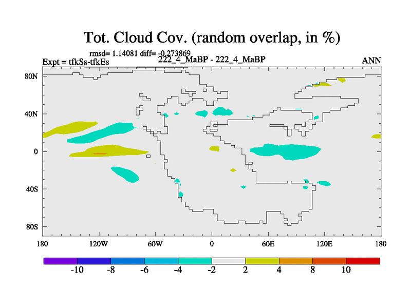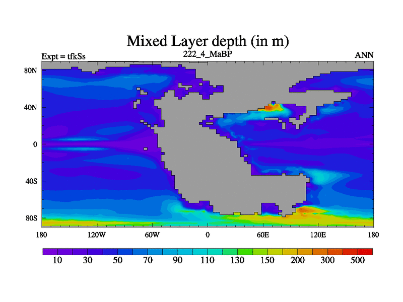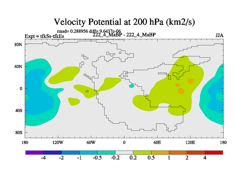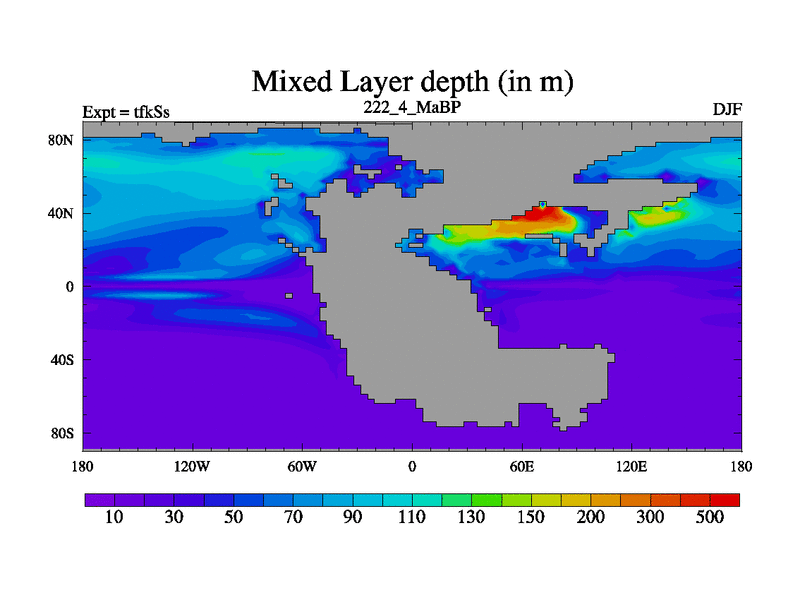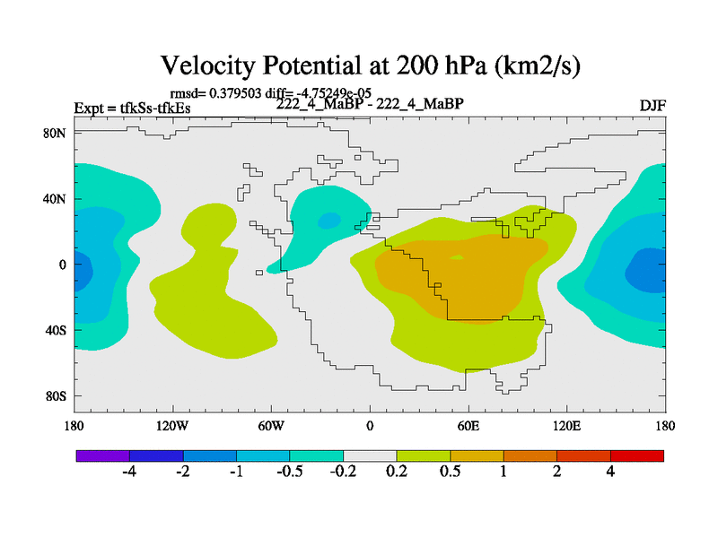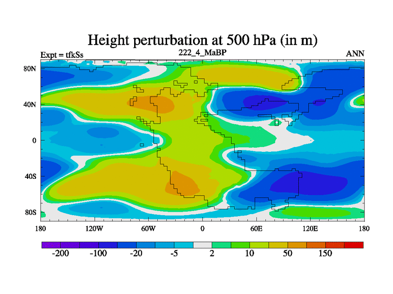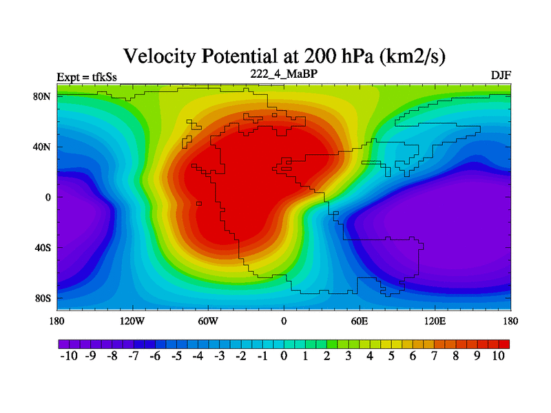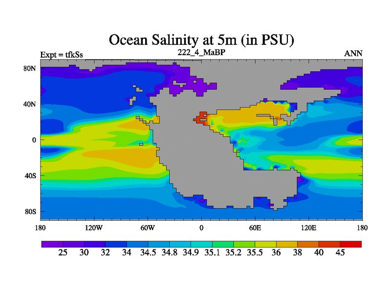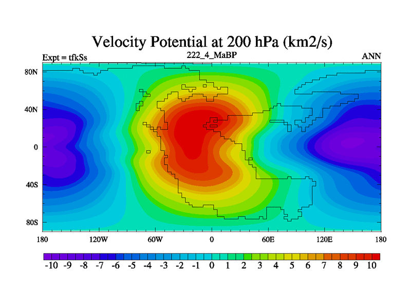 This is the 222.4 Ma simulation using the Scotese palaeogeographies and revised CCN etc. This version has islands and smoothing and desert albedo included. Tuned CO2 to give Scotese temperatures. Started from end of tfkEs.