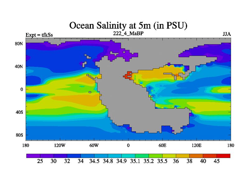 Scientifically as benchmark except using water age update, dark respiration, salinity conservation and revised ozone. Also using new orbital and solar update, and outputting leaf CO2. This version has islands included and atmospheric smoothing and desert albedo. Tuned CO2 to give Scotese temperatures. Started from end of tfkEs.