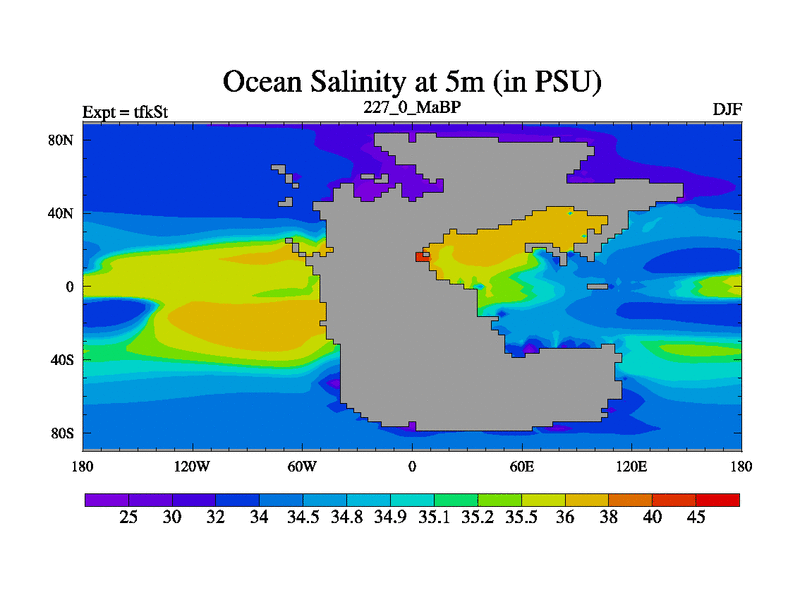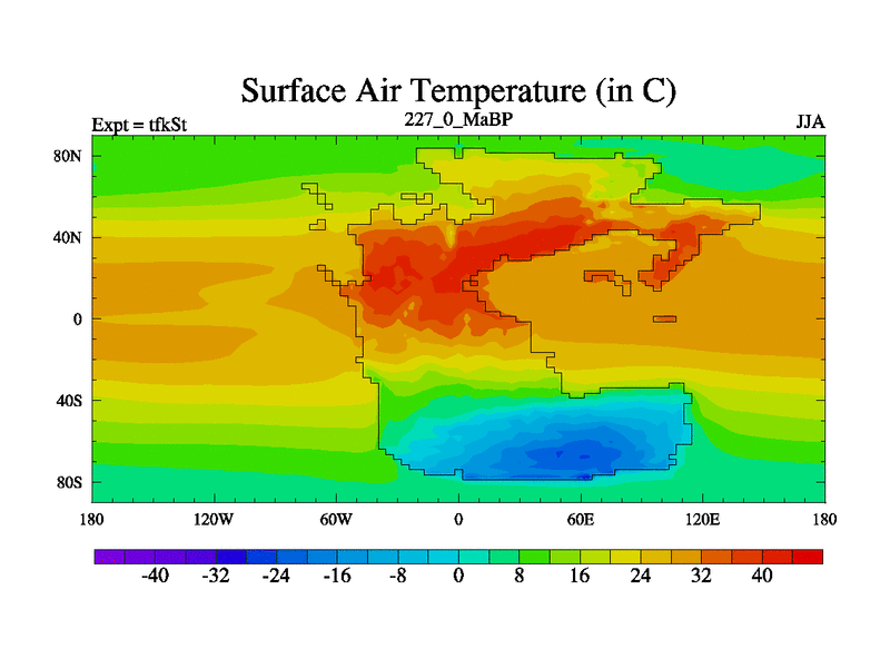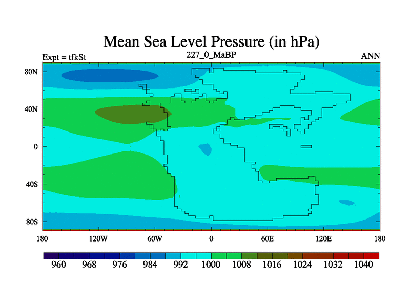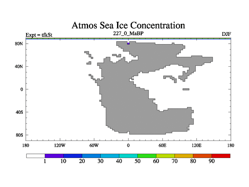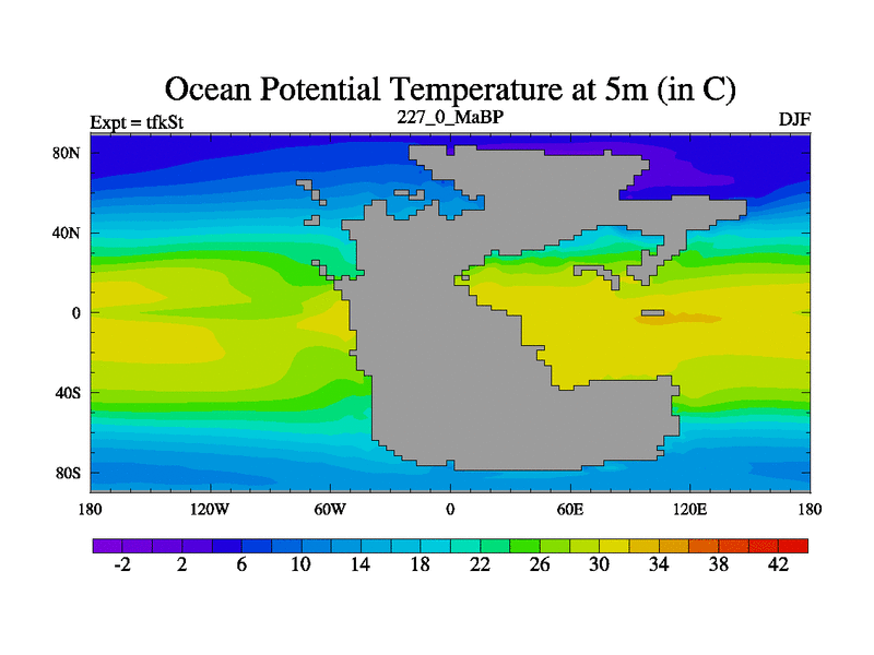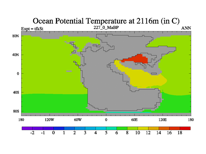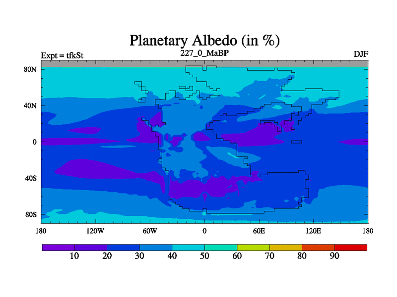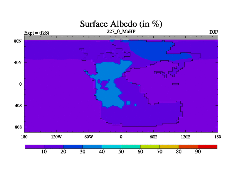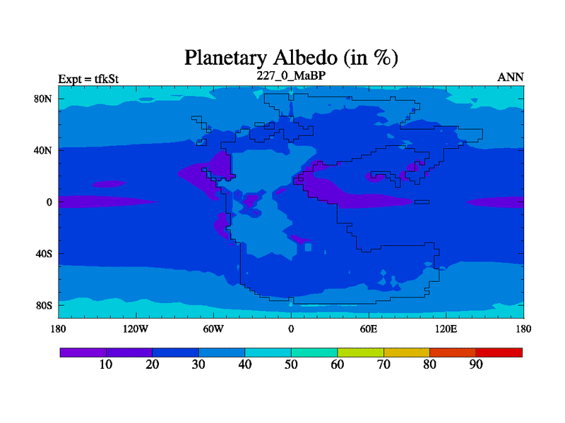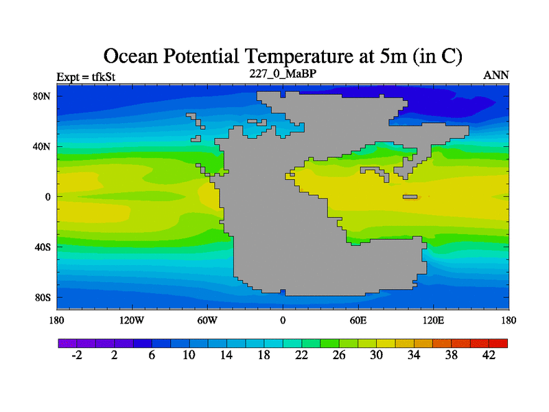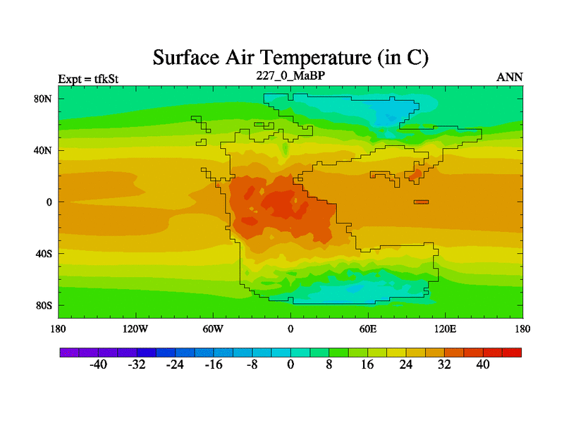 This is the 227.0 Ma simulation using the Scotese palaeogeographies and revised CCN etc. This version has islands and smoothing and desert albedo included. Tuned CO2 to give Scotese temperatures. Started from end of tfkEt.