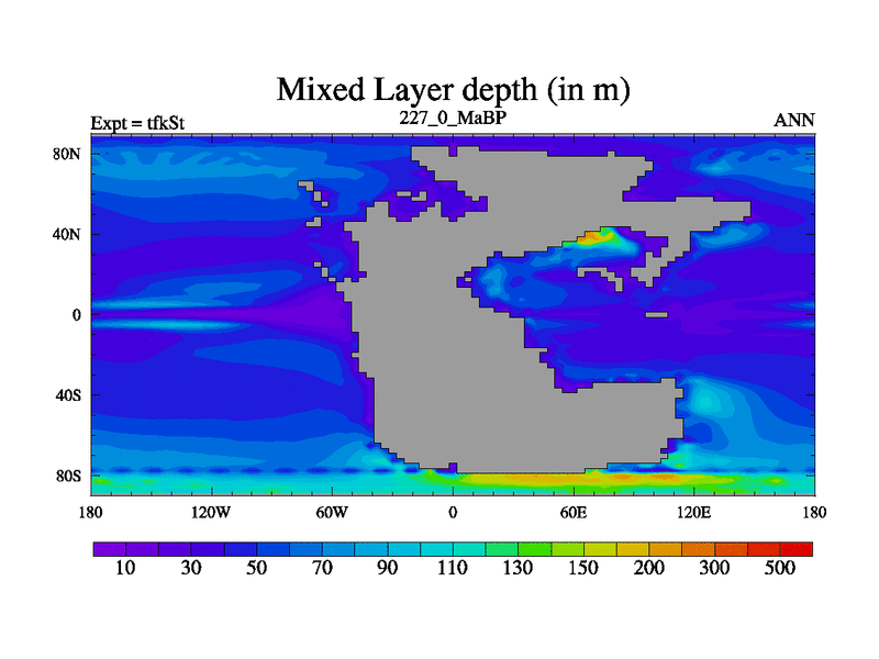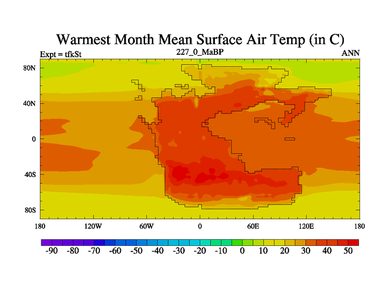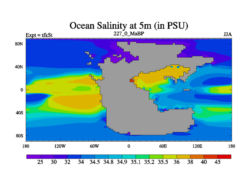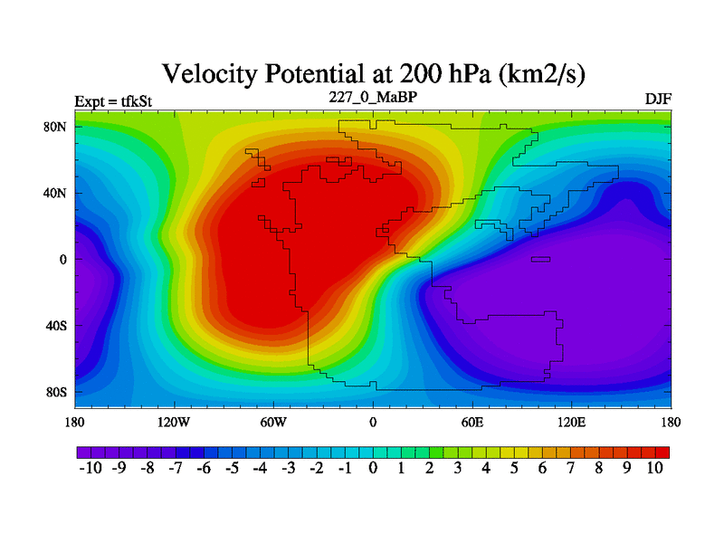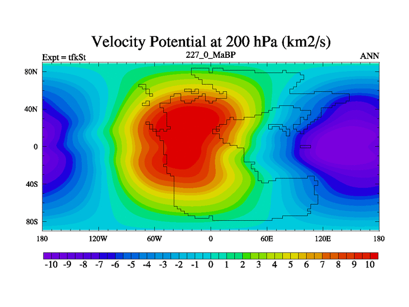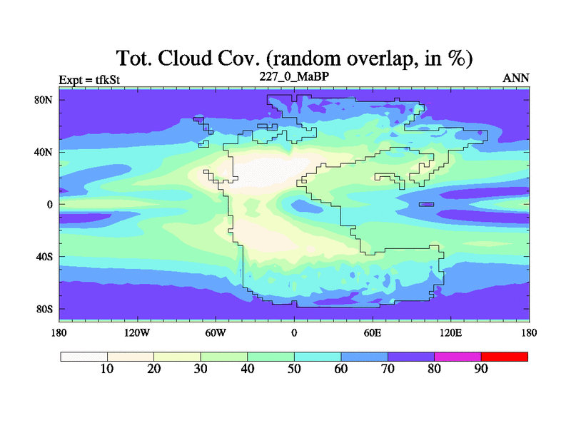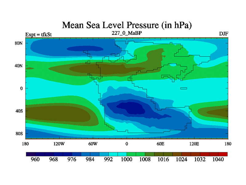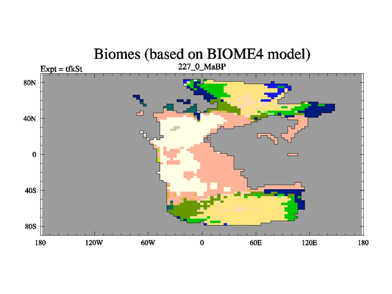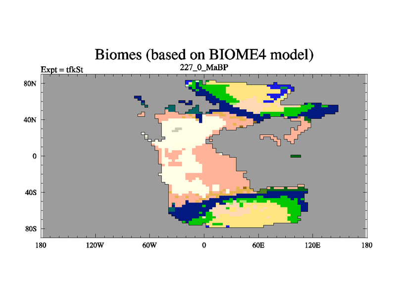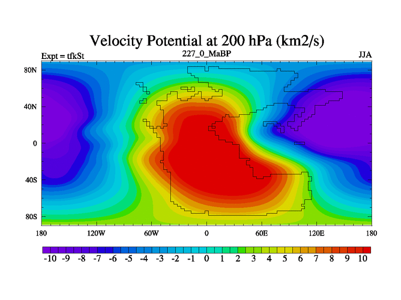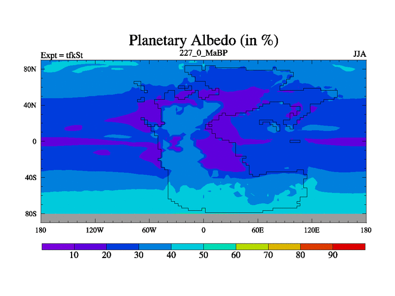 This is the 227.0 Ma simulation using the Scotese palaeogeographies and revised CCN etc. This version has islands and smoothing and desert albedo included. Tuned CO2 to give Scotese temperatures. Started from end of tfkEt.