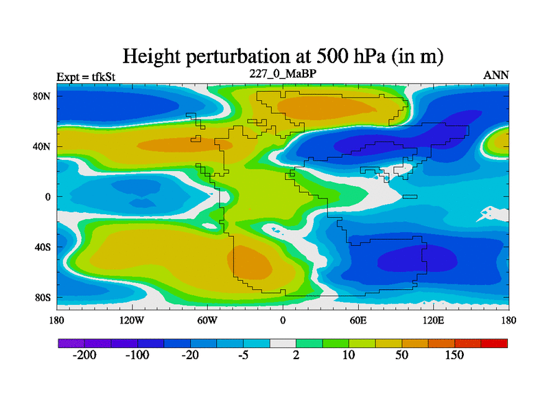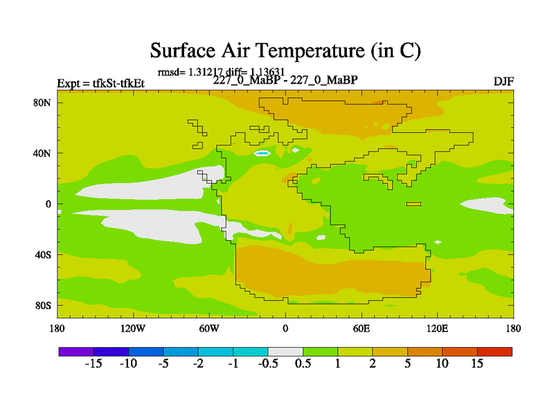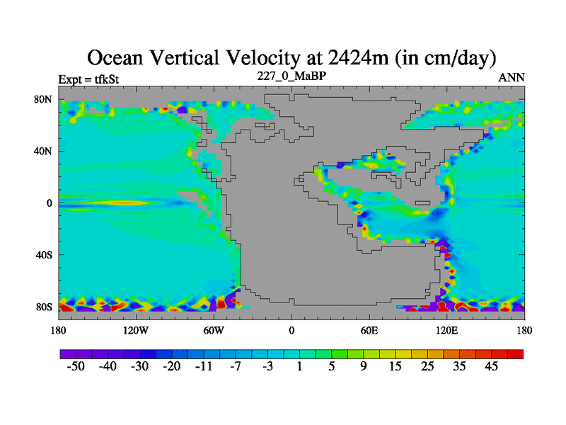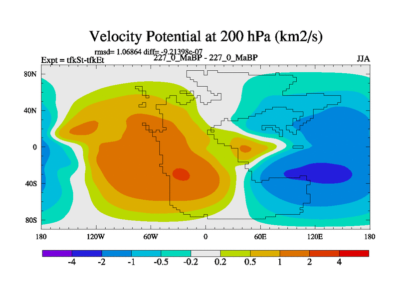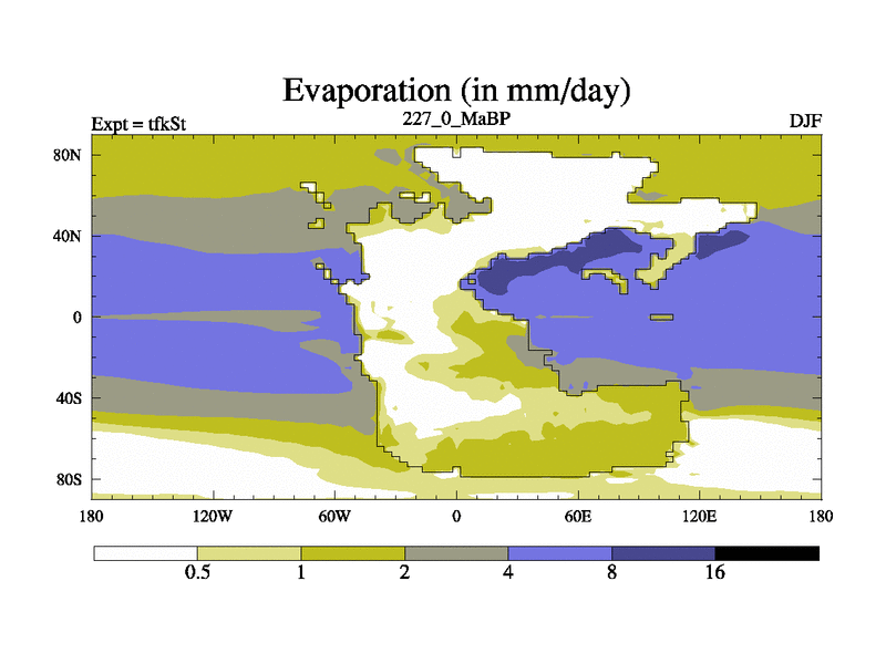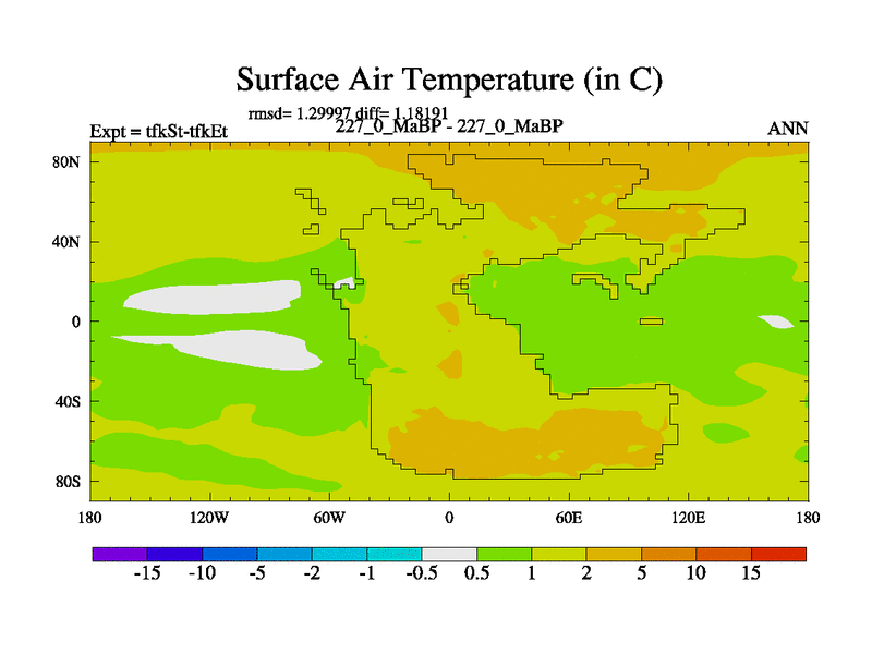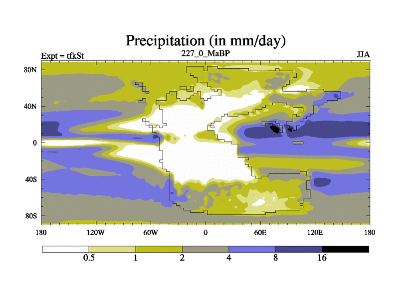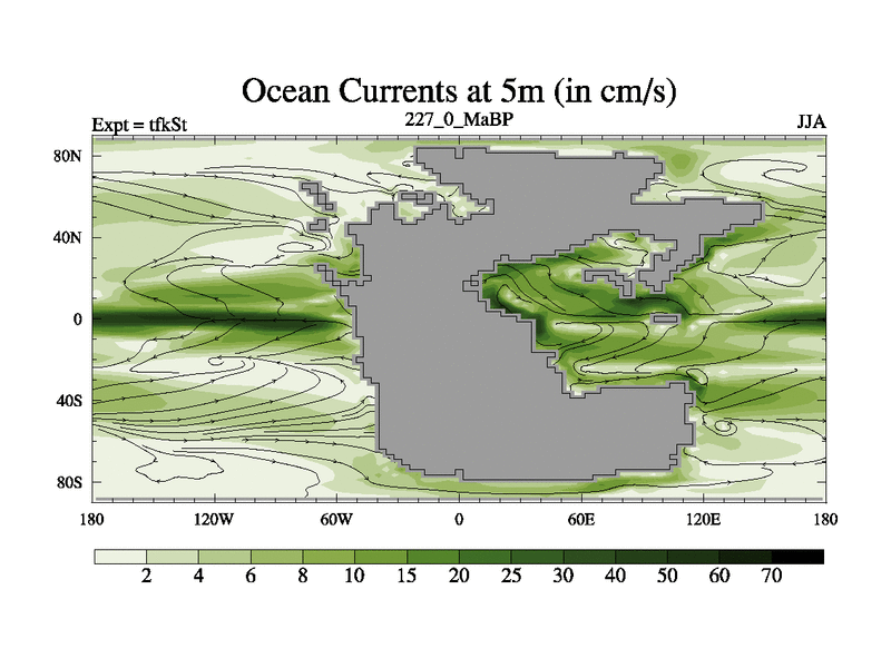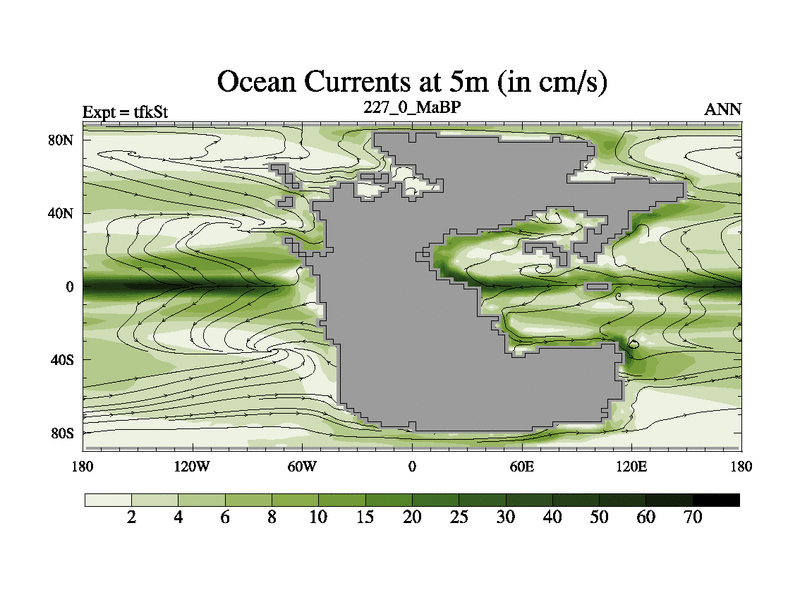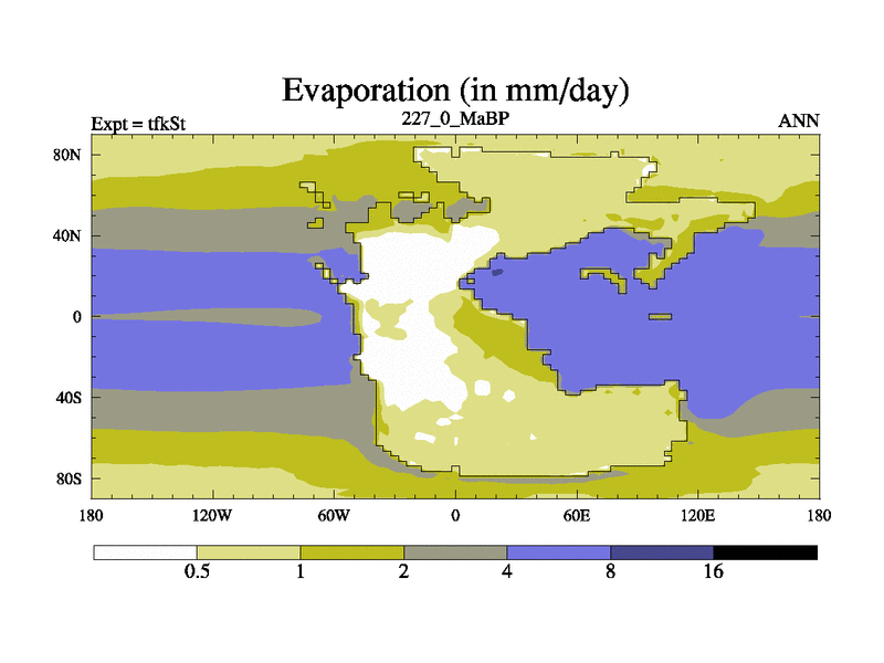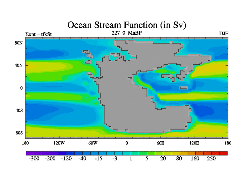 This is the 227.0 Ma simulation using the Scotese palaeogeographies and revised CCN etc. This version has islands and smoothing and desert albedo included. Tuned CO2 to give Scotese temperatures. Started from end of tfkEt.