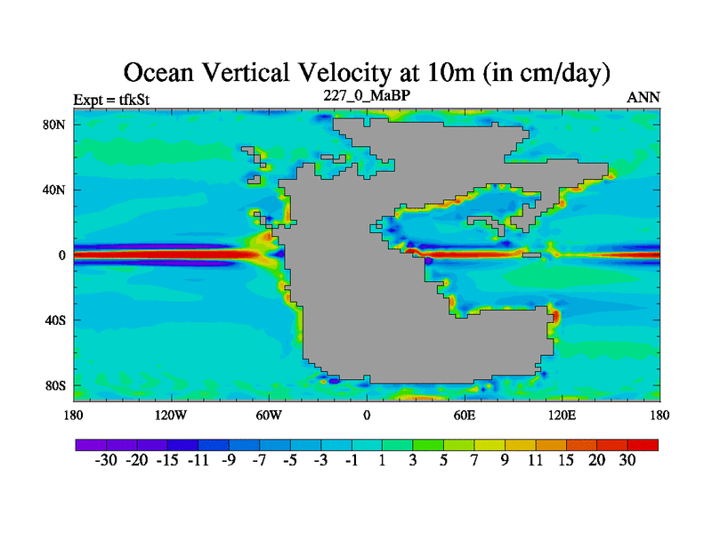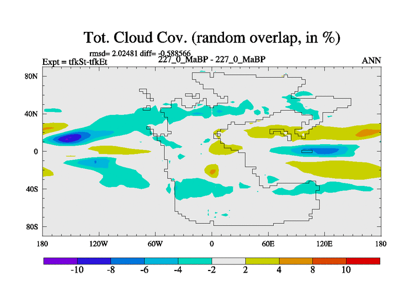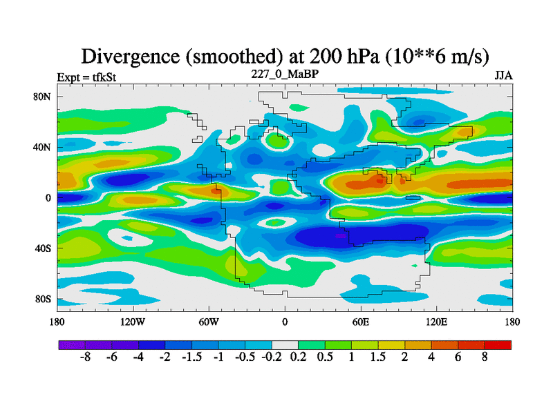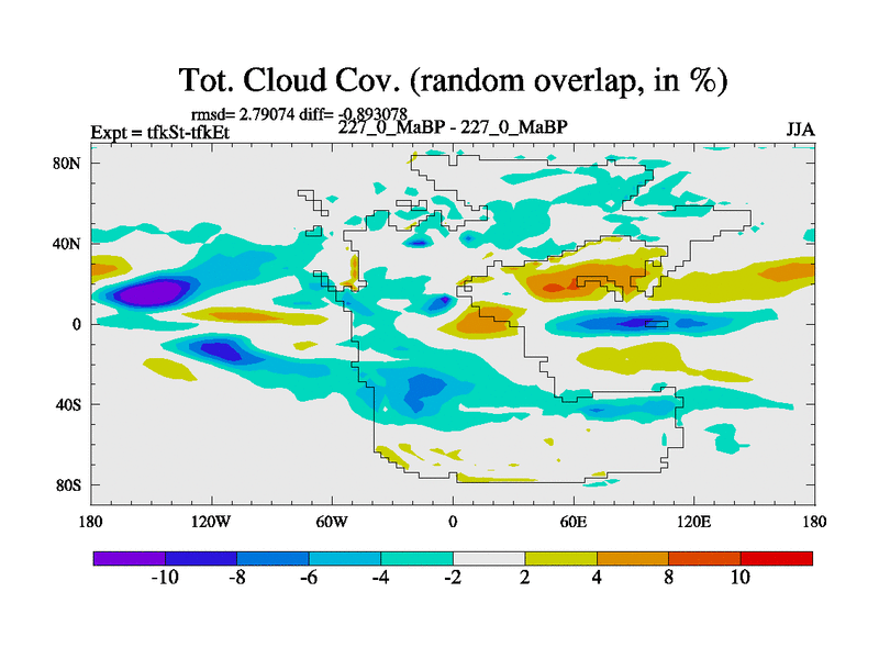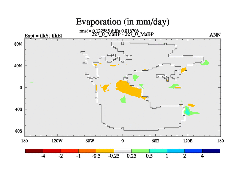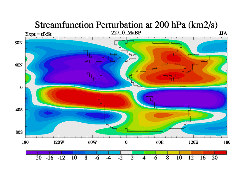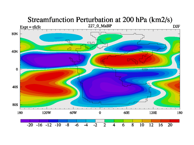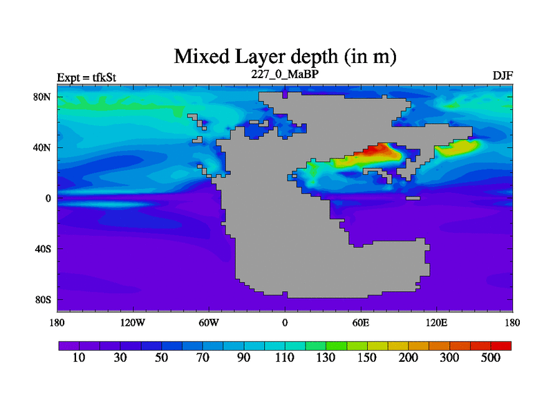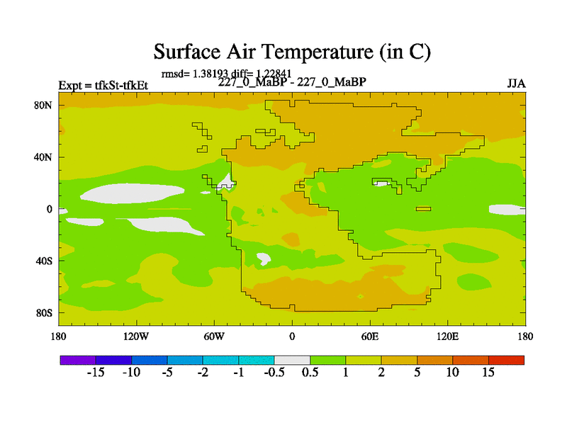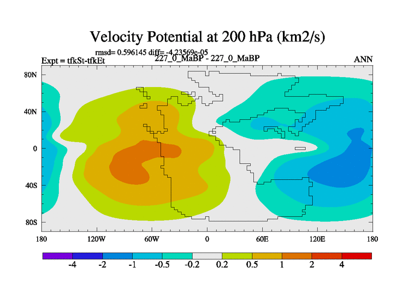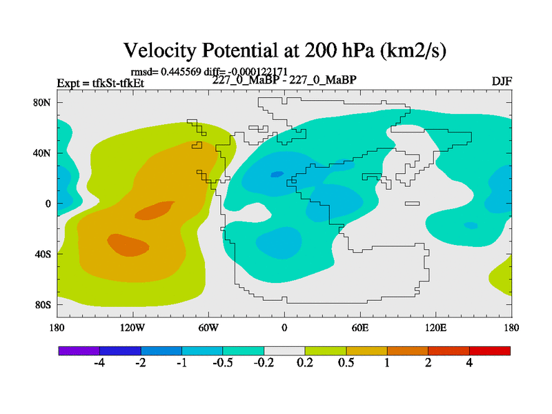 This is the 227.0 Ma simulation using the Scotese palaeogeographies and revised CCN etc. This version has islands and smoothing and desert albedo included. Tuned CO2 to give Scotese temperatures. Started from end of tfkEt.