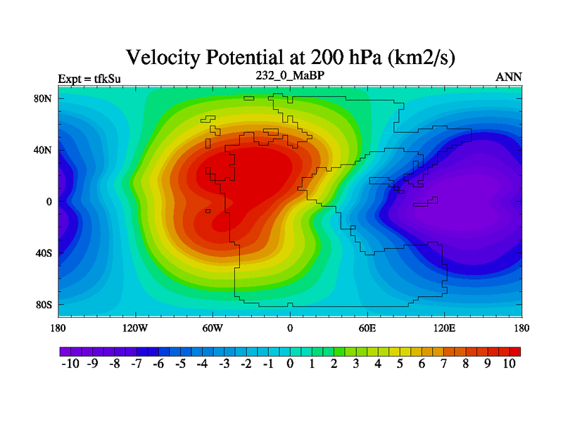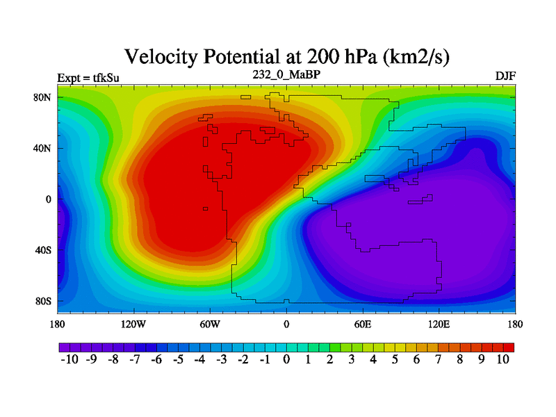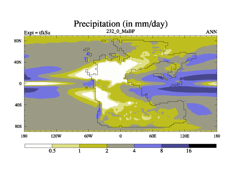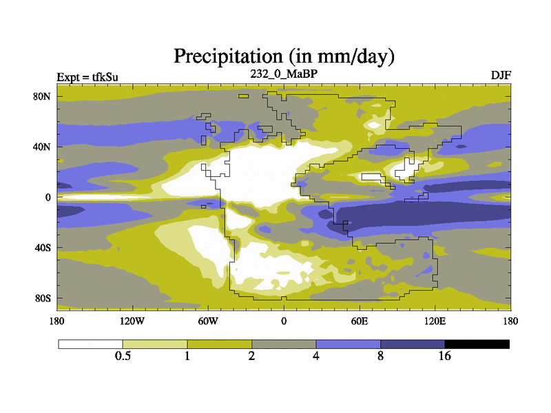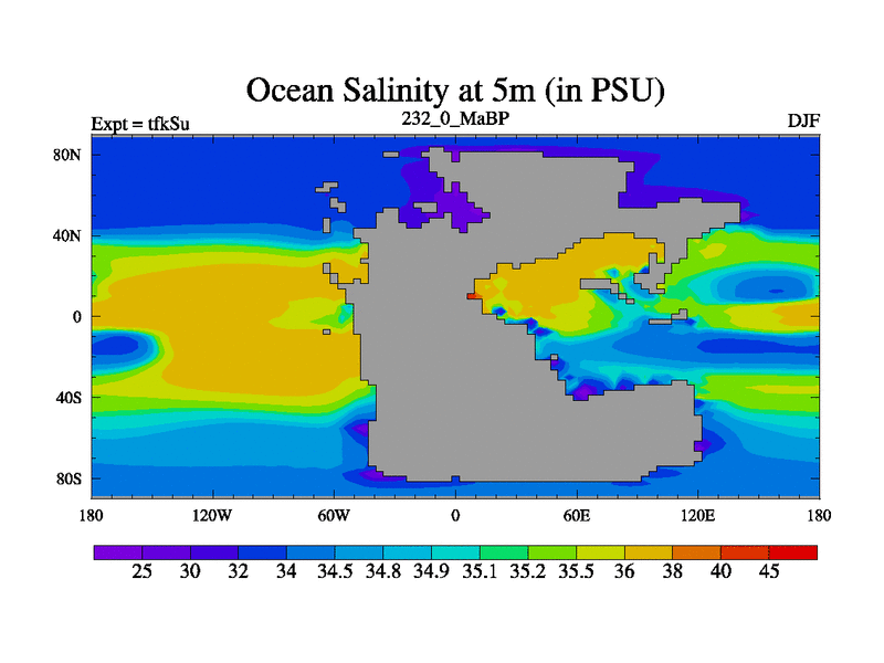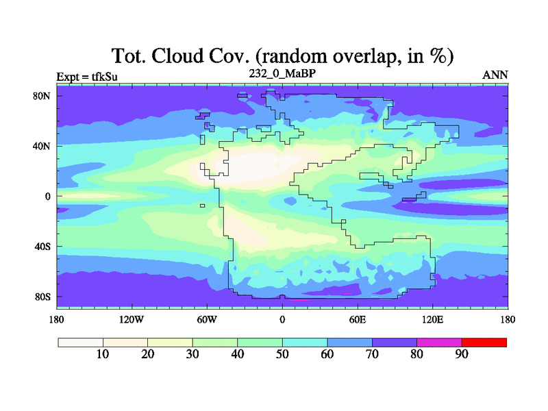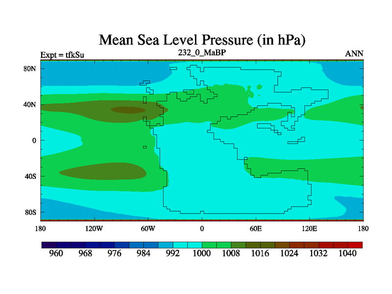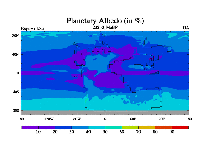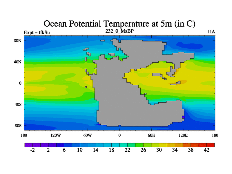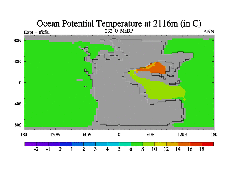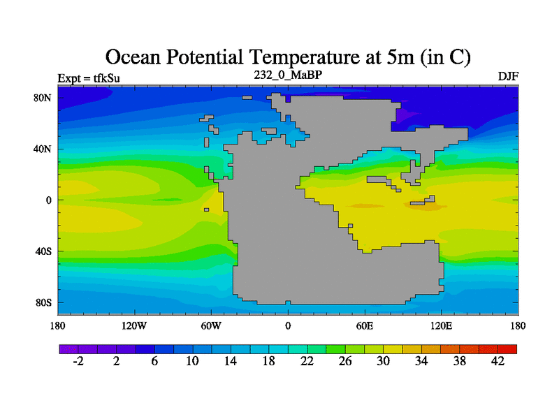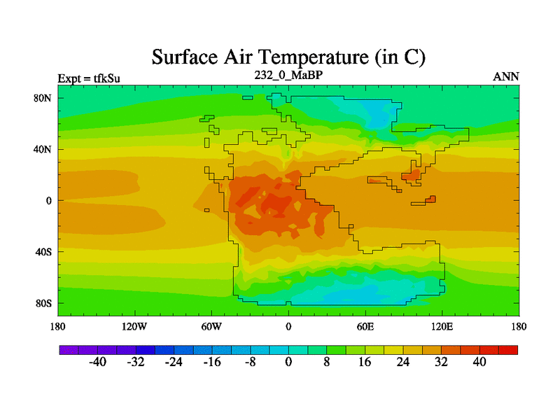 This is the 232.0 Ma simulation using the Scotese palaeogeographies and revised CCN etc. This version has islands and smoothing and desert albedo included. Tuned CO2 to give Scotese temperatures. Started from end of tfkEu.