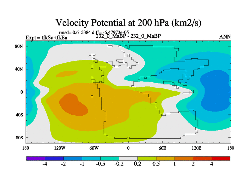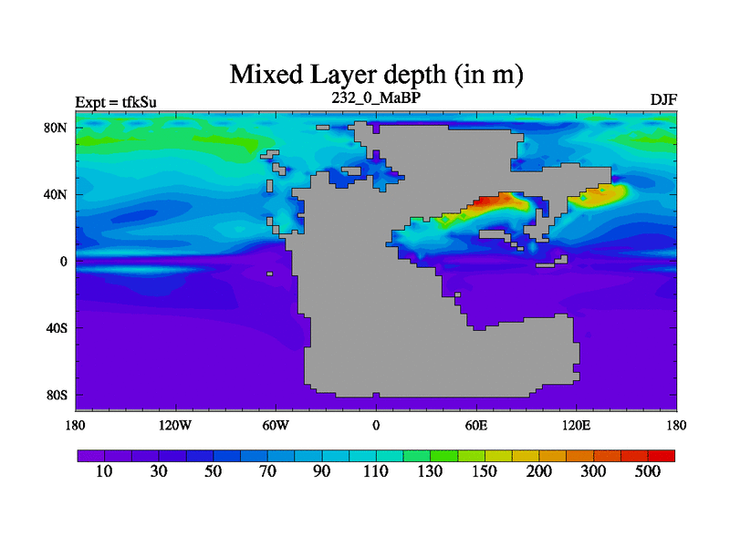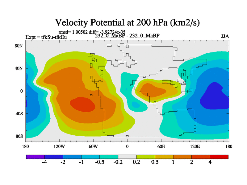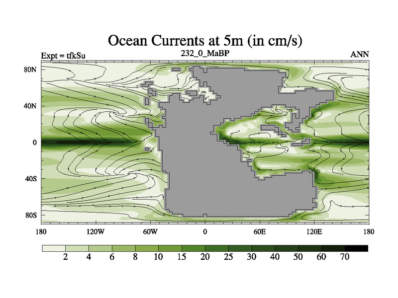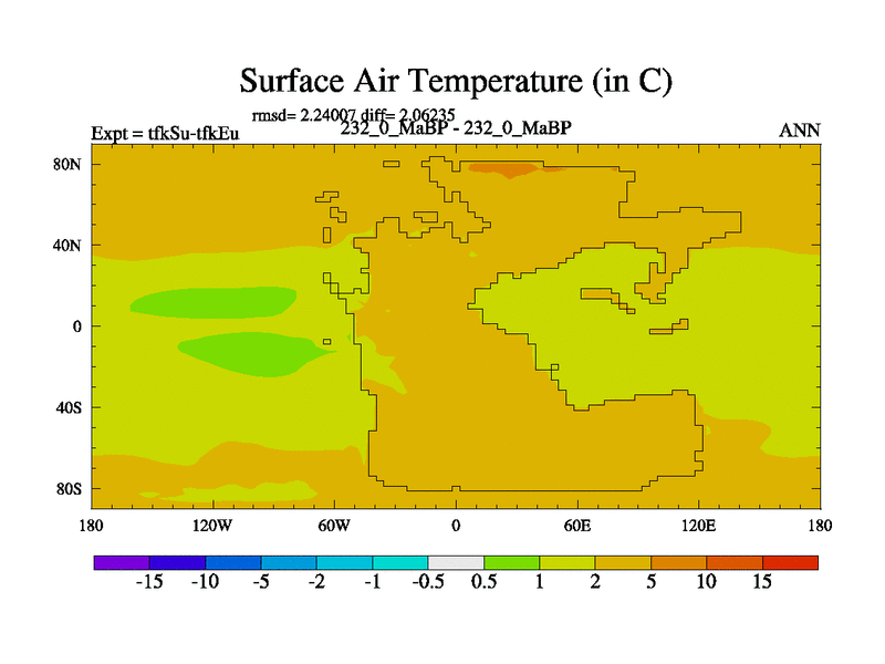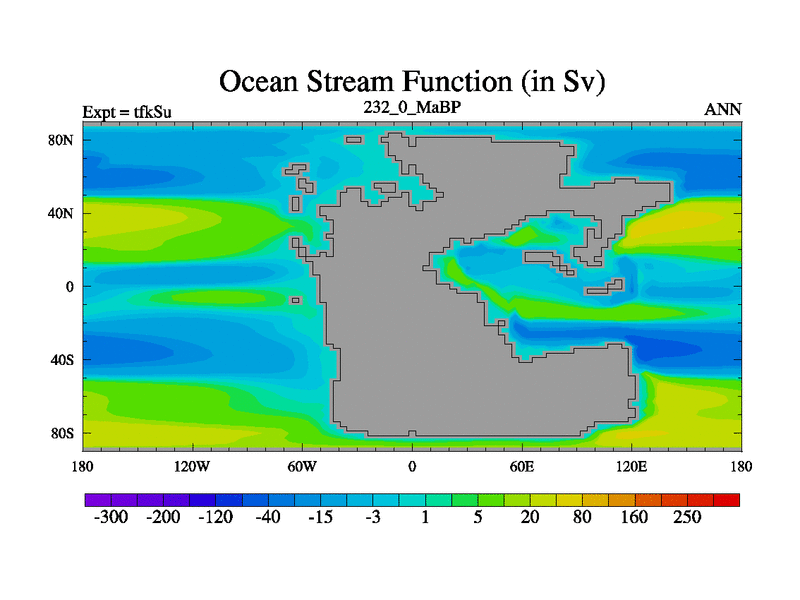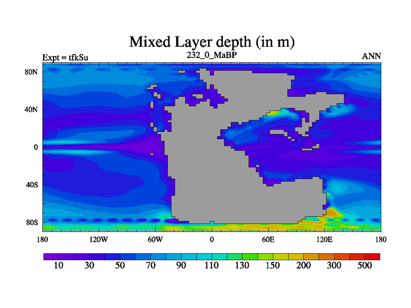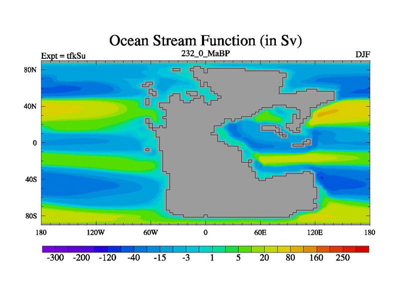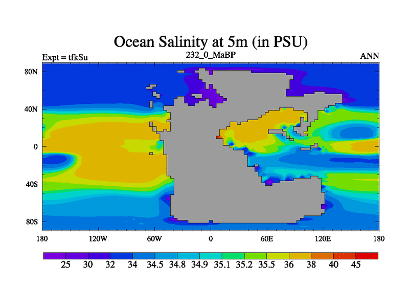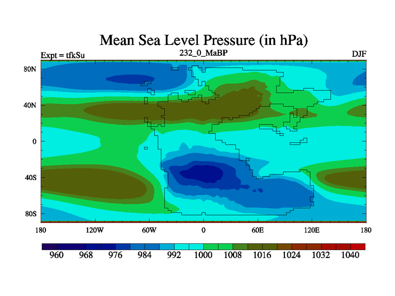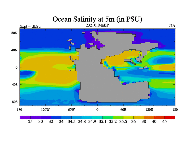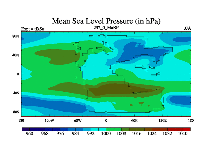 This is the 232.0 Ma simulation using the Scotese palaeogeographies and revised CCN etc. This version has islands and smoothing and desert albedo included. Tuned CO2 to give Scotese temperatures. Started from end of tfkEu.