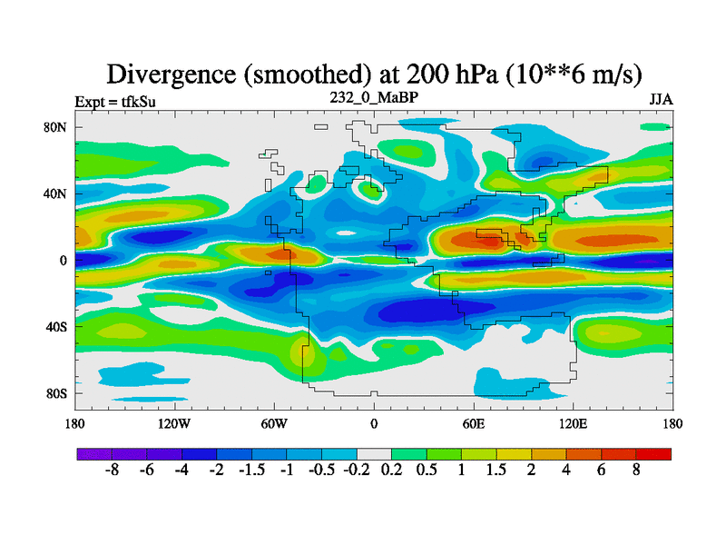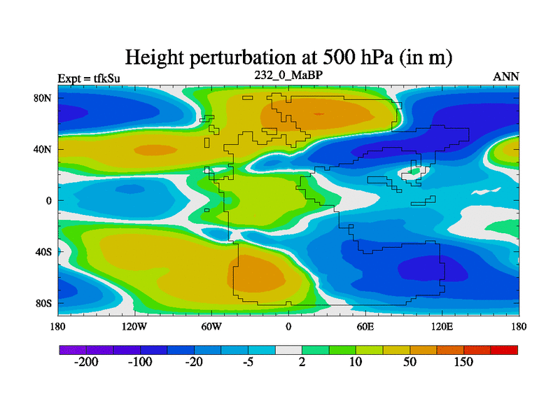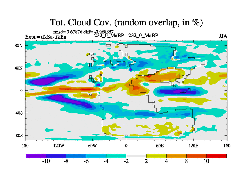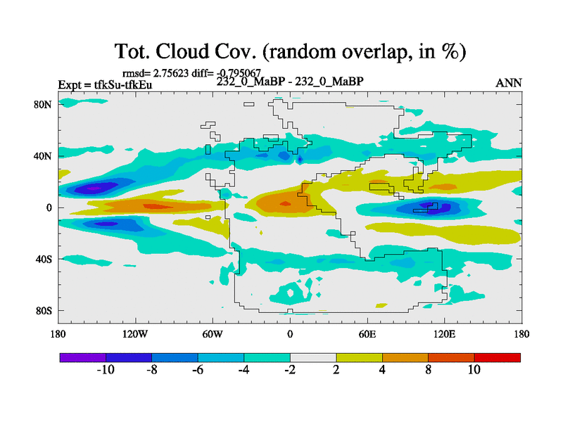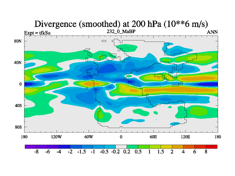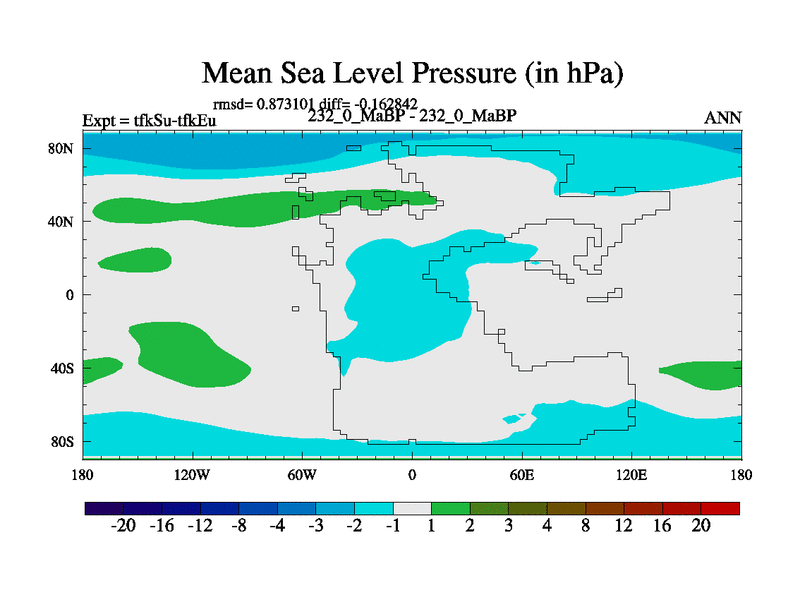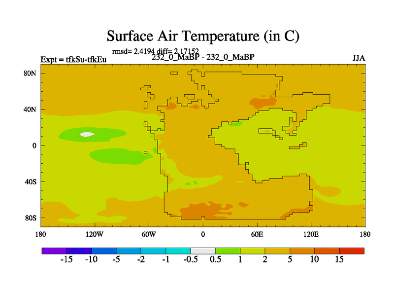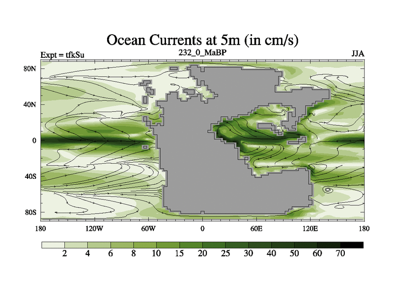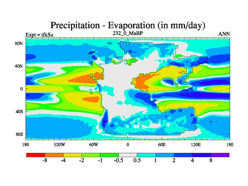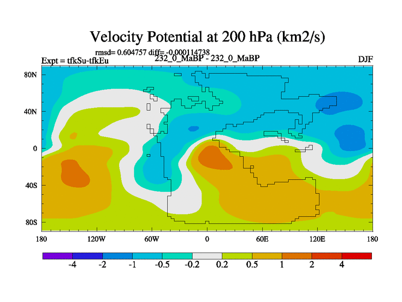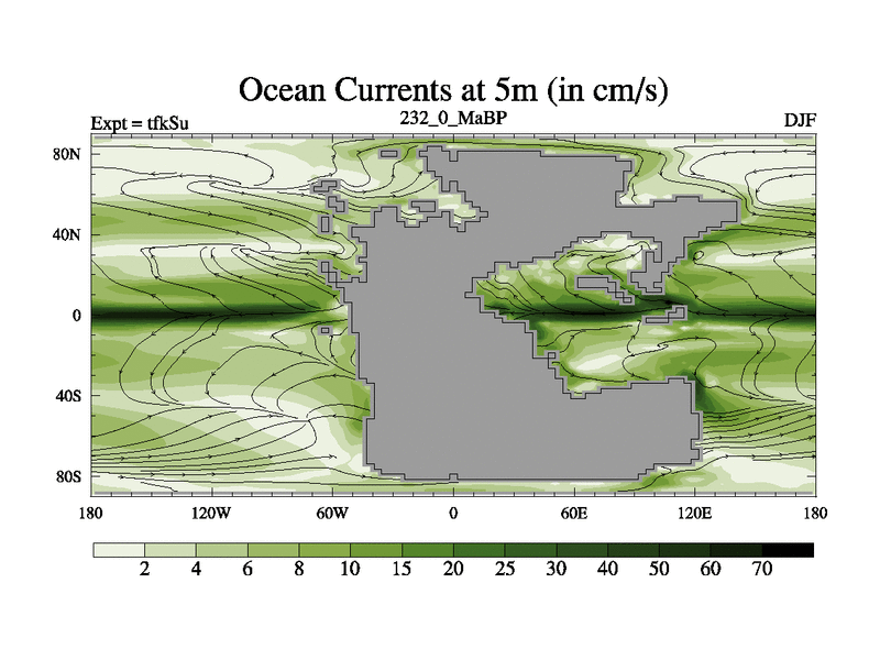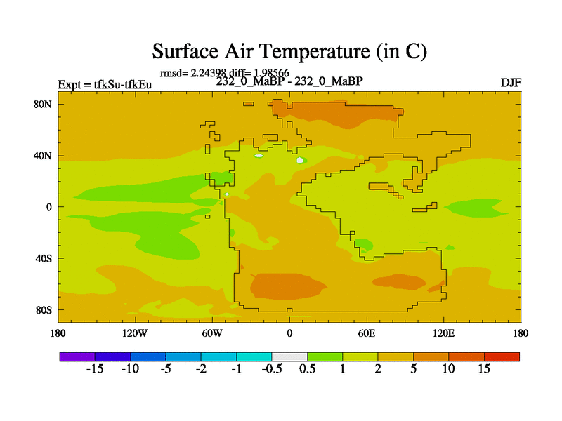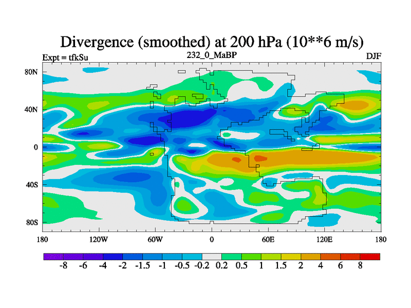 This is the 232.0 Ma simulation using the Scotese palaeogeographies and revised CCN etc. This version has islands and smoothing and desert albedo included. Tuned CO2 to give Scotese temperatures. Started from end of tfkEu.