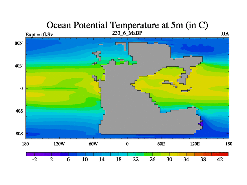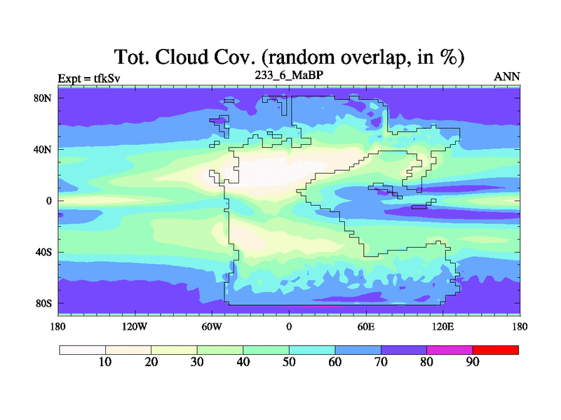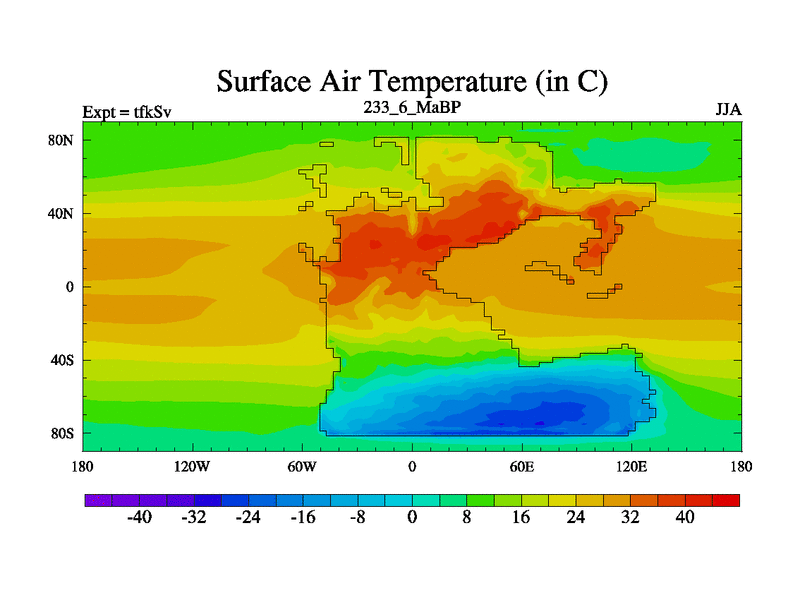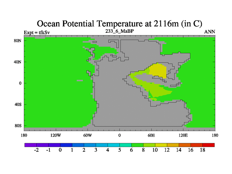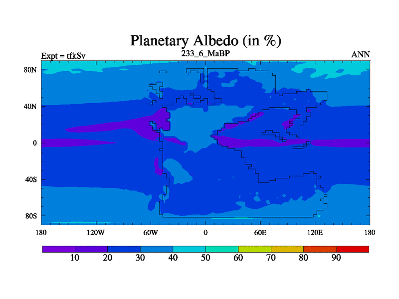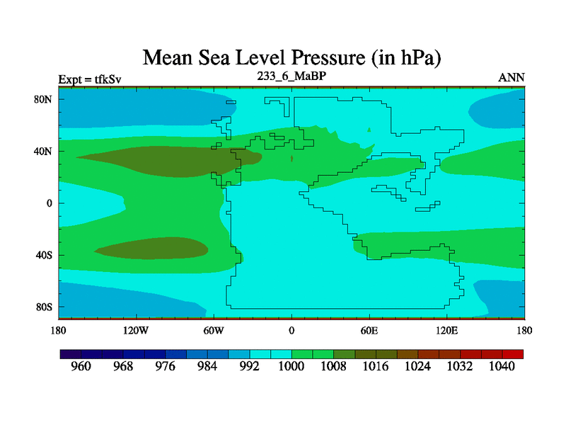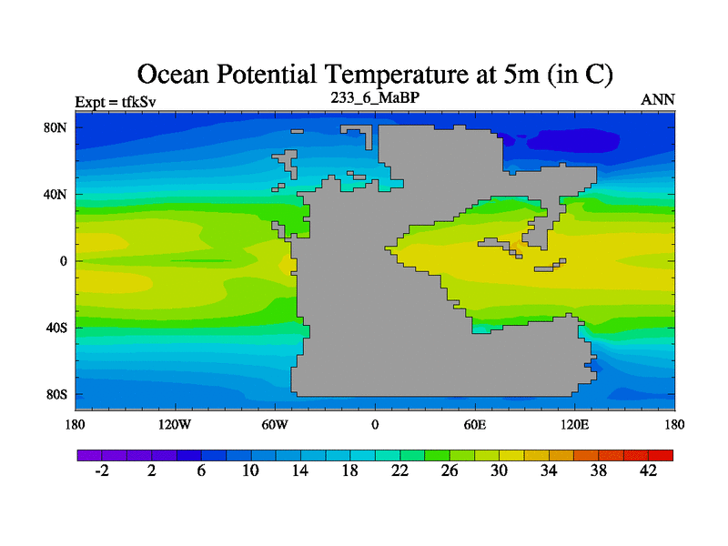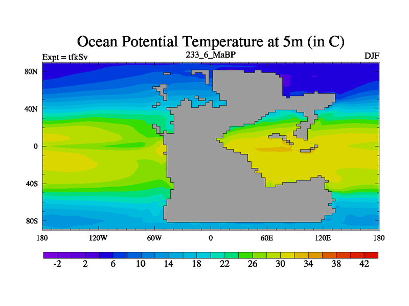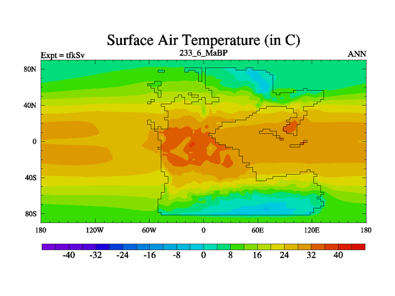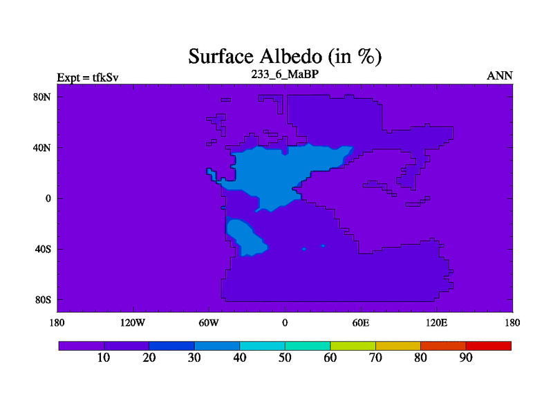 This is the 233.6 Ma simulation using the Scotese palaeogeographies and revised CCN etc. This version has islands and smoothing and desert albedo included. Tuned CO2 to give Scotese temperatures. Started from end of tfkEv.