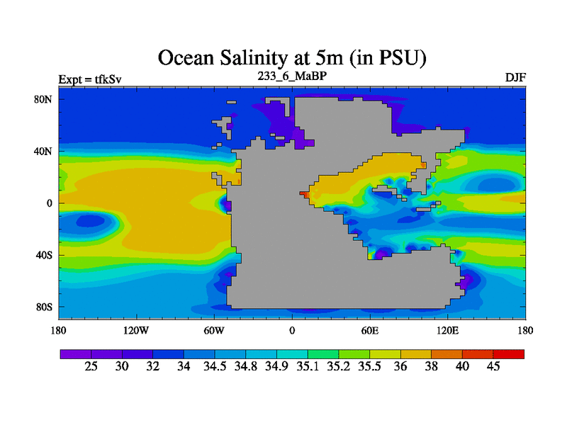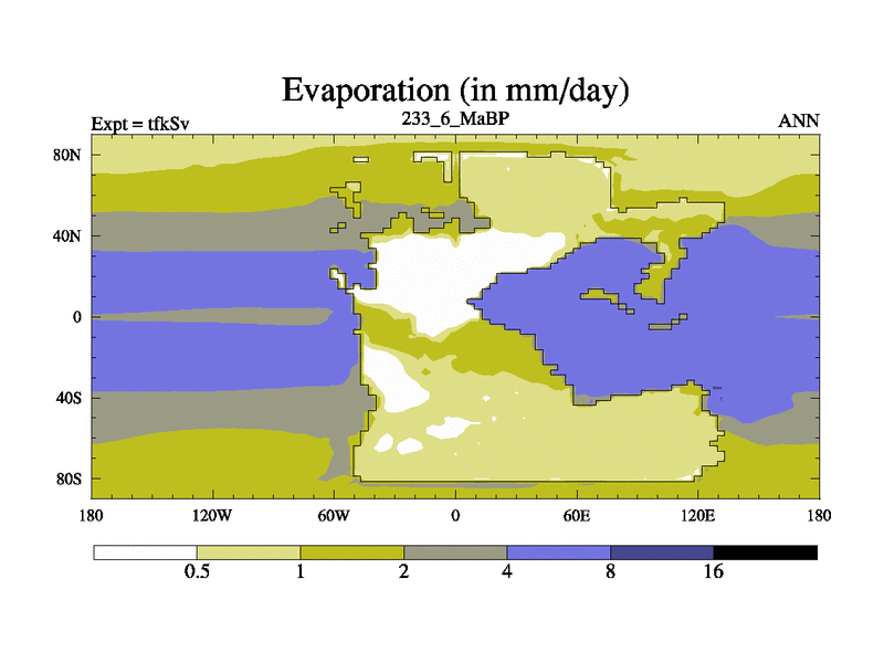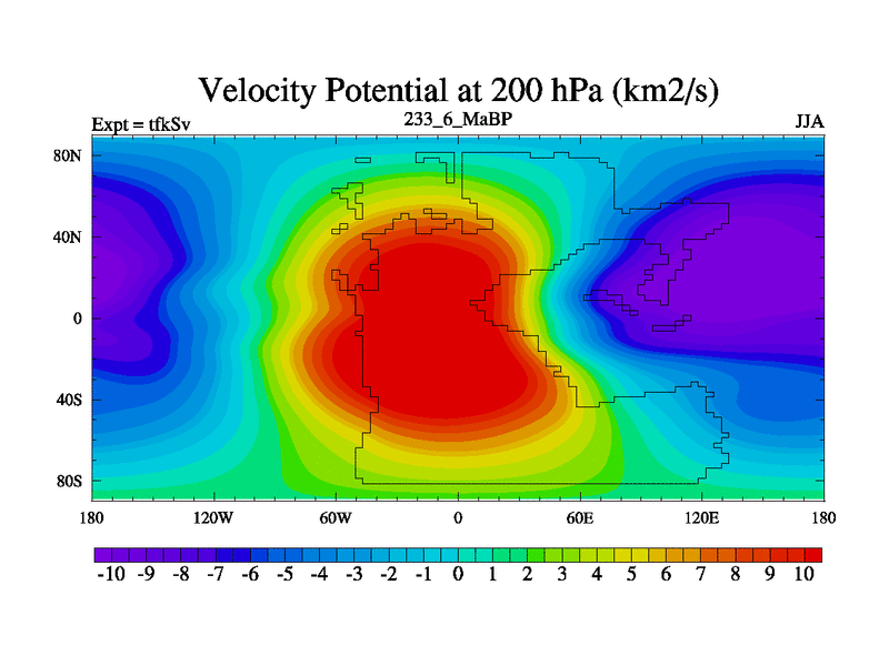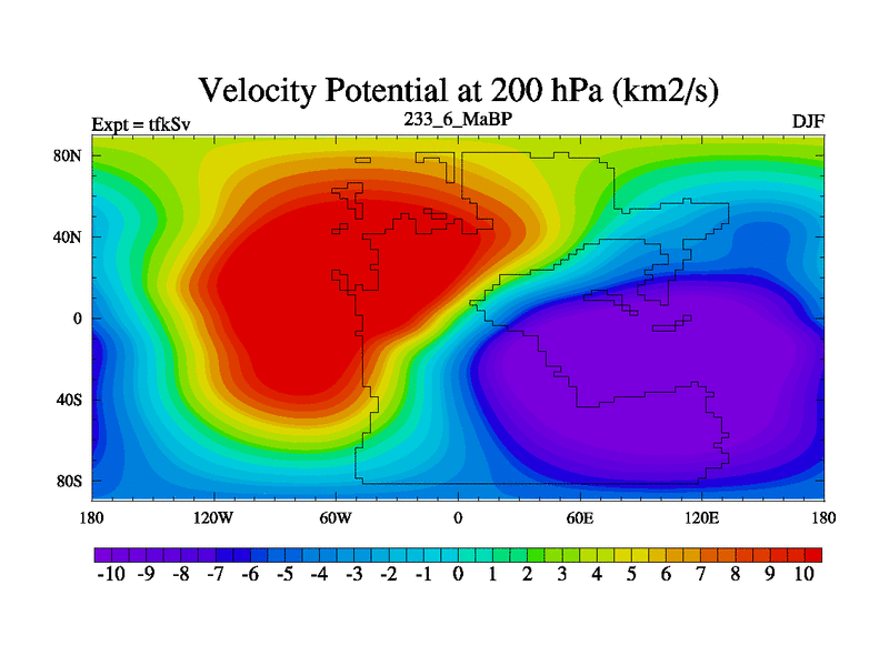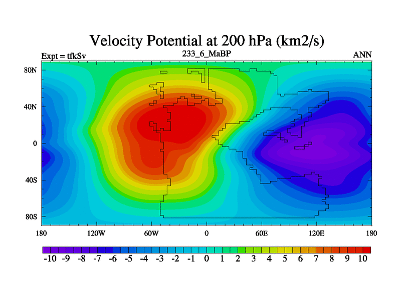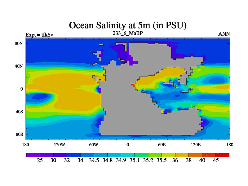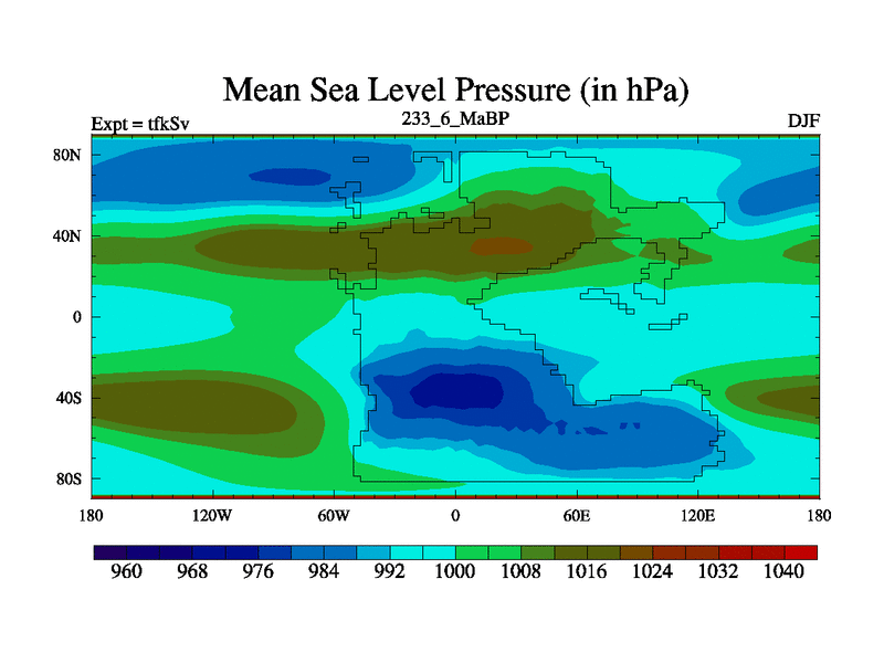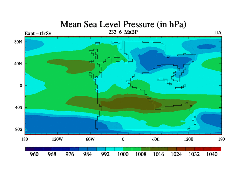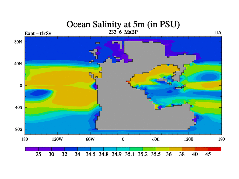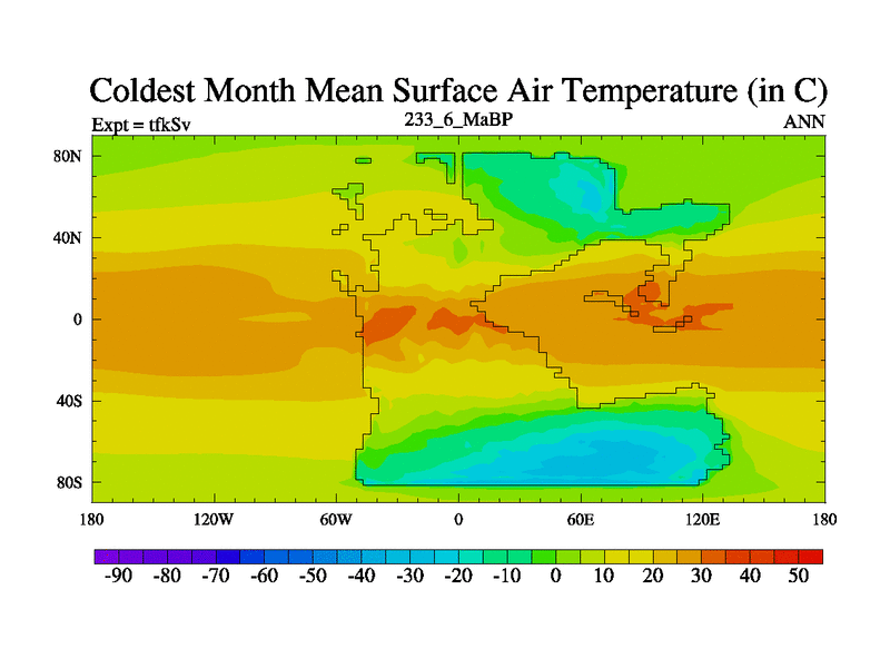 This is the 233.6 Ma simulation using the Scotese palaeogeographies and revised CCN etc. This version has islands and smoothing and desert albedo included. Tuned CO2 to give Scotese temperatures. Started from end of tfkEv.
