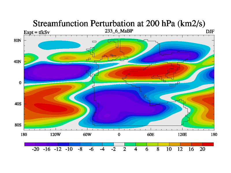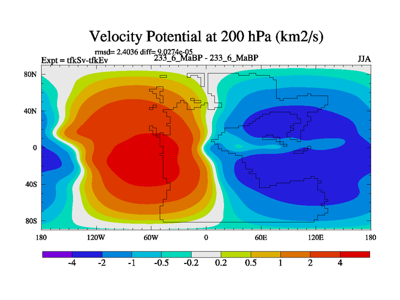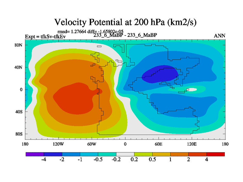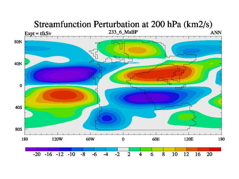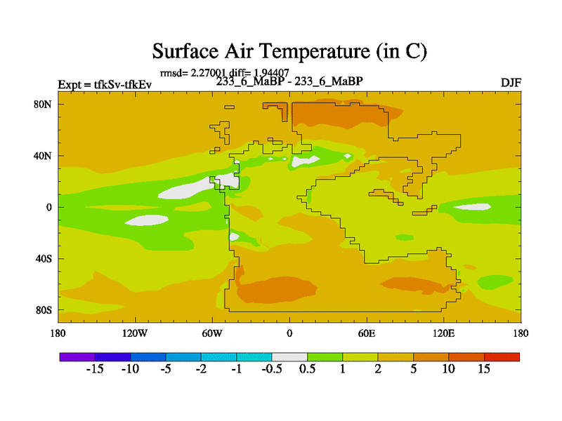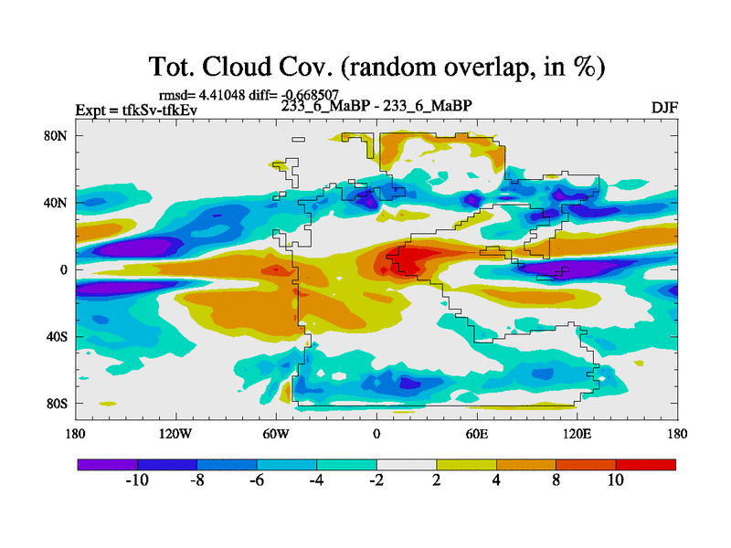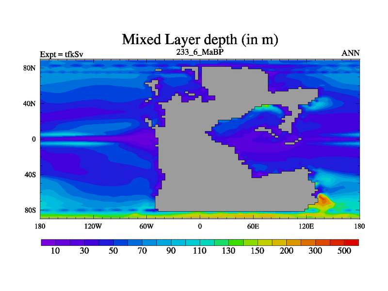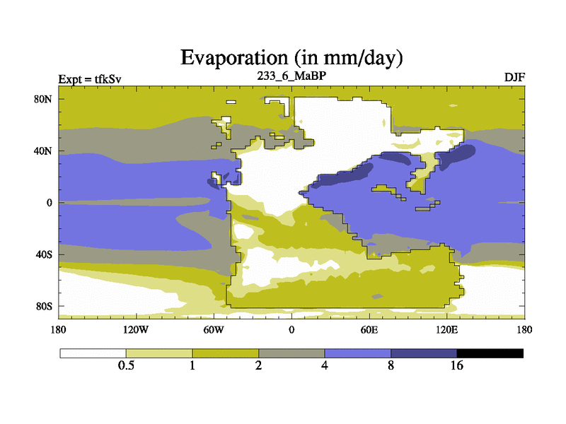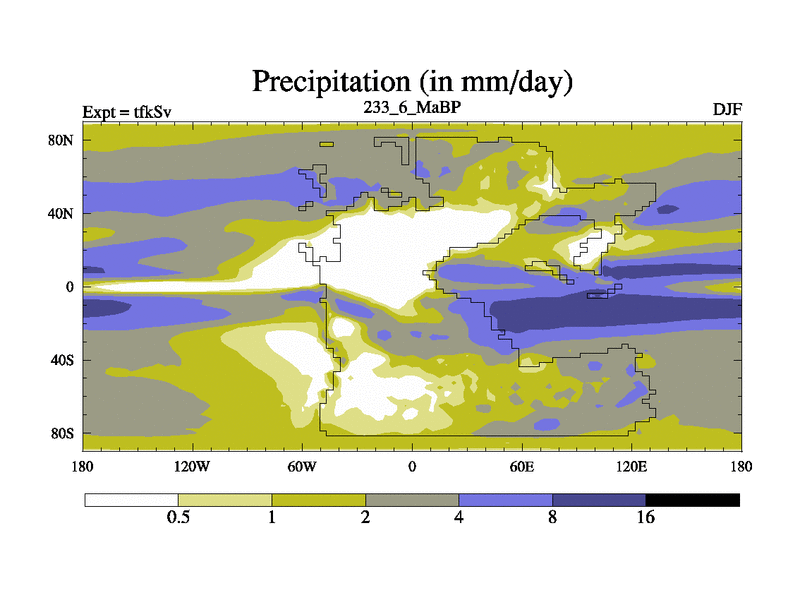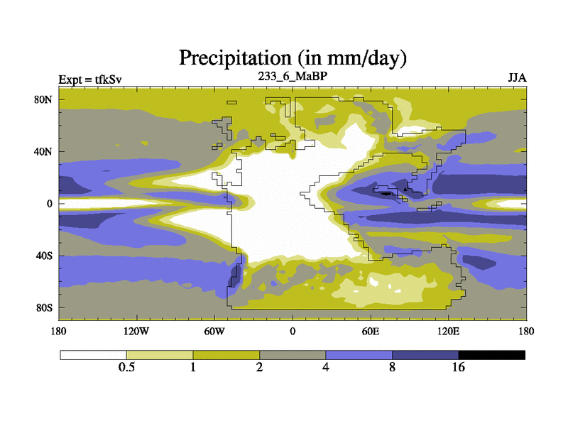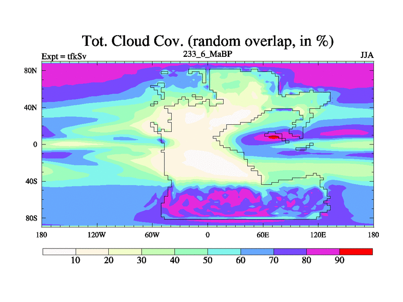 This is the 233.6 Ma simulation using the Scotese palaeogeographies and revised CCN etc. This version has islands and smoothing and desert albedo included. Tuned CO2 to give Scotese temperatures. Started from end of tfkEv.