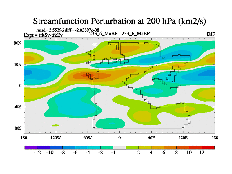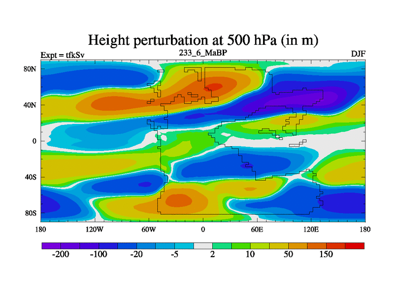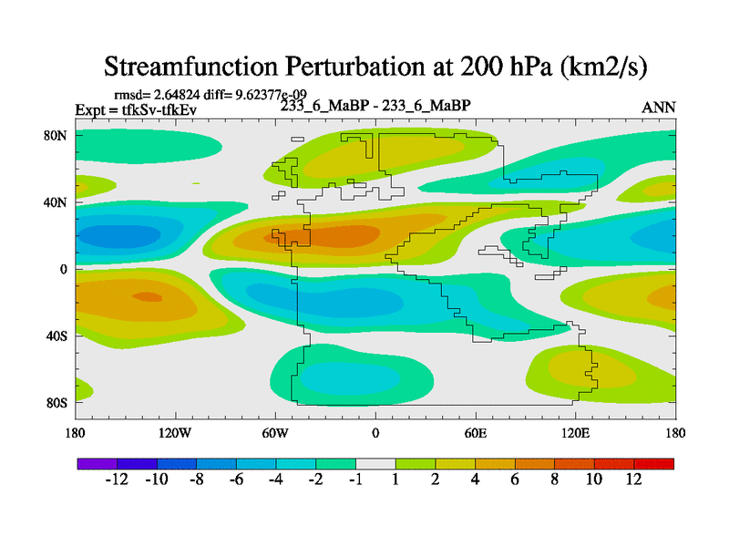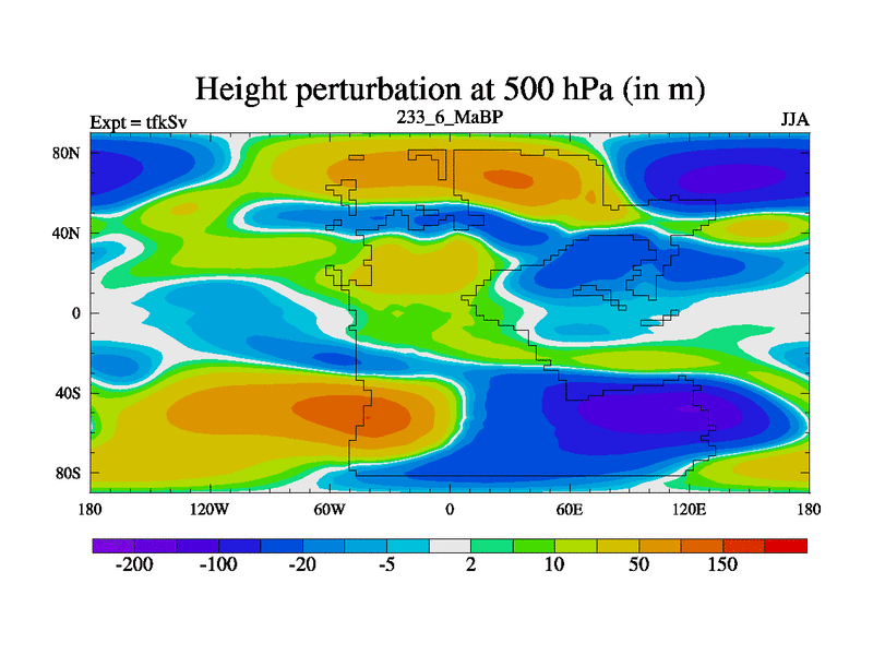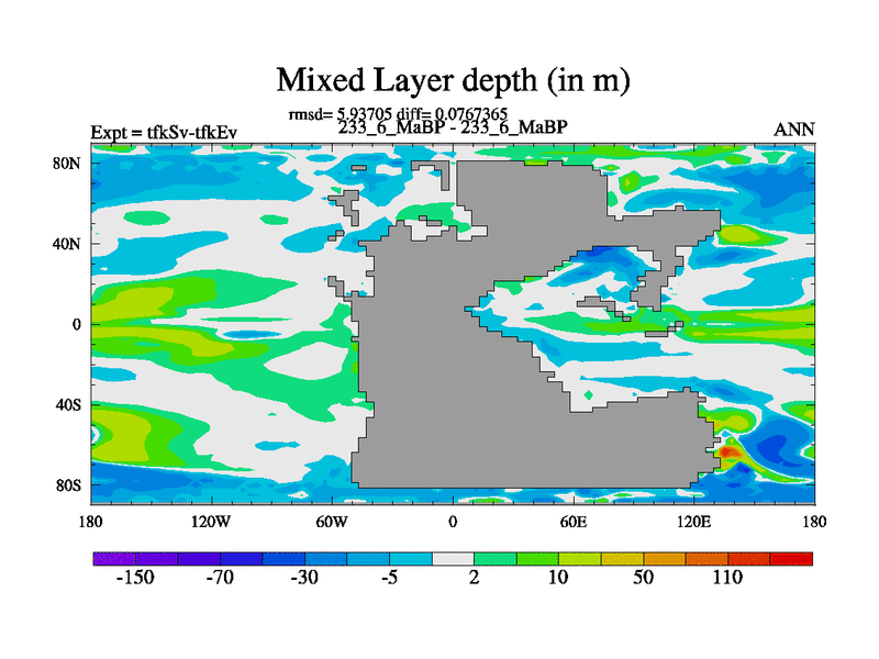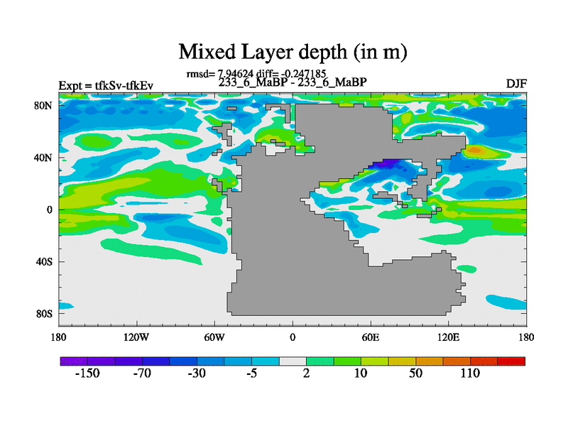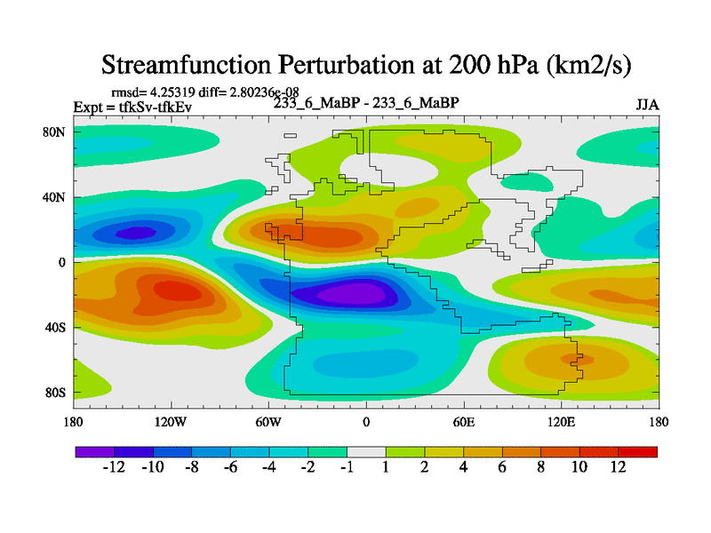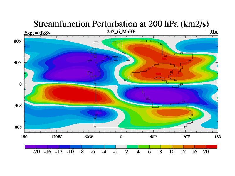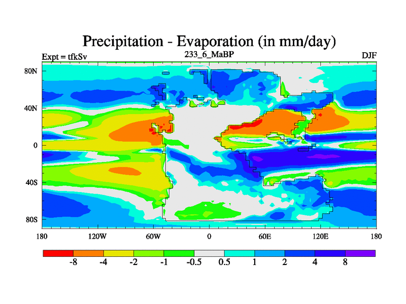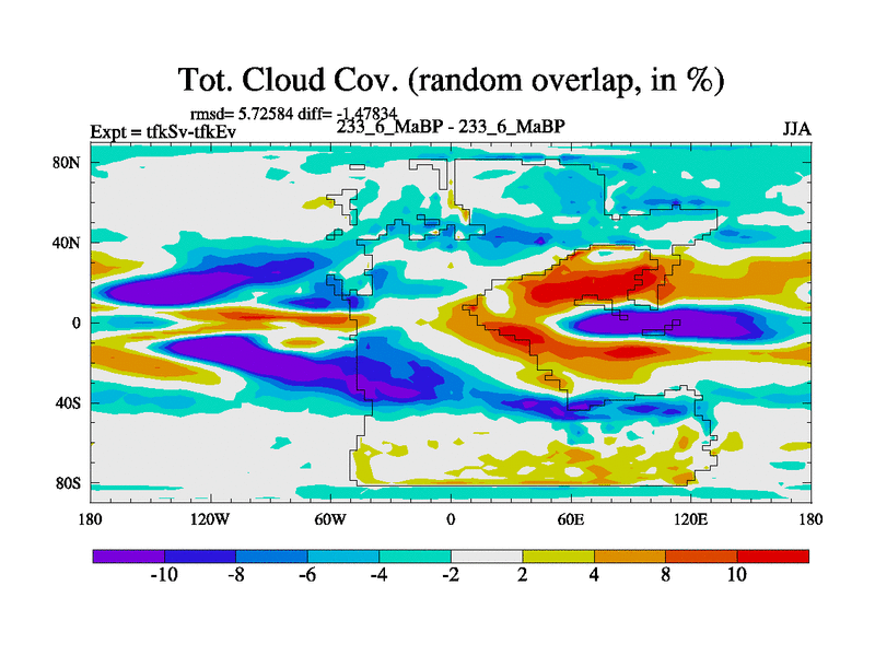 This is the 233.6 Ma simulation using the Scotese palaeogeographies and revised CCN etc. This version has islands and smoothing and desert albedo included. Tuned CO2 to give Scotese temperatures. Started from end of tfkEv.